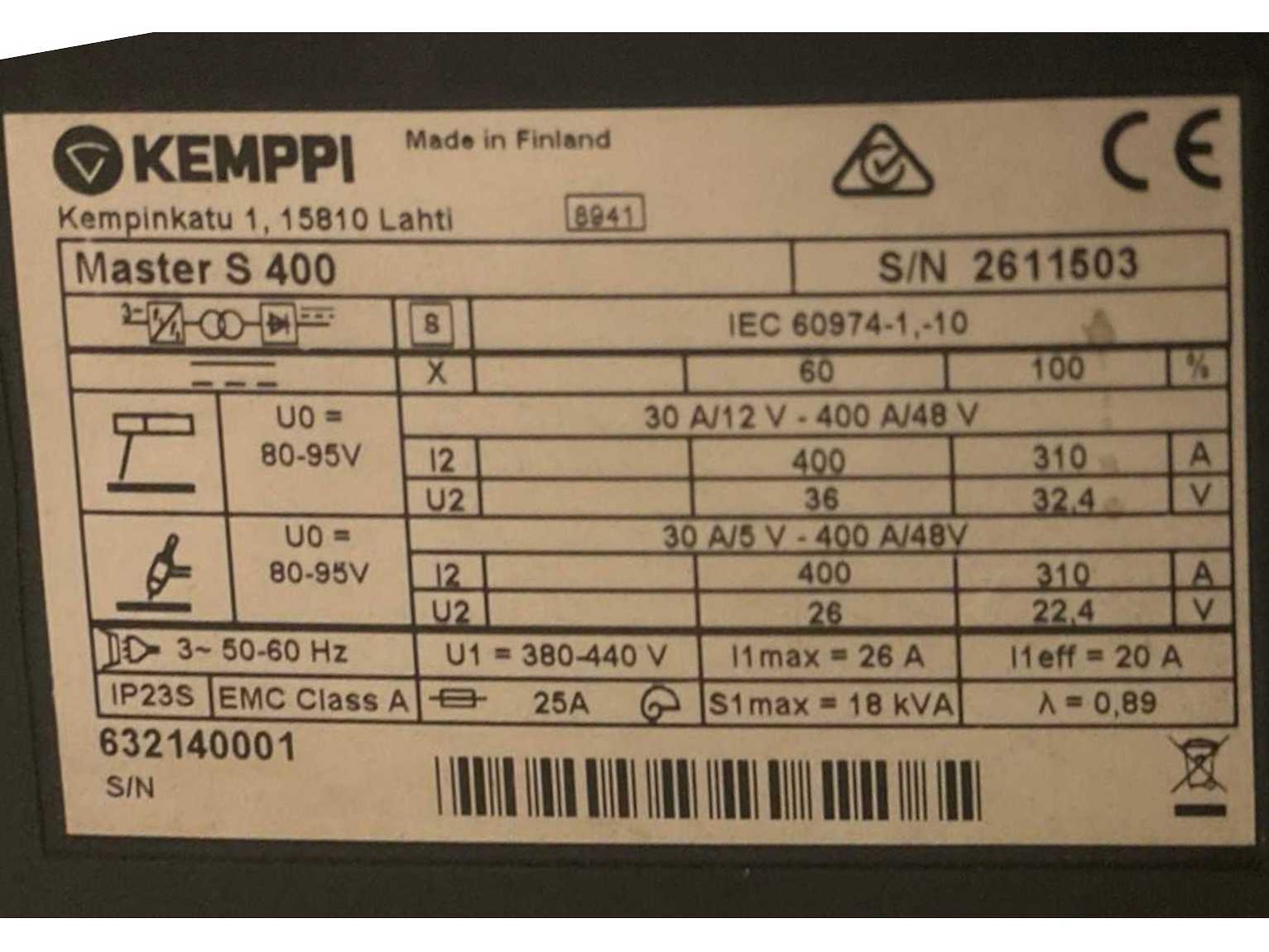 Compact; lichtgewicht; zonder lastoorts en leiding; working condition not verified; Merk: Kemppi Type: Master S400 Afmeting h: 350mm Afmeting b: 280mm Afmeting l: 600mm Aansluiting: 400V Electrode type: true Tig type: true