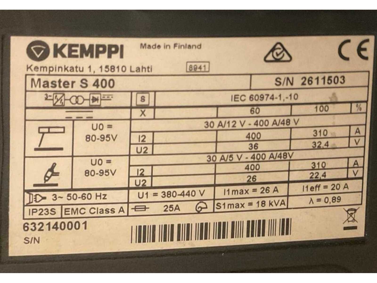 Compact; lichtgewicht; zonder lastoorts en leiding; working condition not verified Merk: Kemppi Type: Master S400 Afmeting h: 350mm Afmeting b: 280mm Afmeting l: 600mm Aansluiting: 400V Electrode type: true Tig type: true