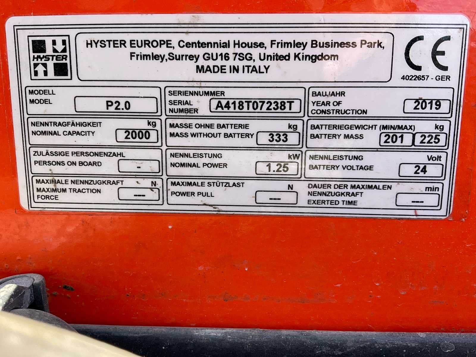 Interne acculader; not working. Merk: BT Type: P2.0 Bouwjaar: 2019 Serienummer: A418T07238T Hefvermogen: 2000kg Lepellengte: 1150mm Eigen gewicht: 790kg Totale afmeting L: 1700mm Totale afmeting Breedte: 750mm Totale afmeting Hoogte: 1350mm