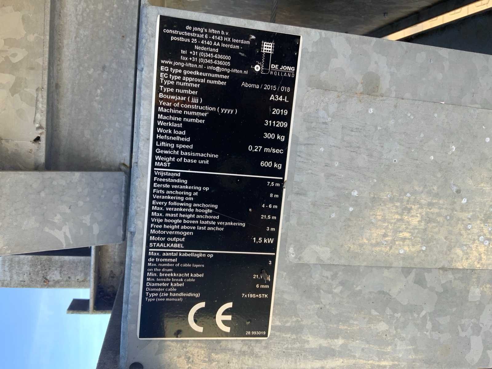Eerste foto ter illustratie; working condition not verified; Merk: De Jong Type: A34-L Bouwjaar: 2019 Staalkabel: true Max. belasting: 300kg Hefhoogte: 7m Plateau afm. l: 1600mm Plateau afm. b: 800mm Motorvermogen (kW): 1.5kW Totale afmeting L: 8000mm