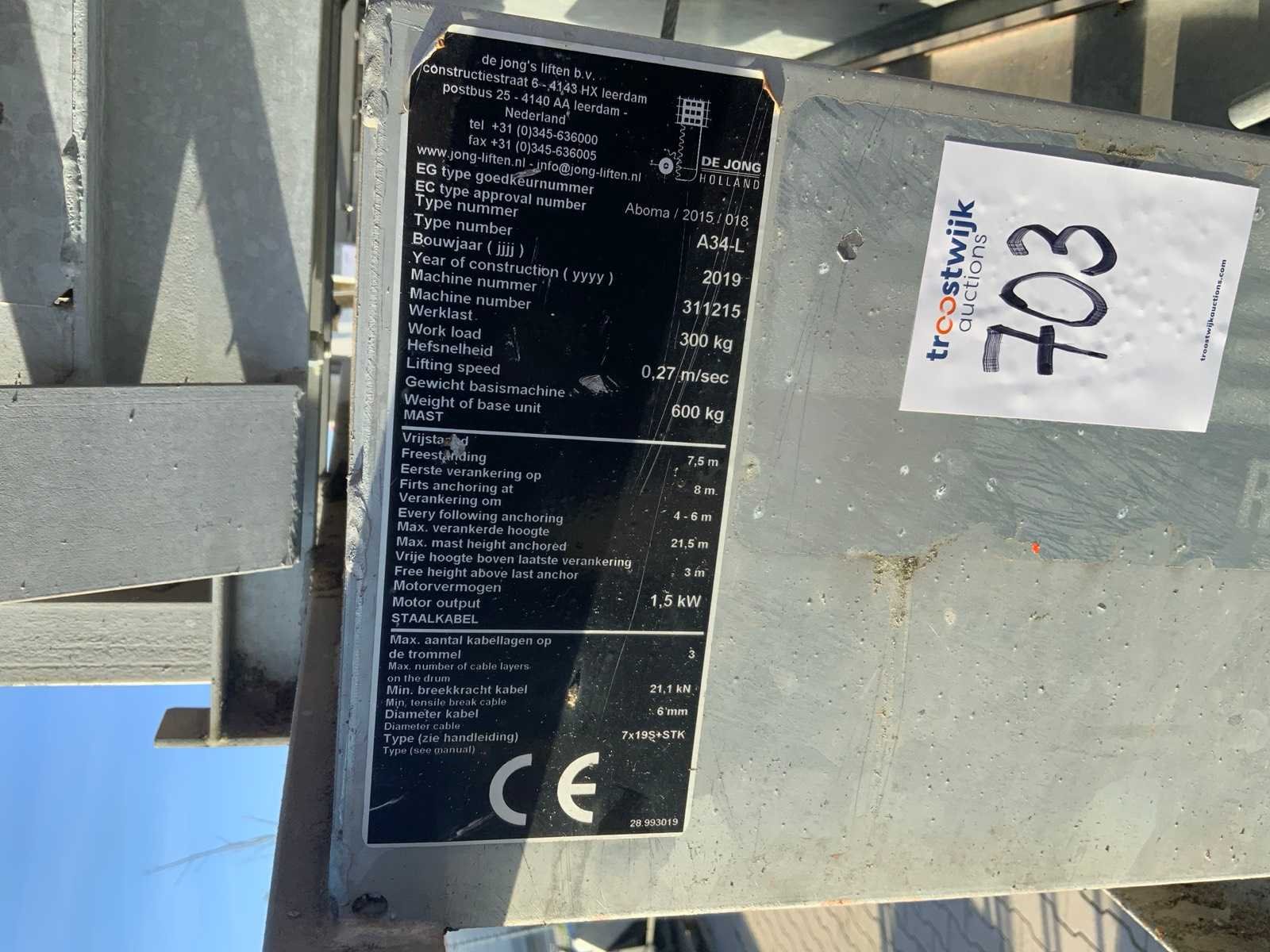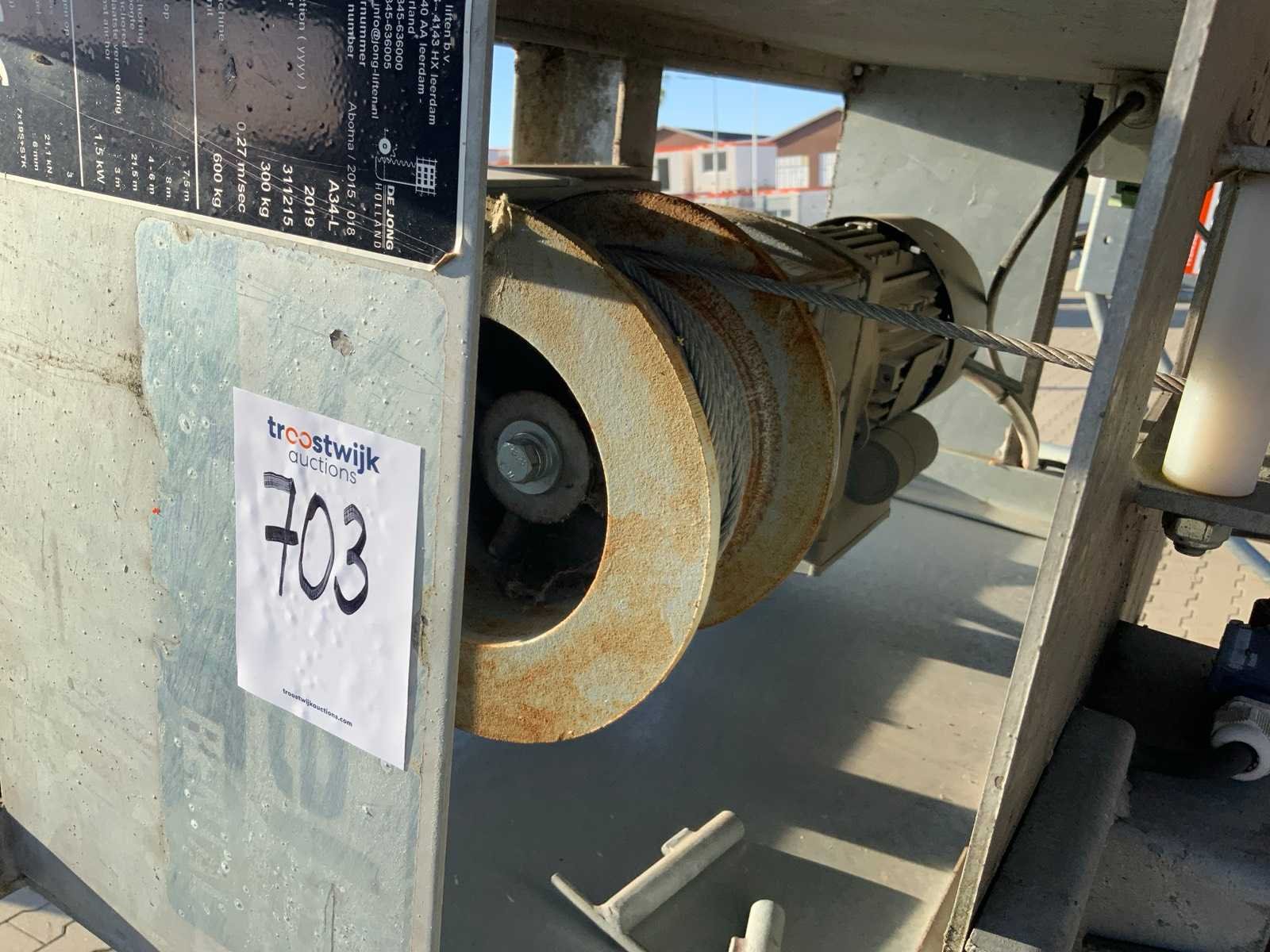 Eerste foto ter illustratie; working condition not verified; Merk: De Jong Type: A34-L Bouwjaar: 2019 Staalkabel: true Max. belasting: 300kg Hefhoogte: 7m Plateau afm. l: 1600mm Plateau afm. b: 800mm Motorvermogen (kW): 1.5kW Totale afmeting L: 8000mm