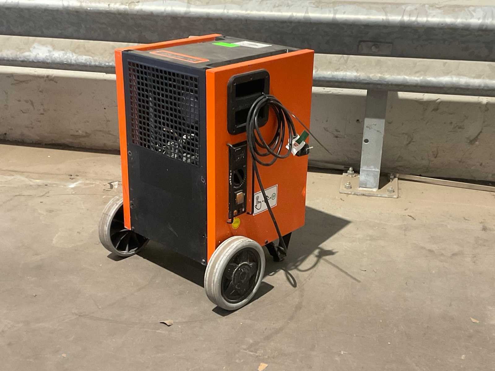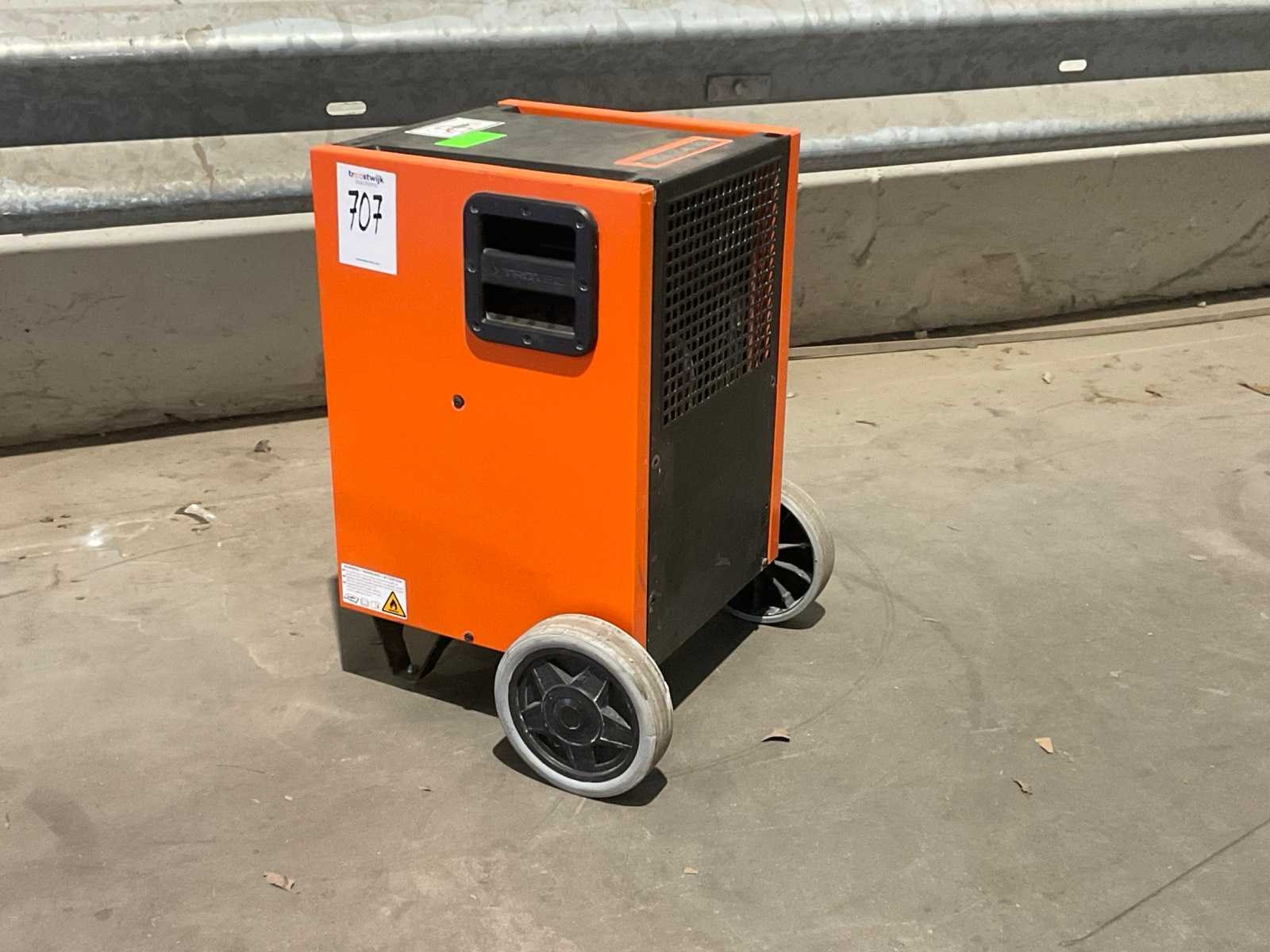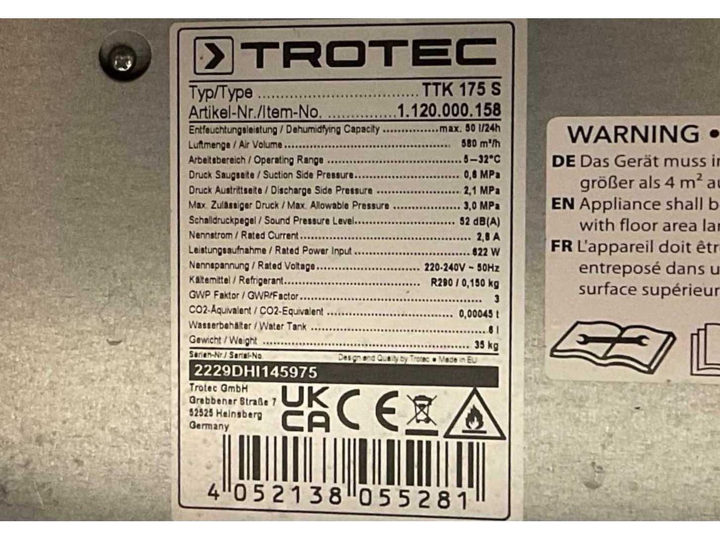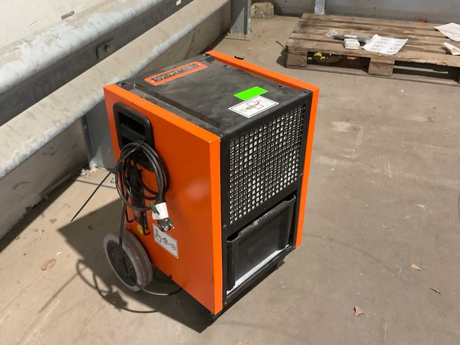 Luchtverplaatsing 300 m³ / uur; verrijdbaar; afgelezen urenstand 982 uur; 880 Watt; capaciteit 50 liter / 24 uur; working condition; Merk: Trotec Type: TTK 175 S Aansluiting: 230V Eigen gewicht: 35kg Totale afmeting L: 320mm Totale afmeting Breedte: 450mm Totale afmeting Hoogte: 500mm