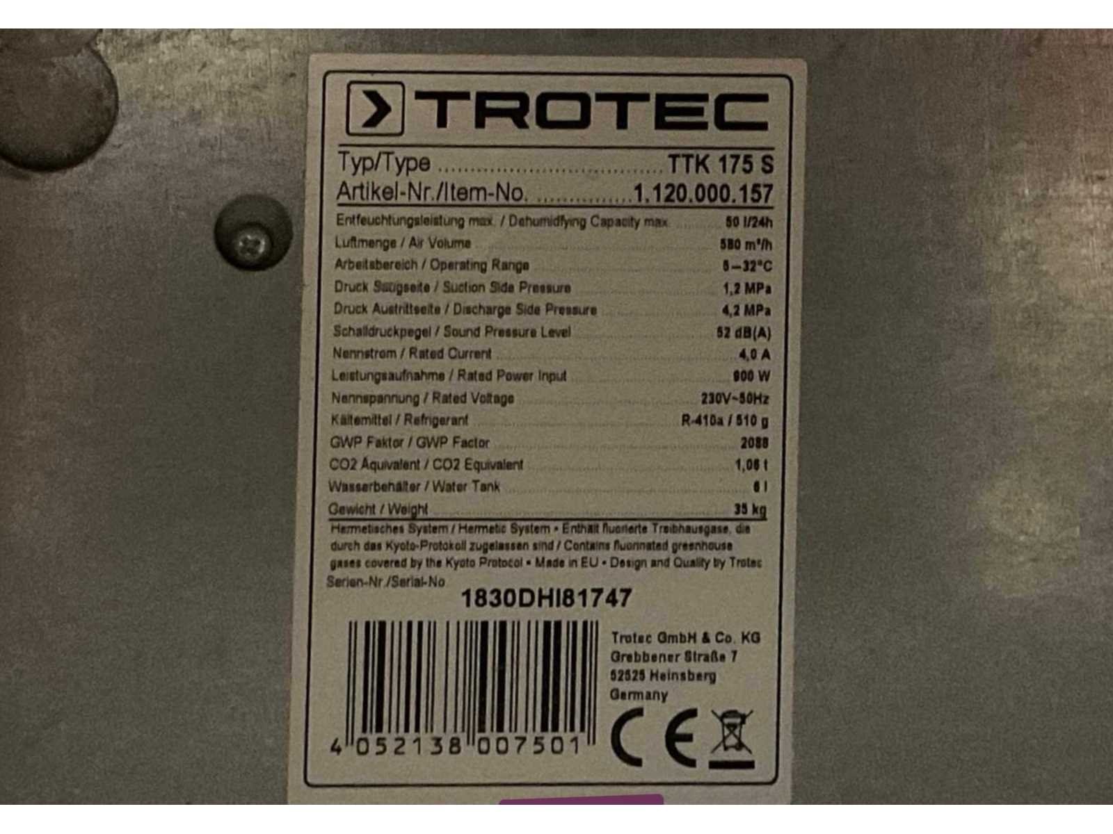 Luchtverplaatsing 300 m³ / uur; verrijdbaar; afgelezen urenstand 9212 uur; 880 Watt; capaciteit 50 liter / 24 uur; working condition; Merk: Trotec Type: TTK 175 S Aansluiting: 230V Eigen gewicht: 35kg Totale afmeting L: 320mm Totale afmeting Breedte: 450mm Totale afmeting Hoogte: 500mm