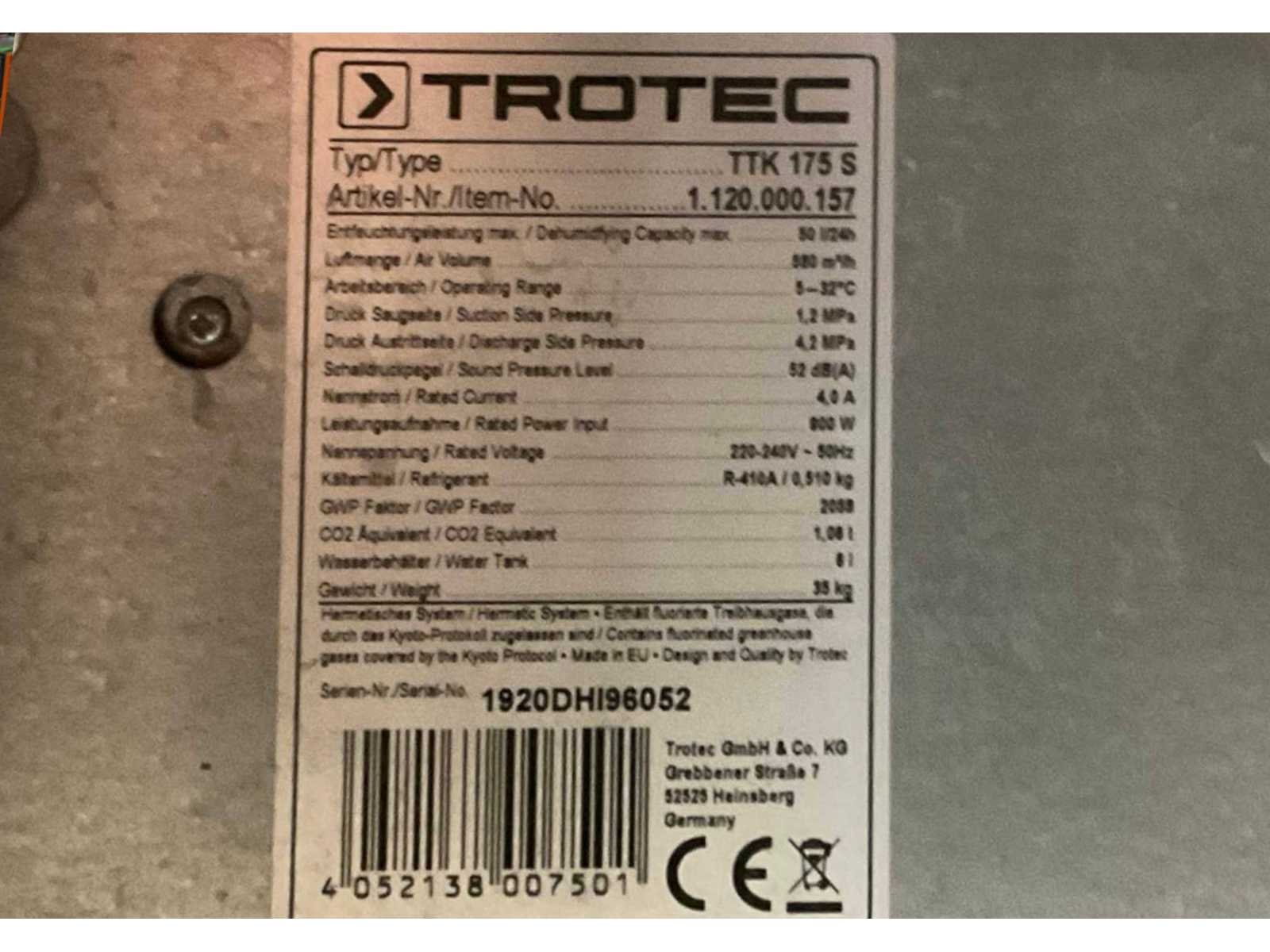 Luchtverplaatsing 300 m³ / uur; verrijdbaar; afgelezen urenstand 12063 uur; 880 Watt; capaciteit 50 liter / 24 uur; working condition; Merk: Trotec Type: TTK 175 S Aansluiting: 230V Eigen gewicht: 35kg Totale afmeting L: 320mm Totale afmeting Breedte: 450mm Totale afmeting Hoogte: 500mm