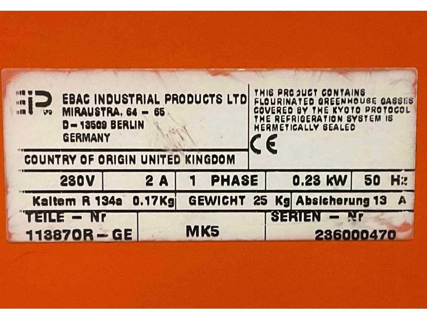 Vermogen: 0,23 kW; aansluiting: 230 V; eigen gewicht: 25 kg; totale afmeting L: 320 mm; totale afmeting B: 350 mm; totale afmeting H: 570 mm; omschrijving: verrijdbaar; working condition Merk: Ebac Type: MK5