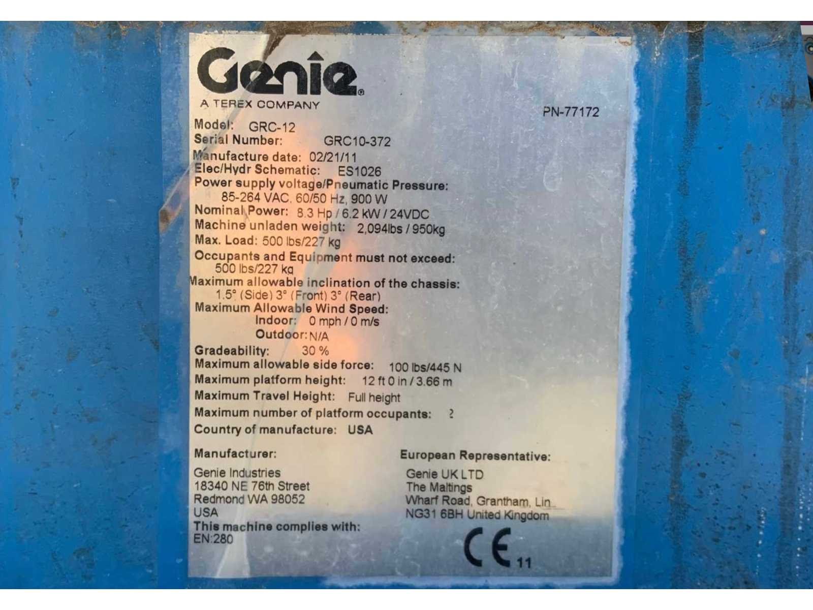 Staal / aluminium; maximale platform hoogte 3660 mm; kooibediening; uitschuifbaar plateau 1300x600 mm; ingebouwde acculader; 24 Volt; 230 Volt; working condition; accu leeg Merk: Genie Type: GRC-12 Bouwjaar: 2011 Elektrisch: true Motorvermogen (kW): 6.2kW Masthoogwerker: true Werkhoogte: 5500mm Plateau afm. l: 900mm Plateau afm. b: 600mm Platform capaciteit: 227kg Accu lader: true Afgelezen urenstand: 426 Eigen gewicht: 950kg Totale afmeting L: 1400mm Totale afmeting Breedte: 760mm Totale afmeting Hoogte: 1700mm