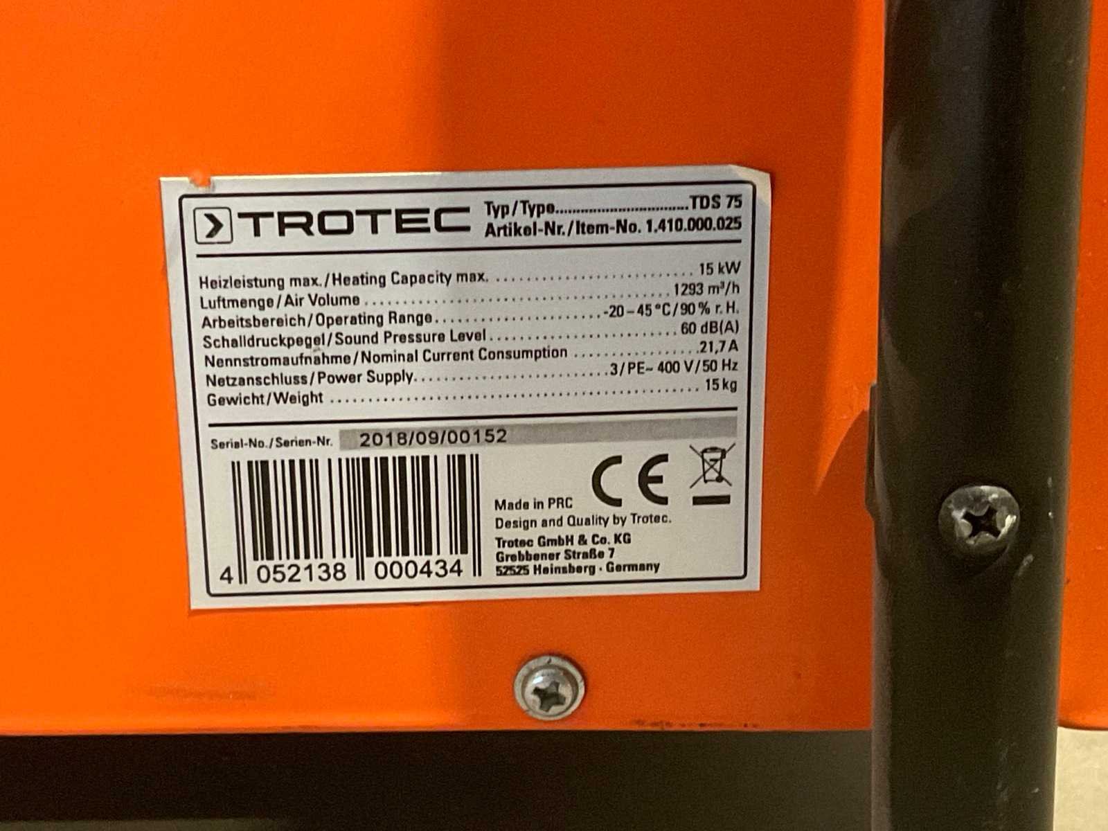 Vermogen: 15,00 kW; ventilator: ja; thermostaat: nee; totale afmeting L: 400 mm; totale afmeting B: 330 mm; totale afmeting H: 540 mm; aansluiting: 400 V; omschrijving: thermostaat; standenschakelaar; 21,7 Ampère; volumestroom 1293 m3 / uur; working condition Merk: Trotec Type: TDS 75