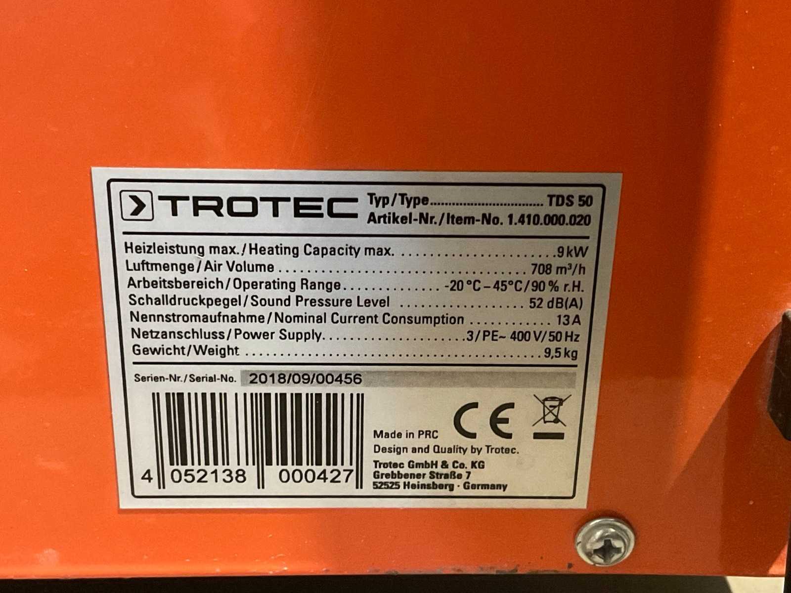 Standenschakelaar; volumestroom 708 m3 / uur; 13 Ampère; draagbeugel; working condition Merk: Trotec Type: TDS50 Vermogen: 9kW Ventilator: true Thermostaat: true Eigen gewicht: 10kg Totale afmeting L: 320mm Totale afmeting Breedte: 450mm Totale afmeting Hoogte: 480mm Aansluiting: 400V