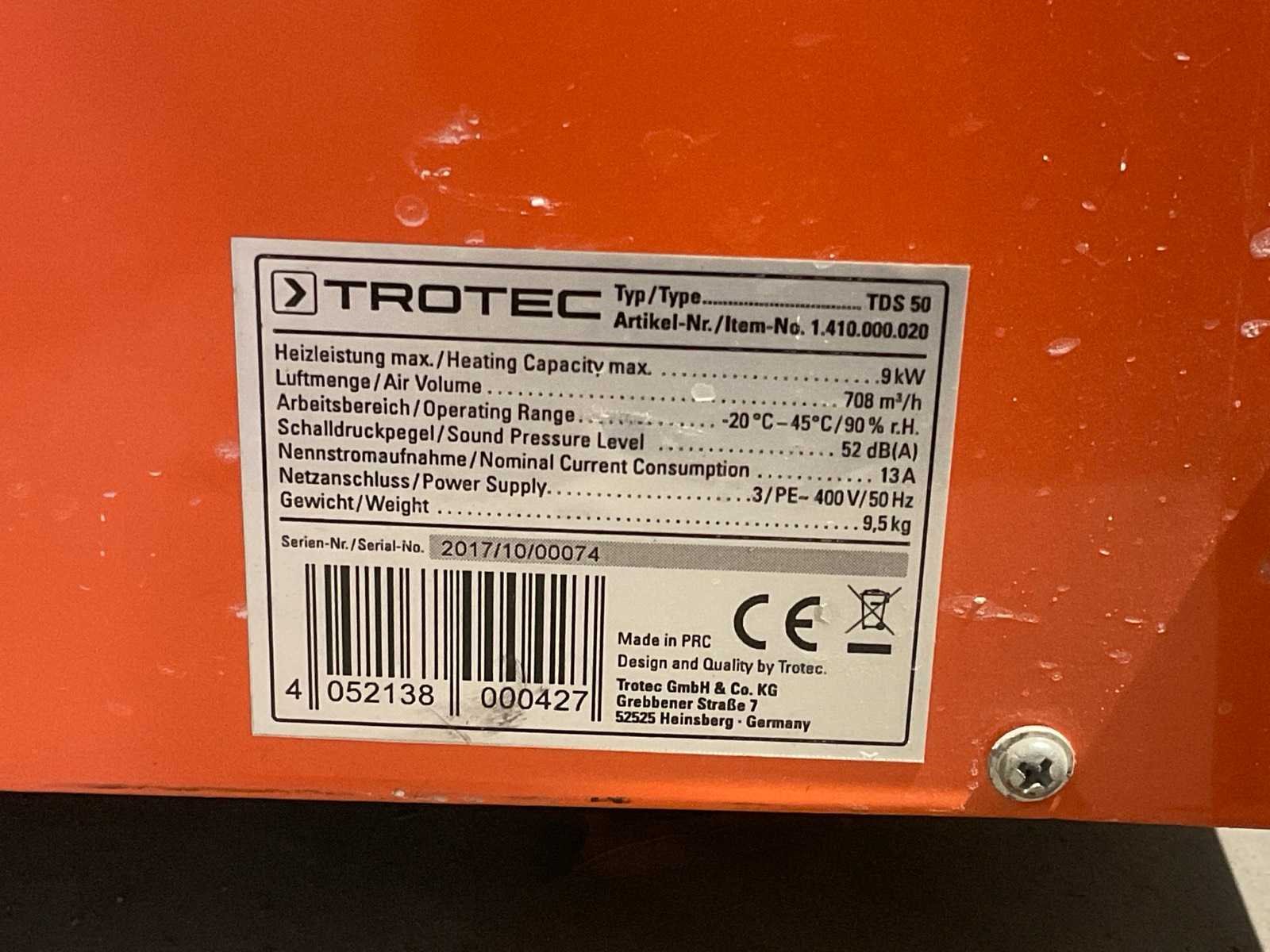 Standenschakelaar; volumestroom 708 m3 / uur; 13 Ampère; draagbeugel; working condition Merk: Trotec Type: TDS50 Vermogen: 9kW Ventilator: true Thermostaat: true Eigen gewicht: 10kg Totale afmeting L: 320mm Totale afmeting Breedte: 450mm Totale afmeting Hoogte: 480mm Aansluiting: 400V