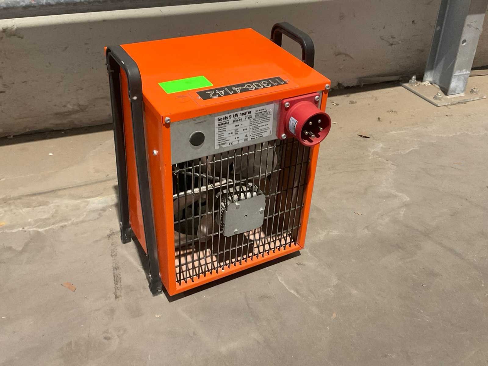 Standenschakelaar; volumestroom 708 m3 / uur; 13 Ampère; draagbeugel; working condition Vermogen: 9kW Ventilator: true Thermostaat: true Eigen gewicht: 10kg Totale afmeting L: 320mm Totale afmeting Breedte: 450mm Totale afmeting Hoogte: 480mm Aansluiting: 400V