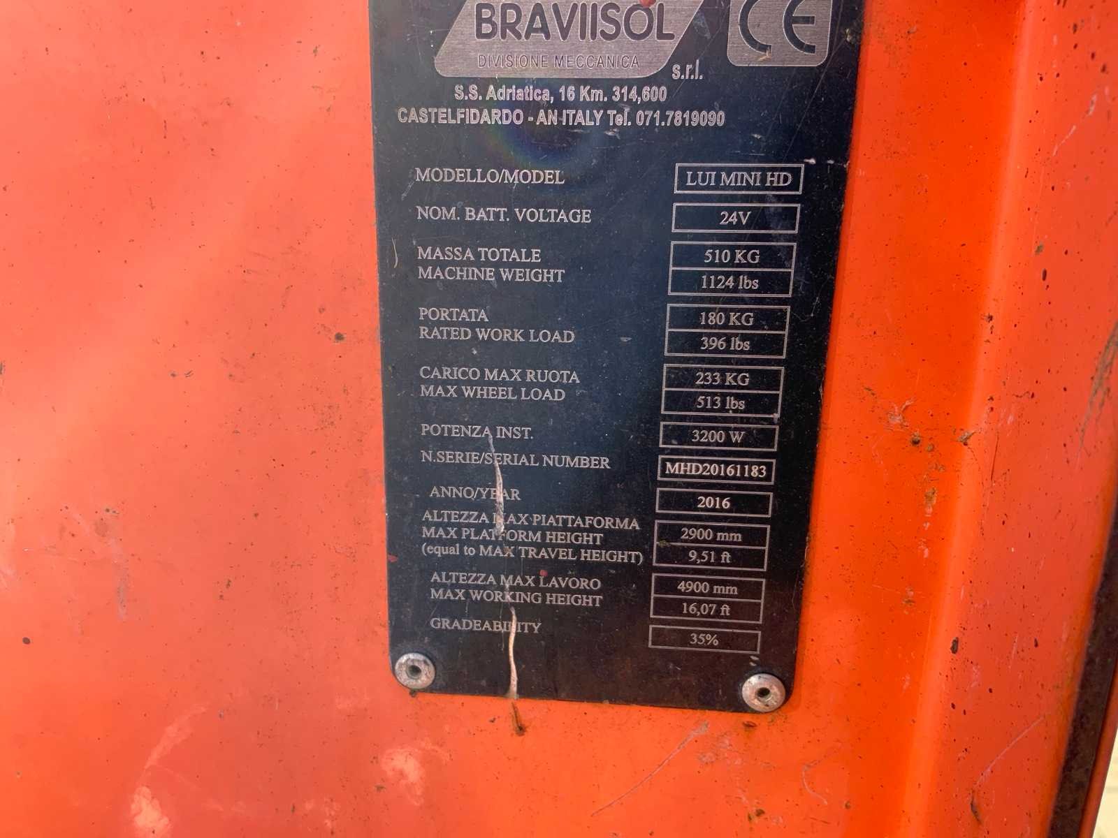 Staal; maximale platform vloerhoogte 2900 mm; kooibediening; uitschuifbaar plateau 1650x600 mm; ingebouwde acculader; 230 Volt; heftruck vorksleuven; working condition; Merk: Braviisol Leonardo Type: LUI MINI HD Bouwjaar: 2016 Elektrisch: true Motorvermogen (kW): 3.2kW Masthoogwerker: true Werkhoogte: 4900mm Plateau afm. l: 1100mm Plateau afm. b: 600mm Platform capaciteit: 180kg Accu lader: true Eigen gewicht: 510kg Totale afmeting L: 1200mm Totale afmeting Breedte: 750mm Totale afmeting Hoogte: 1750mm