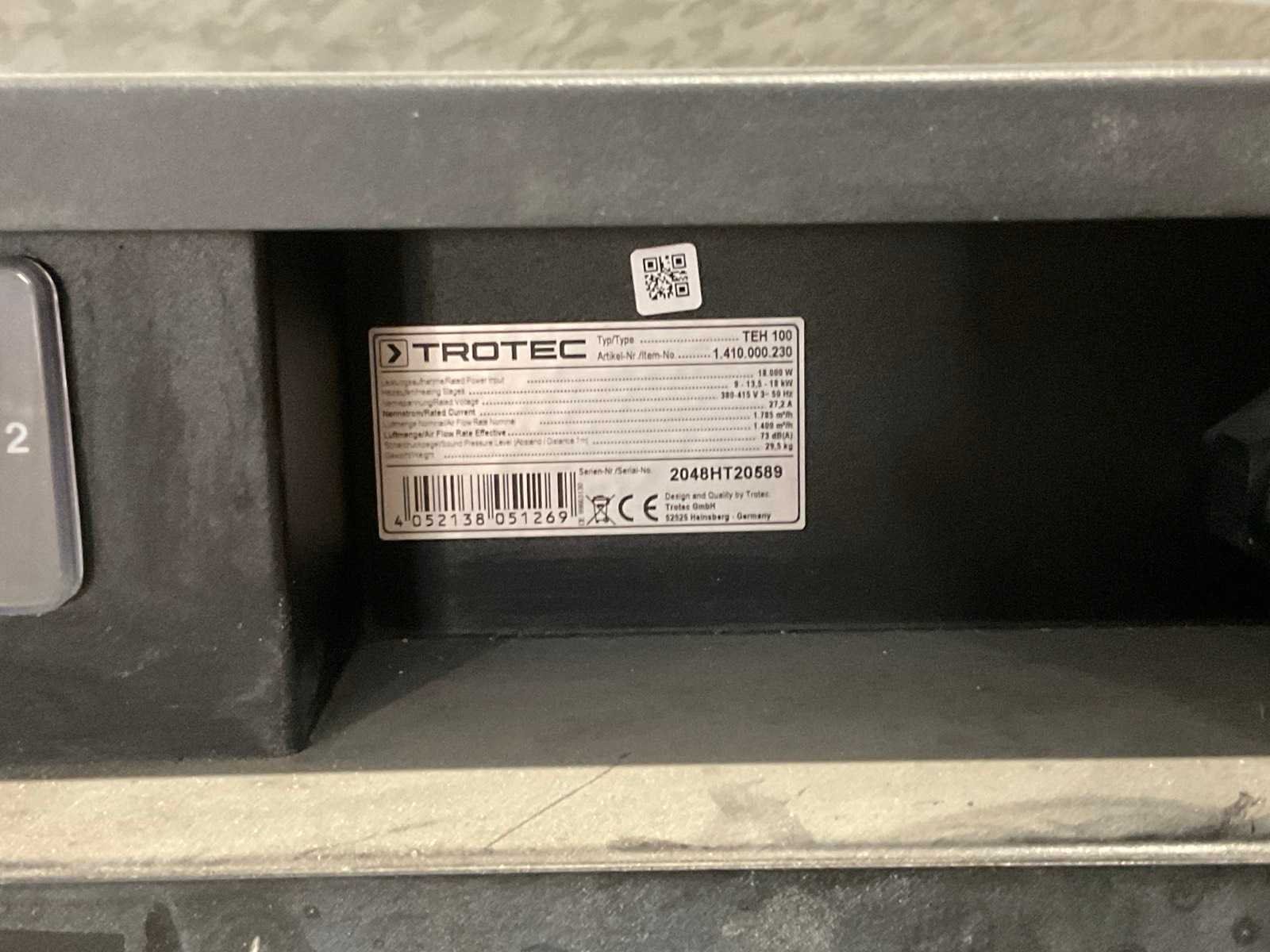Verrijdbaar; thermostaat; standenschakelaar; volumestroom 1785 m3 / uur; working condition Merk: Trotec Type: TEH 100 Vermogen: 18kW Ventilator: true Eigen gewicht: 29kg Totale afmeting L: 400mm Totale afmeting Breedte: 420mm Totale afmeting Hoogte: 600mm Aansluiting: 400V