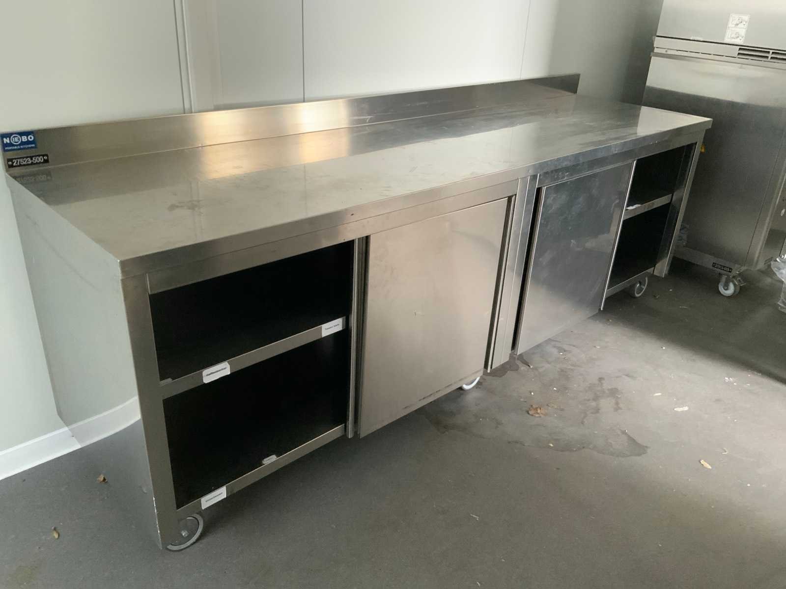 Verrijdbaar; 2x onderkast voorzien van dubbele schuifdeur; 6 zwenkwielen; Merk: Emainox Totale afmeting L: 2600mm Totale afmeting Breedte: 700mm Totale afmeting Hoogte: 1050mm