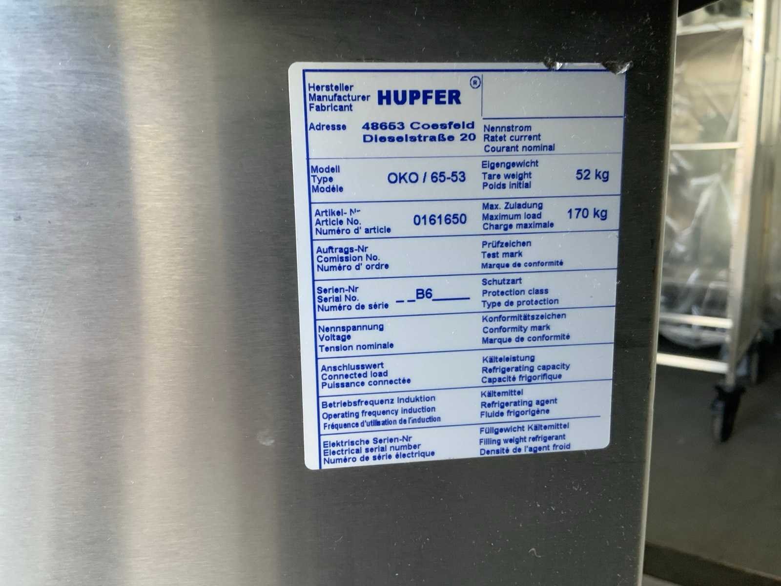 Roestvast staal; verrijdbaar; open; voorzien van rubber stootranden; working condition; Merk: Hupfer Type: OKO 65-63 Totale afmeting L: 80cm Bouwjaar: 2006 Totale afmeting Breedte: 75cm Totale afmeting Hoogte: 90cm Serienummer: OKO65-53 0161650 B6