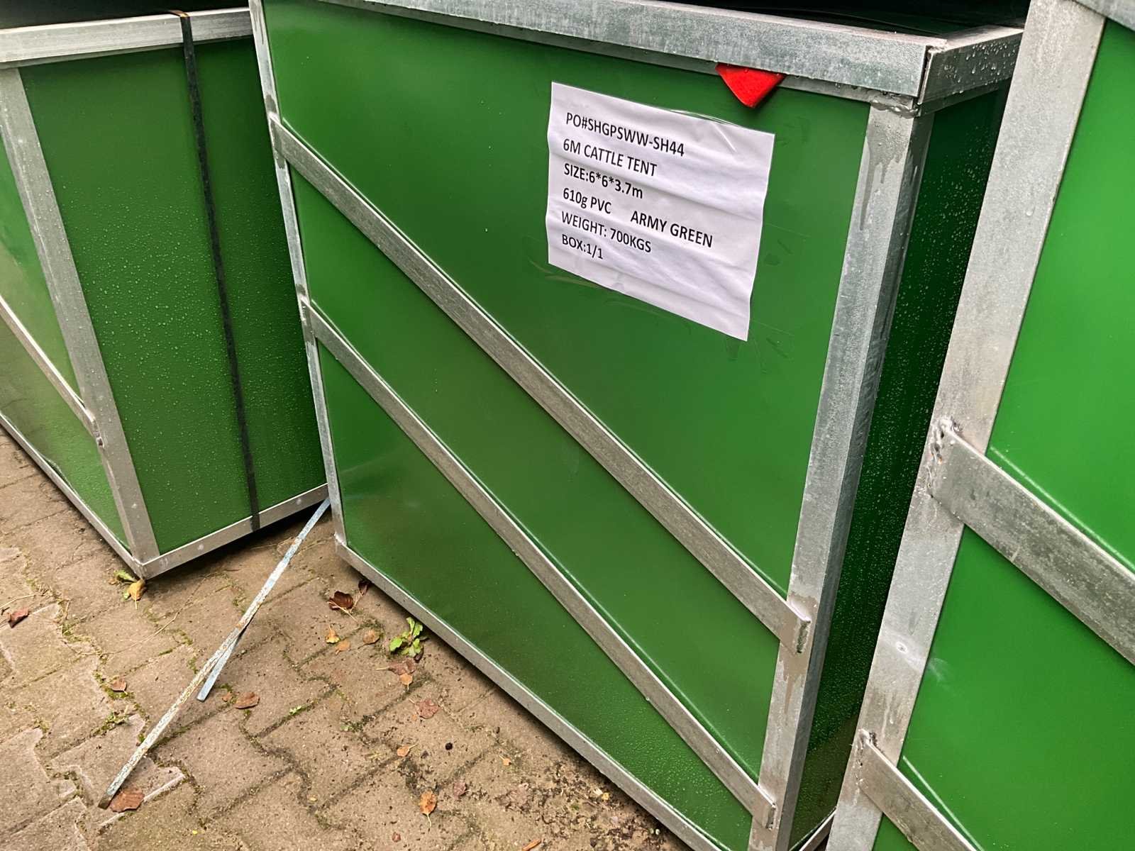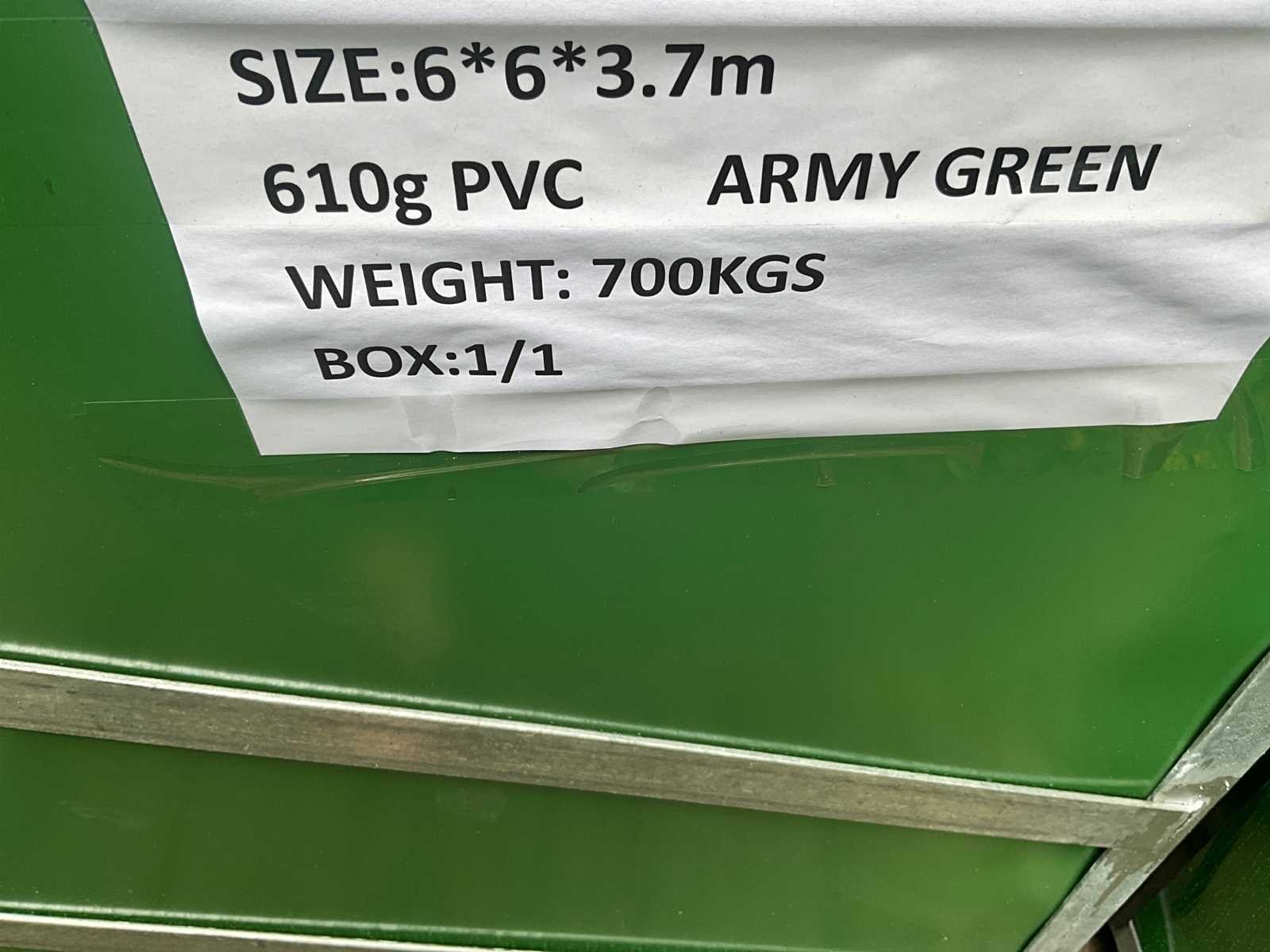 V.v. hekken rondom, gegalvaniseerde enkele truss/buis; ruimte tussen bogen 2,00 meter; buismaat 60x1,8 mm; maat gording 40x1,5 mm; materiaal 610 gram, PVC zeildoek, kleur groen; handleiding aanwezig; zie voor meer info downloads; ongebruikt in metalen krat; Transportafmeting metalen krat: (lxbxh) Merk: Easy-Going Type: (6x6x3,70 meter) Bouwjaar: 2025 Eigen gewicht: 700kg Totale afmeting L: 6000mm Totale afmeting Breedte: 6000mm Totale afmeting Hoogte: 3700mm GS Code: 63062200