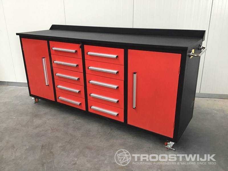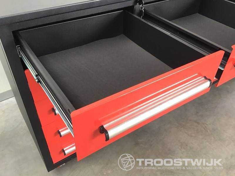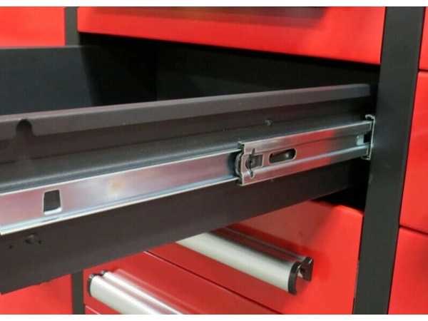 V.v. 2x sleutel; 2x ophangbeugel; 10 lades; 3 delig schuifsysteem; antislipmat; wielen; handvat aan zijkant; aantal laden: 10; staal: ja; stalen blad : ja; totale afmeting LxBxH: 2225x650x1140; eigen gewicht: 230 kg; © ongebruikt Merk: 2025-Easy-Going Model: 7FT-10D-01C Gewicht: 230kg Lengte: 2250mm Hoogte: 1140mm Materiaal: metaal