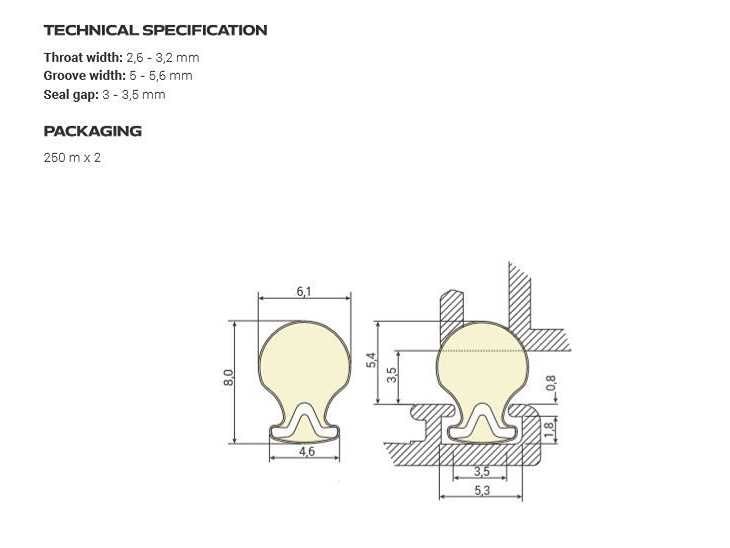 5 rol a 250 mtr. T-groefprofiel, kunststof en aluminium toepassing, voetbreedte 4,6 mm Groefbreedte: 2,6 - 3,2 mm Groefdiepte: 5,0 - 5,6 mm Afdichtspleet: 3,0 - 3,5 mm T-groef type A (5,3 mm) T-groefprofiel, kunststof en aluminium toepassing, voetbreedte 4,8 mm Merk: Schlegel Q-lon