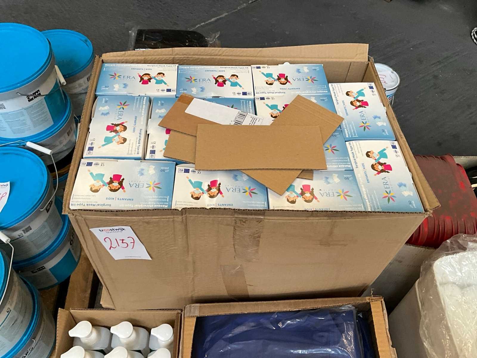 Betreft ongebruikte partij, pallet niet inbegrepen, aantal is circa 100 dozen met onbekend aantal mondkapjes Merk: Partij
