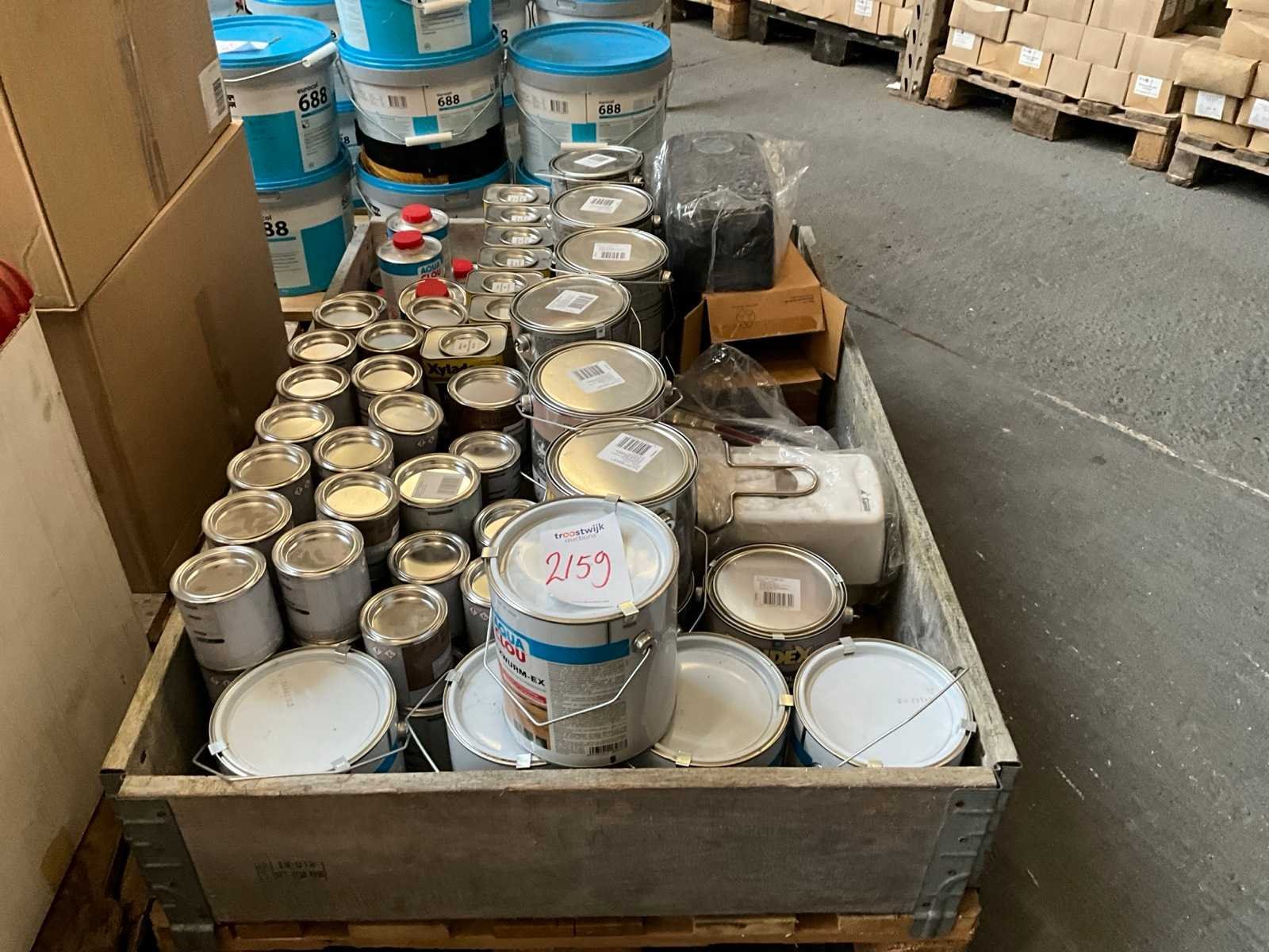Pallet niet bij kavel inbegrepen; ongeopend met seal; nieuw; Diverse soorten, kleuren en maten verf;