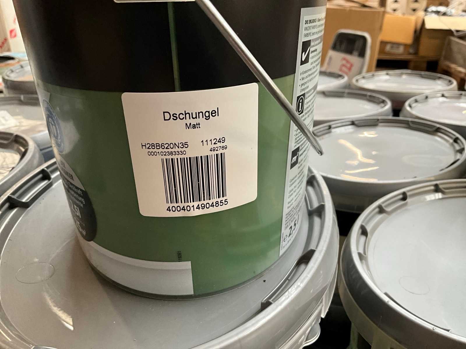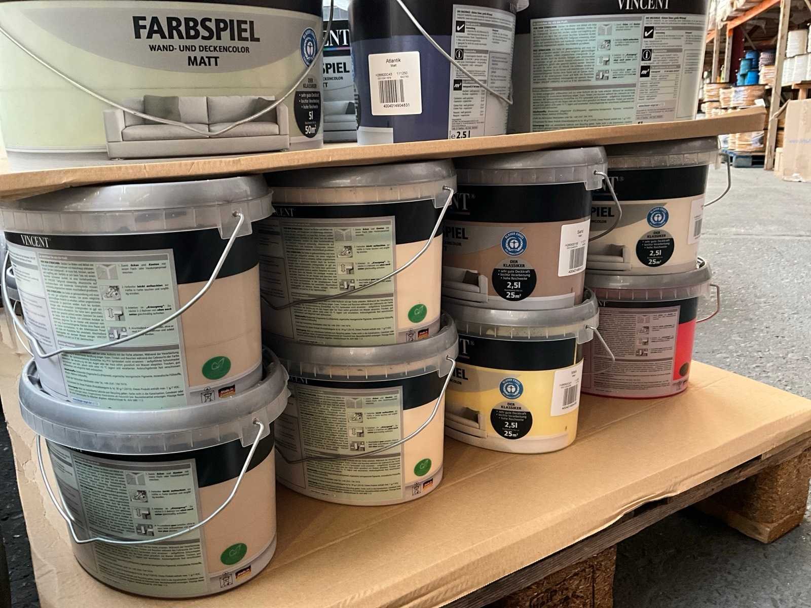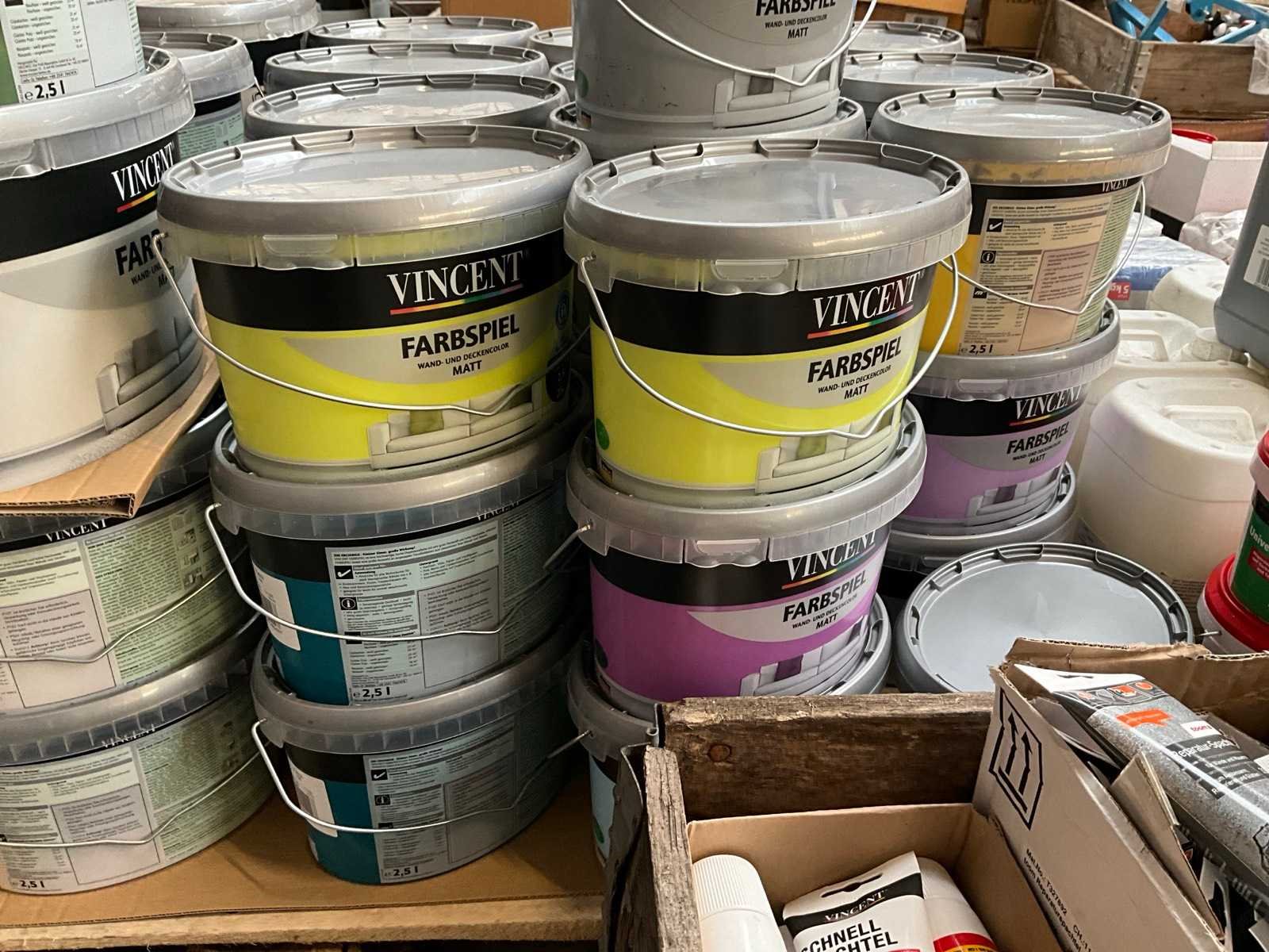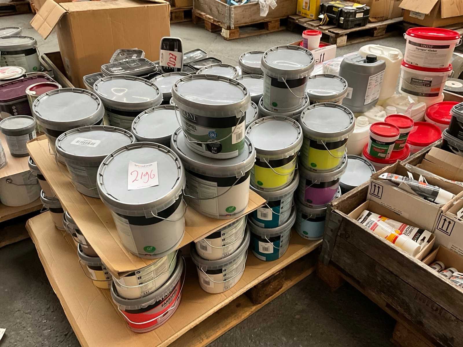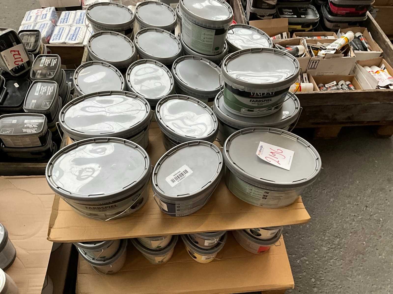 Pallet niet bij kavel inbegrepen; ongeopend met seal; nieuw; Diverse soorten, kleuren en maten verf;