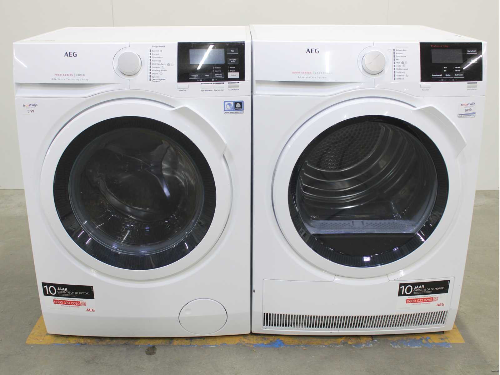 Deze wasmachine en wasdroger komen uit een partij jong gebruikt A-Merk witgoed. De machines zijn volledig getest, gereinigd en indien nodig gerepareerd. Houdt er rekening mee dat de machines lichte gebruikssporen kunnen hebben. Wasmachines en wasdrogers hebben vaak standaard afmetingen. Hoogte 85cm, Breedte 60cm en Diepte 60 tot 70cm, incl. uitstekende slangen e.d. aan de achterzijde. Als de machine vrij komt te staan is de afmeting minder relevant. Wil je de machine in een nis plaatsen of inbouwen? Controleer dan de exacte afmetingen op basis van het aangeboden merk en model/type. Within 7 days Merk: AEG Serienummer: L7WB86GW 14200106 en T8DBESSEN