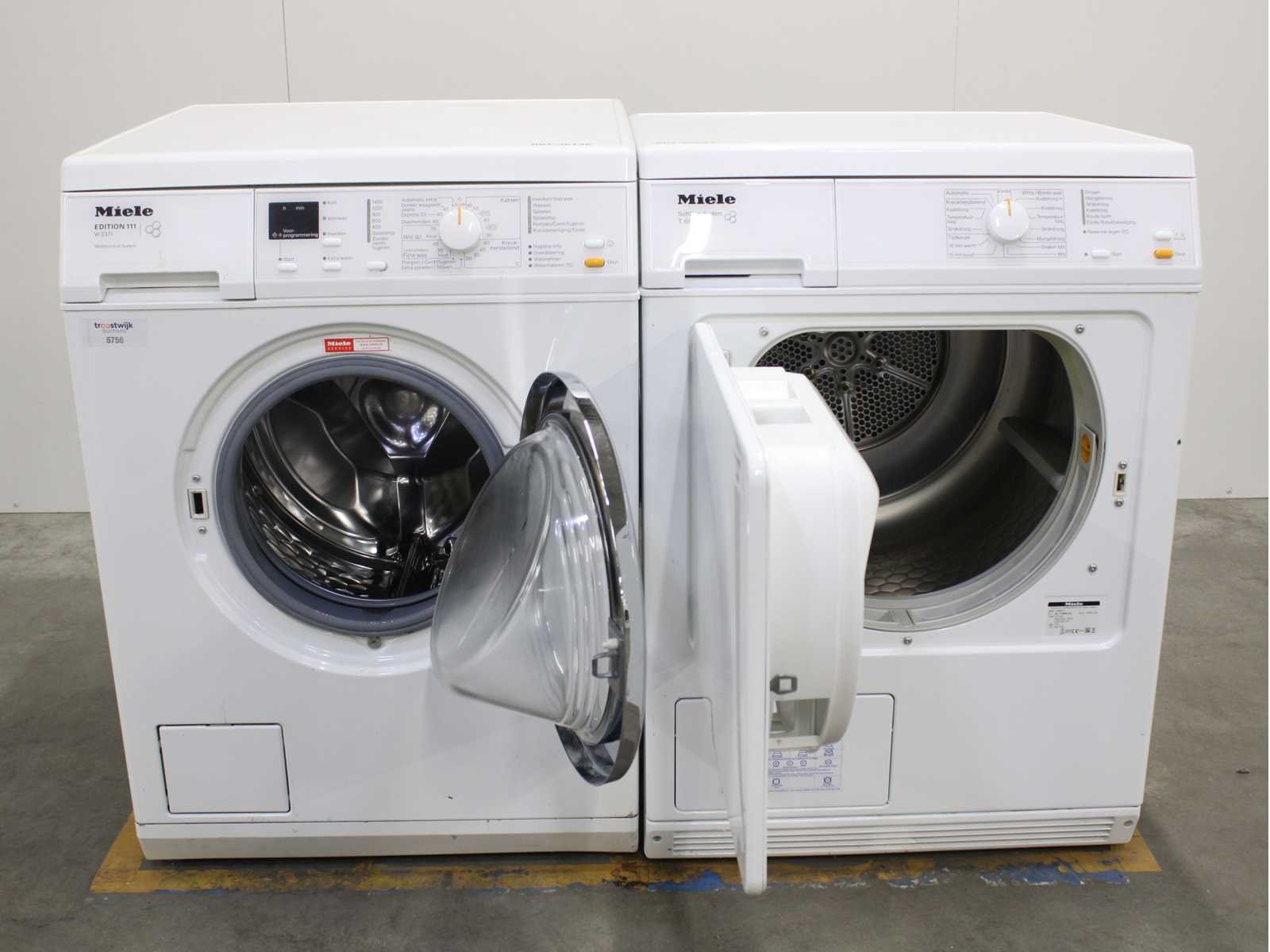 Deze wasmachine en wasdroger komen uit een partij jong gebruikt A-Merk witgoed. De machines zijn volledig getest, gereinigd en indien nodig gerepareerd. Houdt er rekening mee dat de machines lichte gebruikssporen kunnen hebben. Wasmachines en wasdrogers hebben vaak standaard afmetingen. Hoogte 85cm, Breedte 60cm en Diepte 60 tot 70cm, incl. uitstekende slangen e.d. aan de achterzijde. Als de machine vrij komt te staan is de afmeting minder relevant. Wil je de machine in een nis plaatsen of inbouwen? Controleer dan de exacte afmetingen op basis van het aangeboden merk en model/type. Within 7 days Merk: Miele Serienummer: W3371 en T8803C