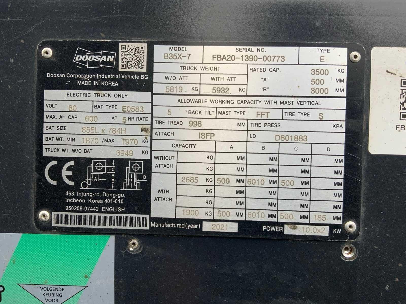 Merk: Doosan Type: B35X-7 Bouwjaar: 2021 Brandstof: Elektrisch Mast: Triple Aantal wielen: 4 Afgelezen urenstand: 756 Accu lader: true Side-shift: true Hydraulisch verstelbare lepels: true Triple mast: true Eigen gewicht: 5932kg Hefvermogen: 3500kg Lepellengte: 1200mm Max. hefhoogte: 6010mm Minimale doorrijhoogte: 2900mm Totale afmeting Breedte: 1200mm