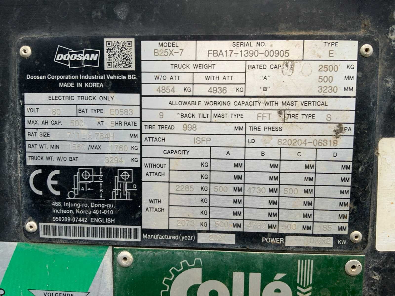 Merk: Doosan Type: B25X-7 Bouwjaar: 2021 Brandstof: Elektrisch Mast: Triple Aantal wielen: 4 Afgelezen urenstand: 1917 Accu lader: true Side-shift: true Triple mast: true Eigen gewicht: 5022kg Hefvermogen: 2500kg Lepellengte: 1200mm Max. hefhoogte: 4700mm Minimale doorrijhoogte: 2200mm Totale afmeting Breedte: 1200mm