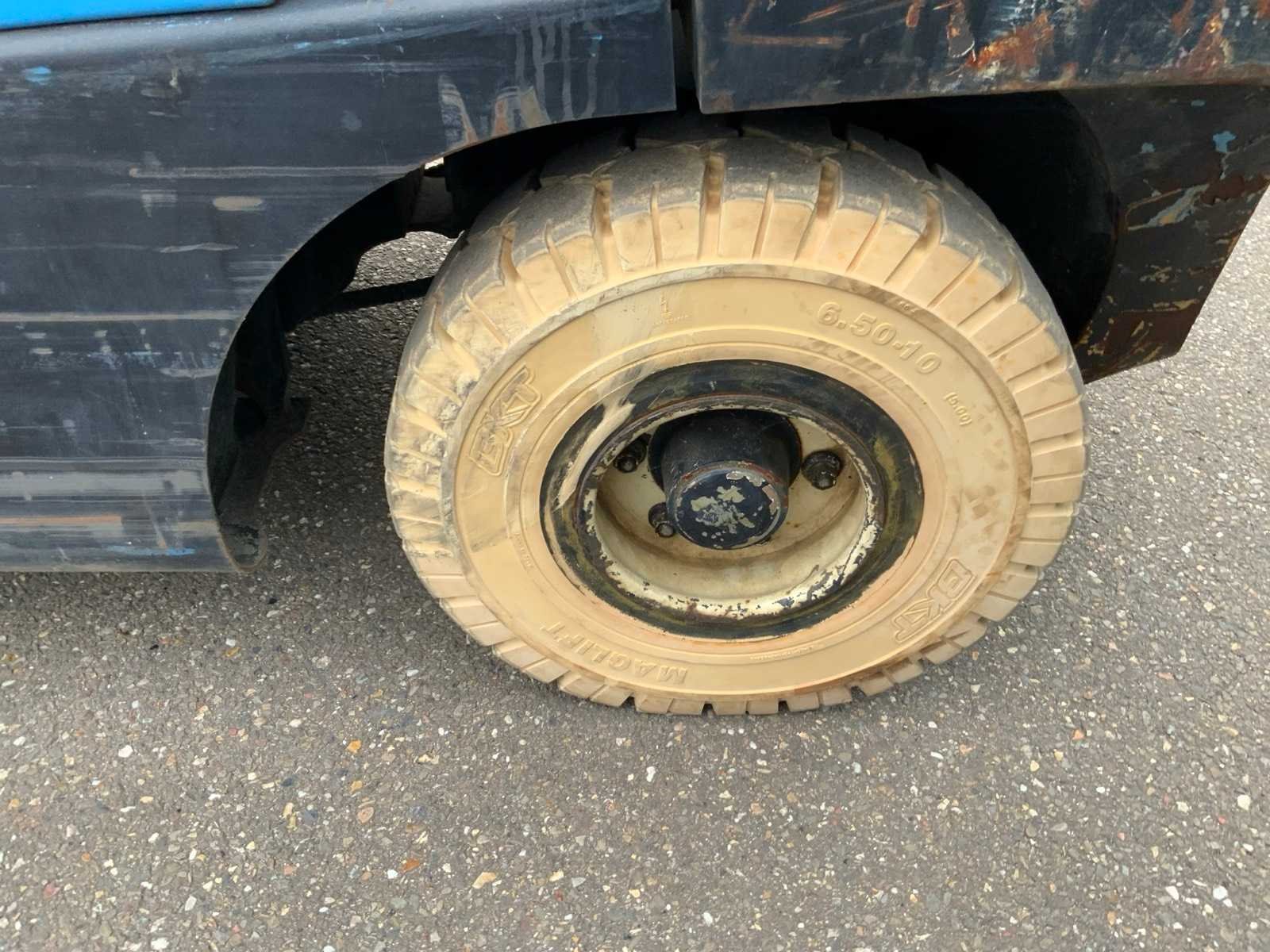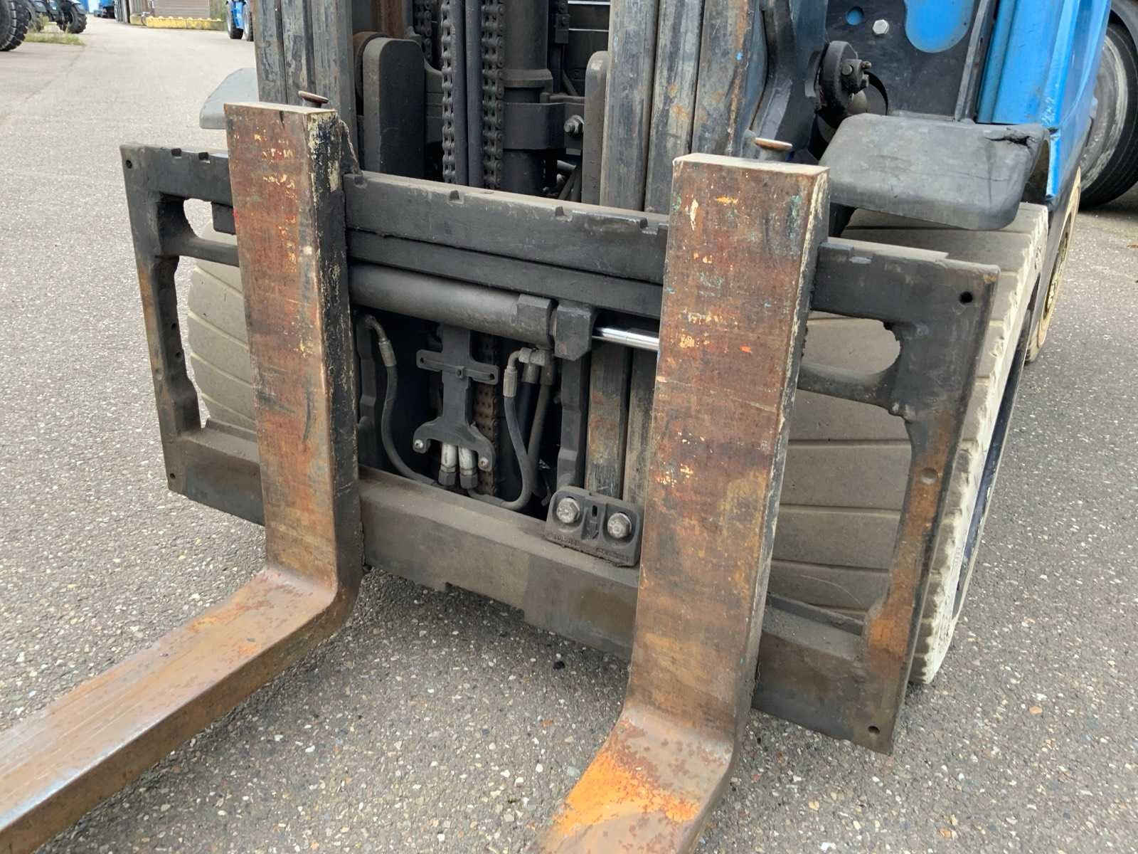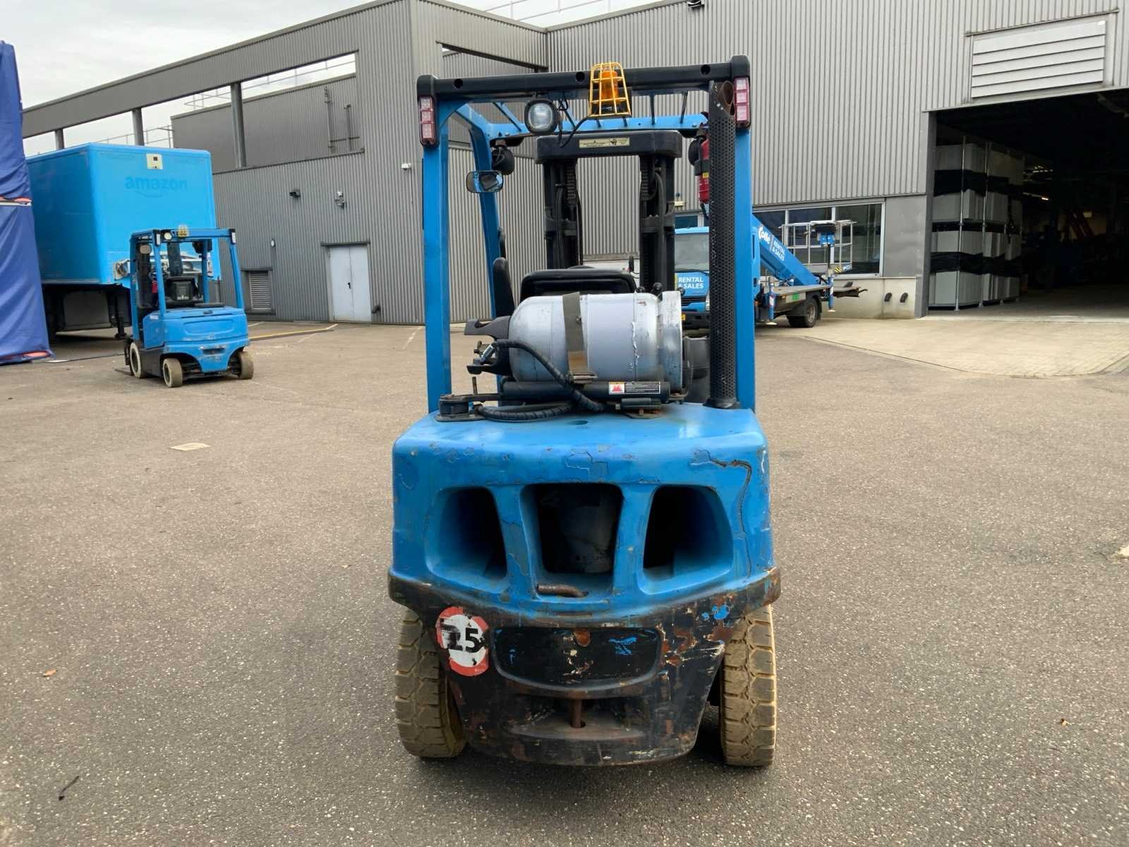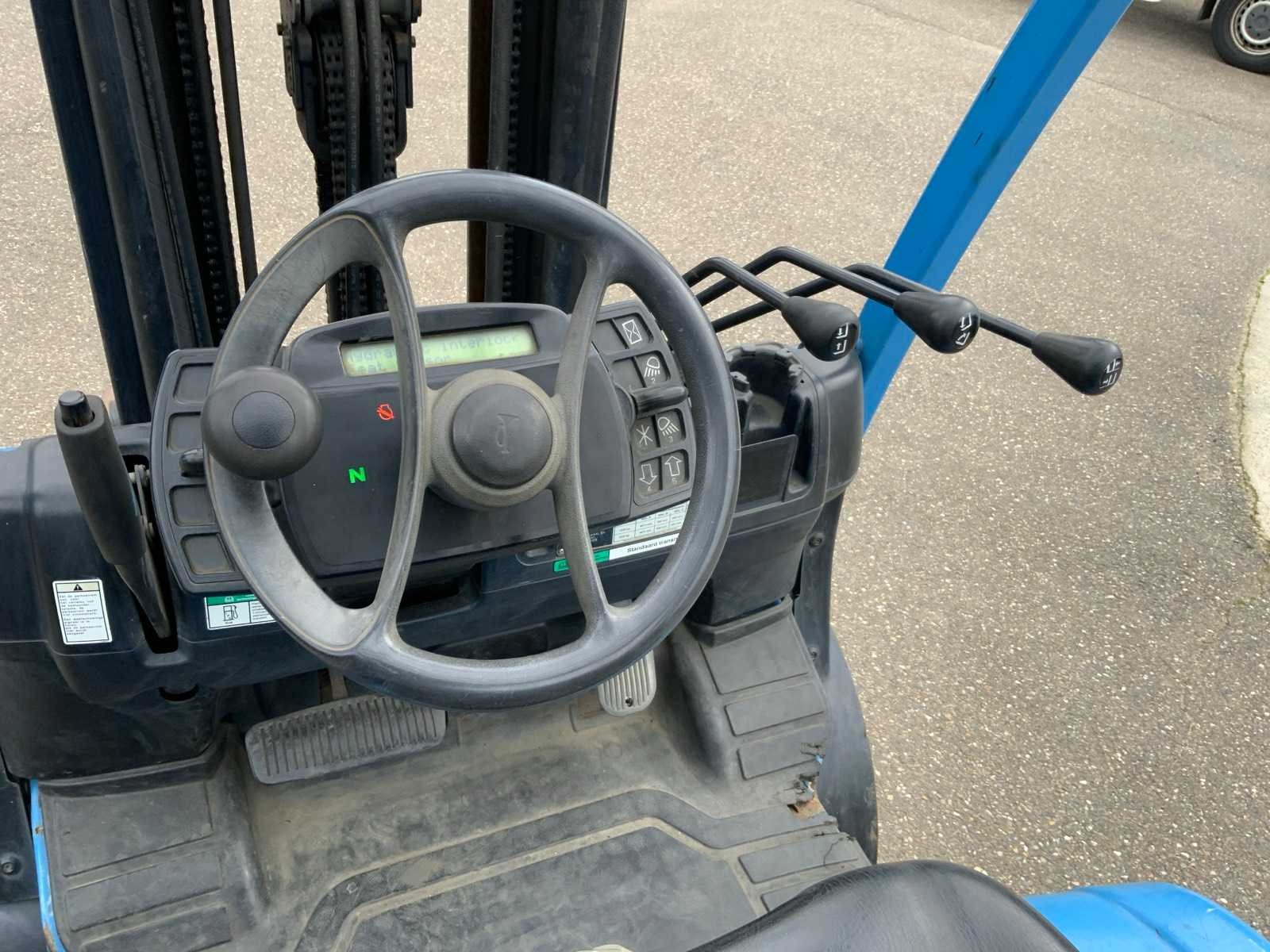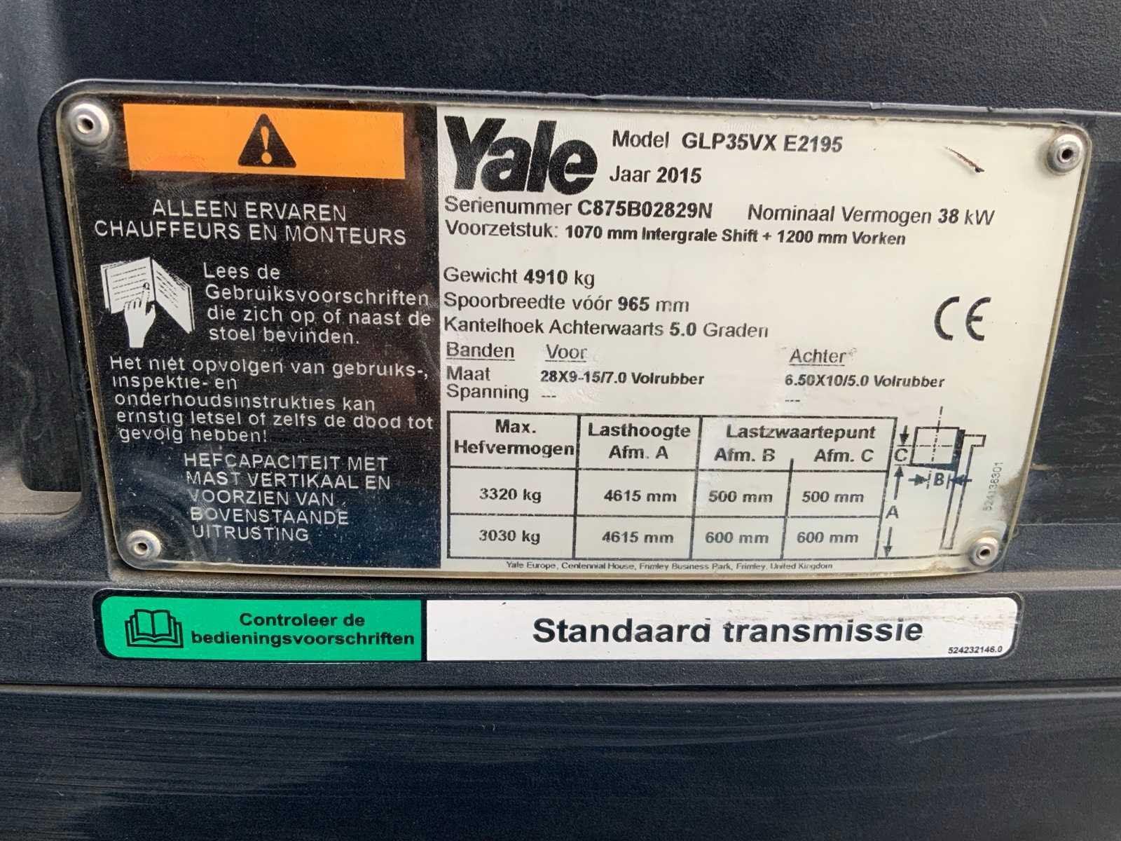 Merk: Yale Type: GLP35VX Bouwjaar: 2015 Brandstof: LPG Aantal wielen: 4 Afgelezen urenstand: 2818 Side-shift: true Triple mast: true Eigen gewicht: 4910kg Hefvermogen: 3320kg Lepellengte: 1200mm Max. hefhoogte: 4615mm Vol rubber banden: true Minimale doorrijhoogte: 2170mm Totale afmeting Breedte: 1200mm