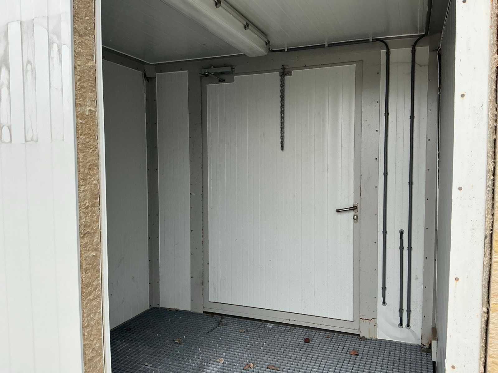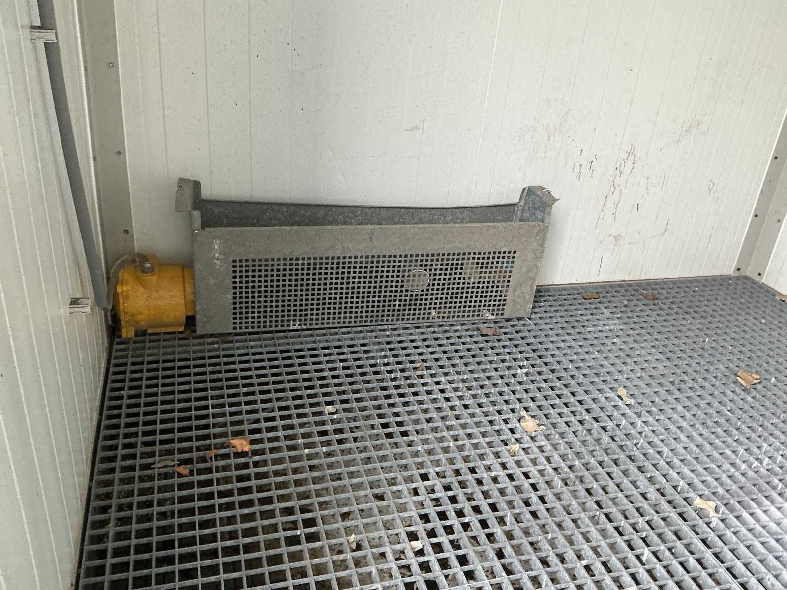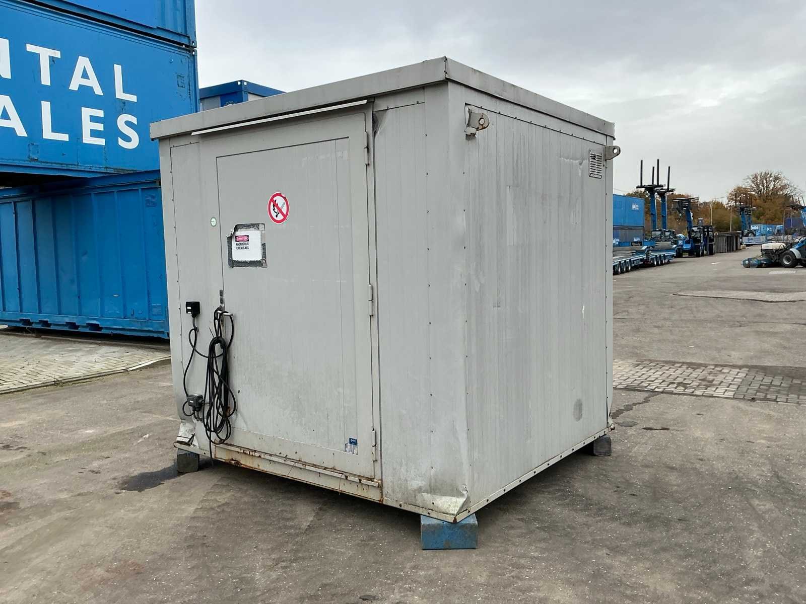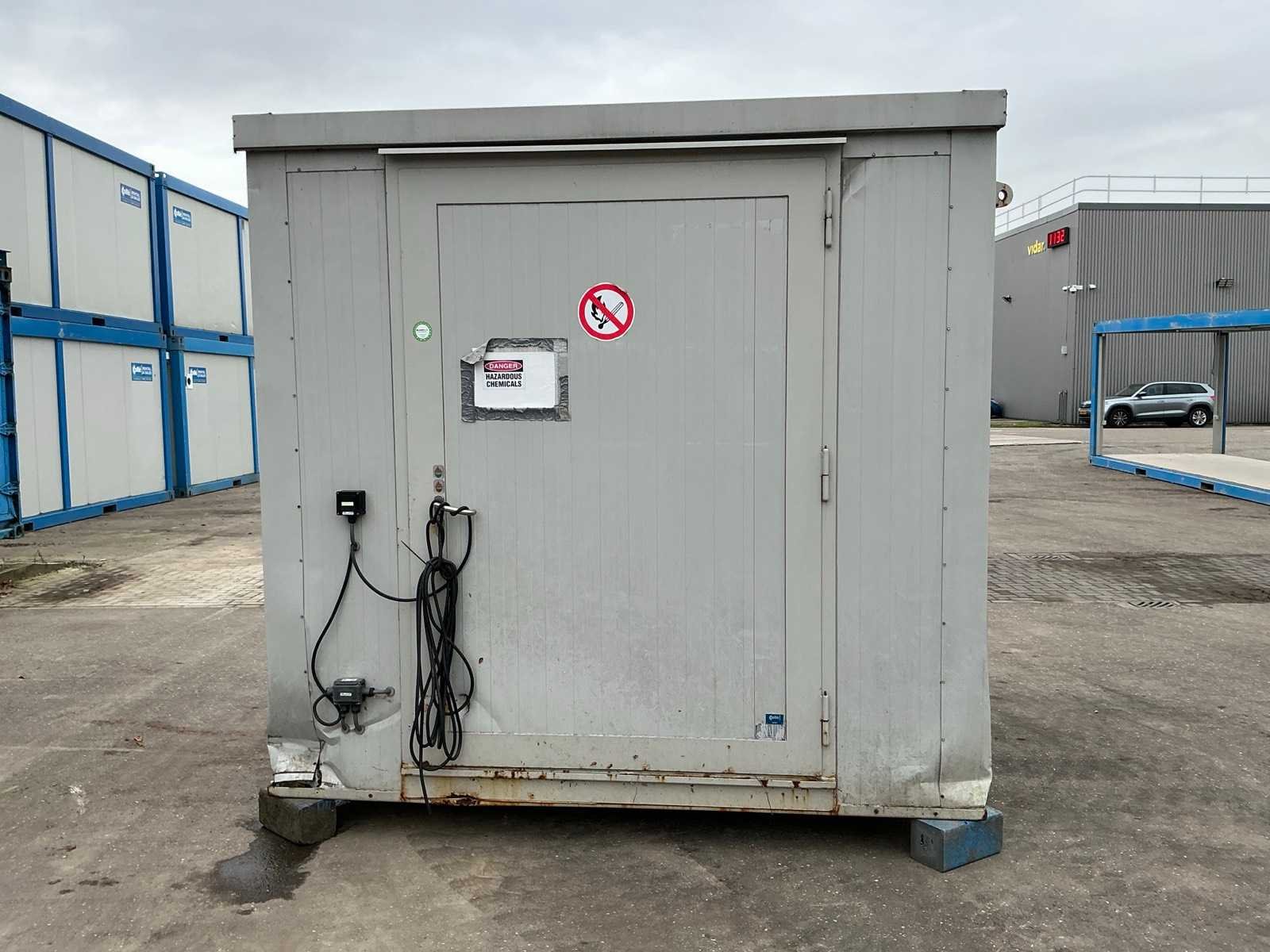 Ingebouwde lekbak; 1x loopdeur 140 cm breedte; voorzien van 4x hijsoog; beschadigd; 1x wandpaneel ontbreekt; Totale afmeting L: 2570mm Totale afmeting Breedte: 2350mm GS Code: 2420