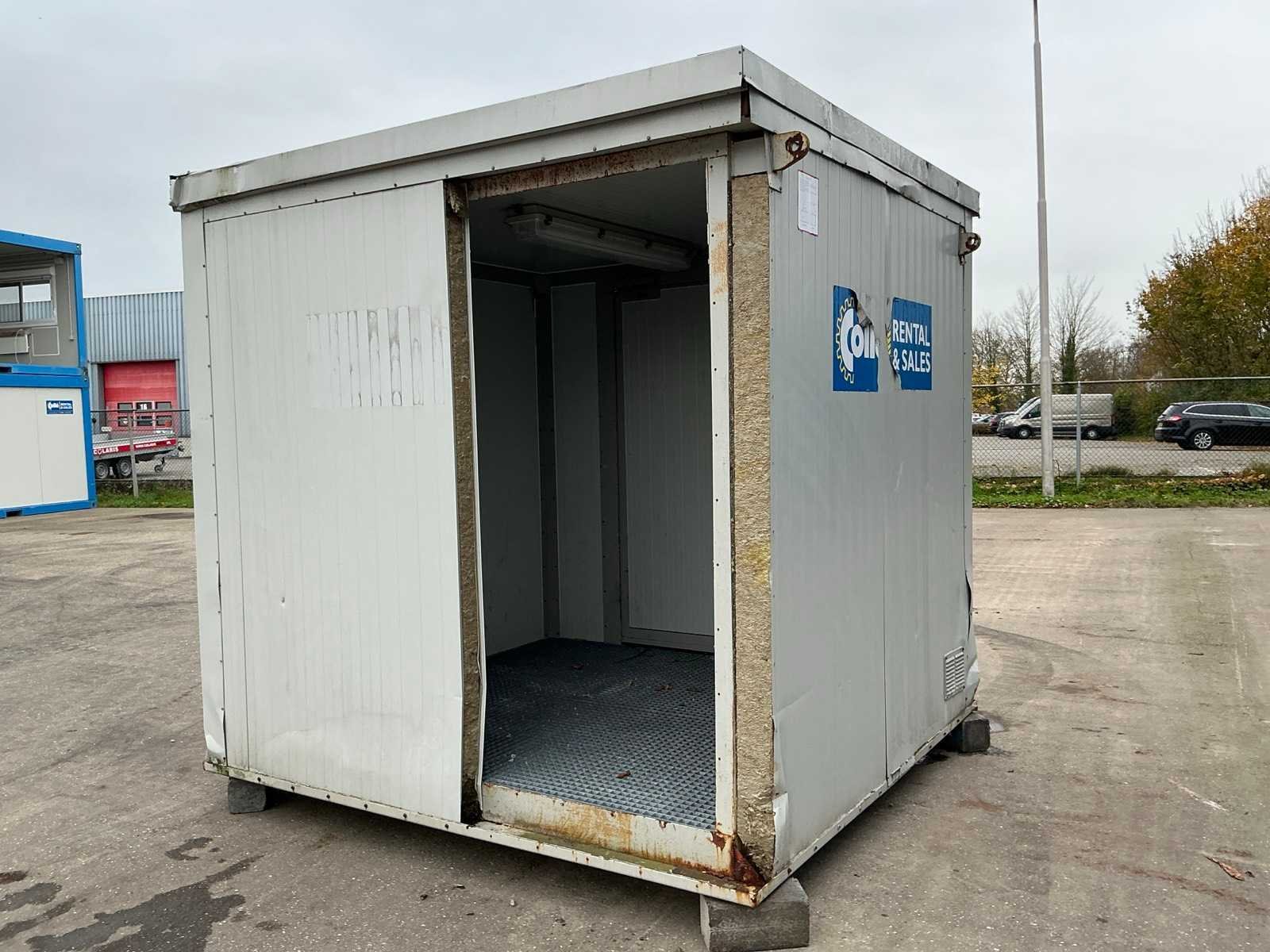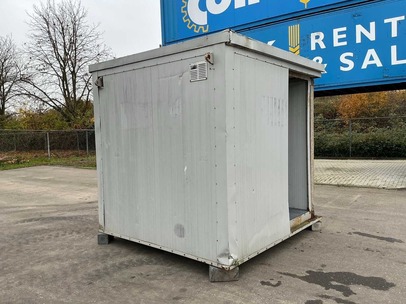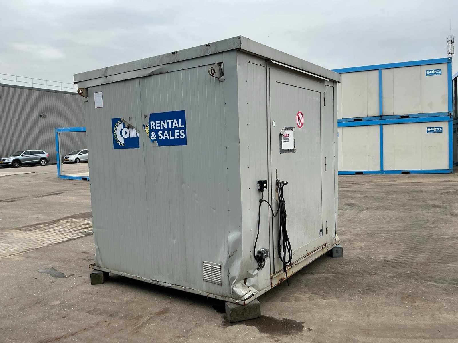 Ingebouwde lekbak; 1x loopdeur 140 cm breedte; voorzien van 4x hijsoog; beschadigd; 1x wandpaneel ontbreekt; Totale afmeting L: 2570mm Totale afmeting Breedte: 2350mm GS Code: 2420