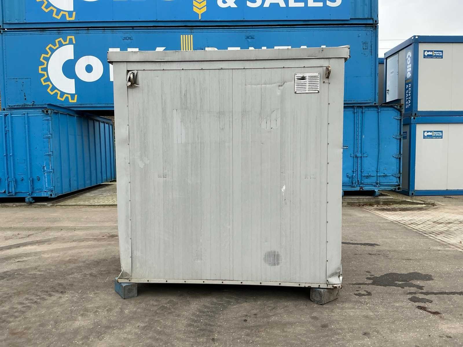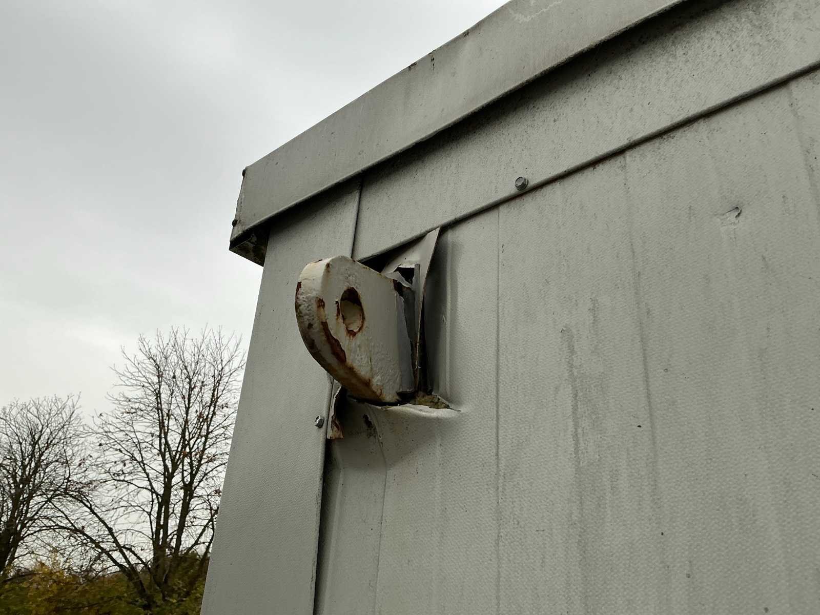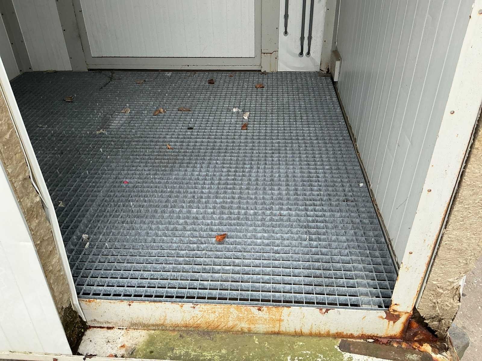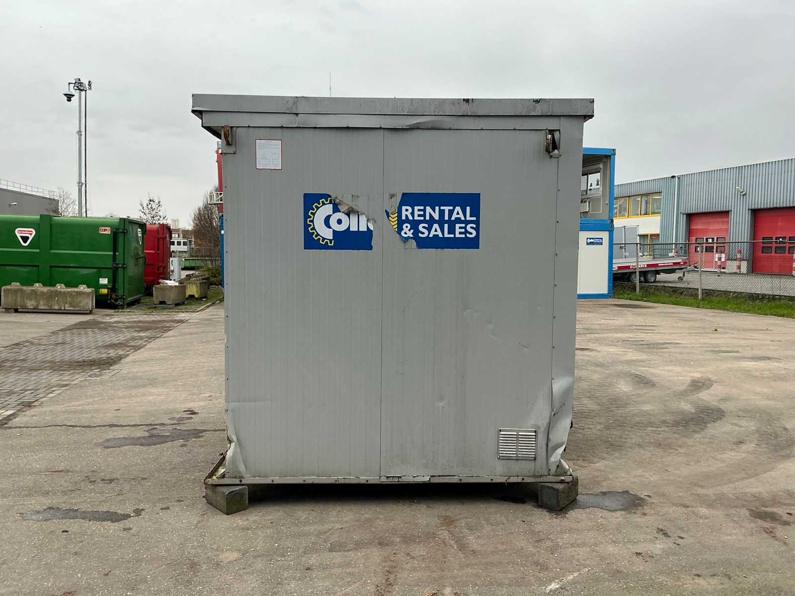 Ingebouwde lekbak; 1x loopdeur 140 cm breedte; voorzien van 4x hijsoog; beschadigd; 1x wandpaneel ontbreekt; Totale afmeting L: 2570mm Totale afmeting Breedte: 2350mm GS Code: 2420