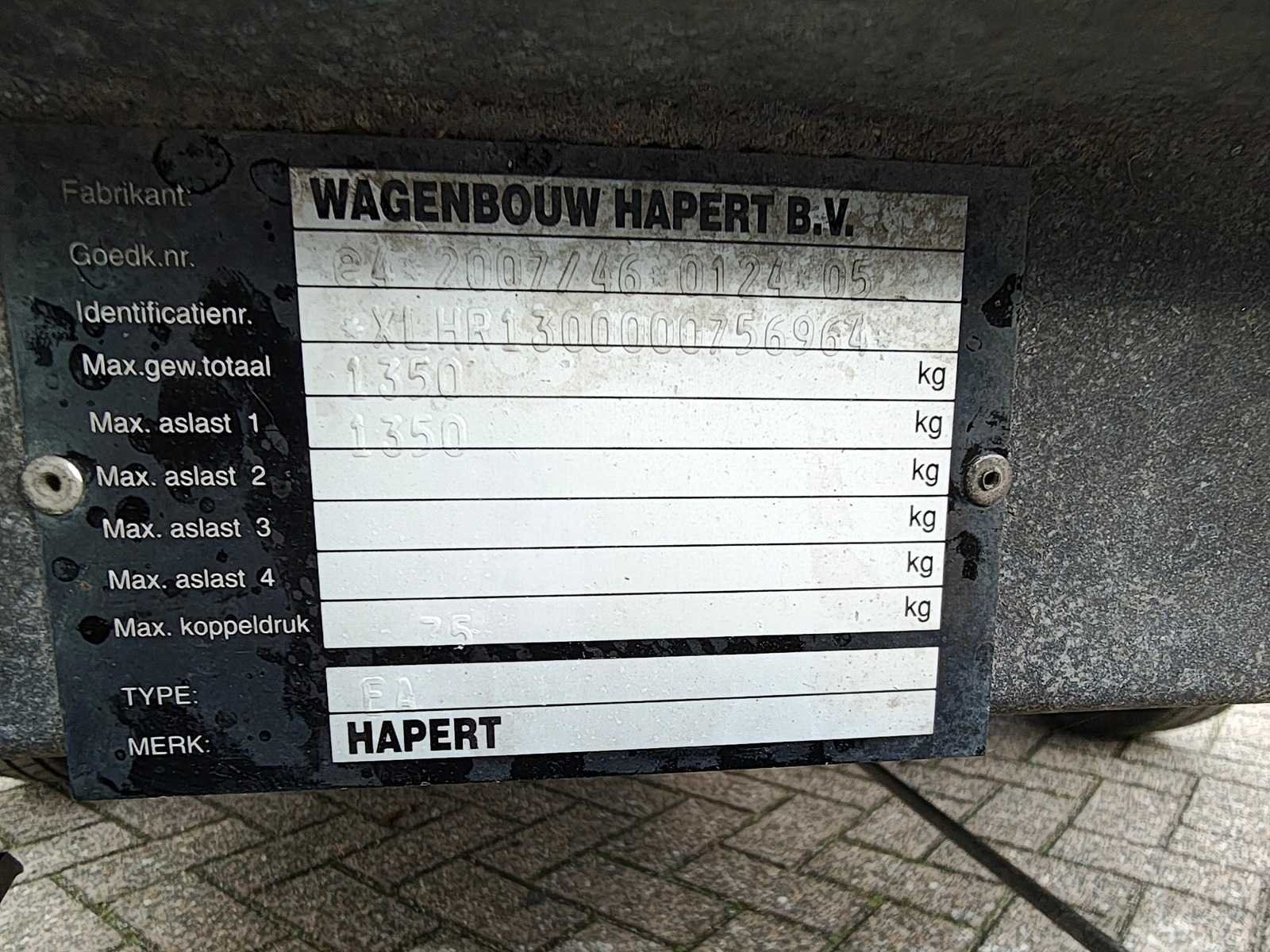 Merk: hapert Aantal assen: 1 Ledig gewicht: 295kg Laadvermogen: 1055kg Datum eerste toelating: 2013-05-08 Datum eerste toelating (NL): 2013-05-08 Kenteken: 13-WK-DR Kentekenpapieren compleet?: true