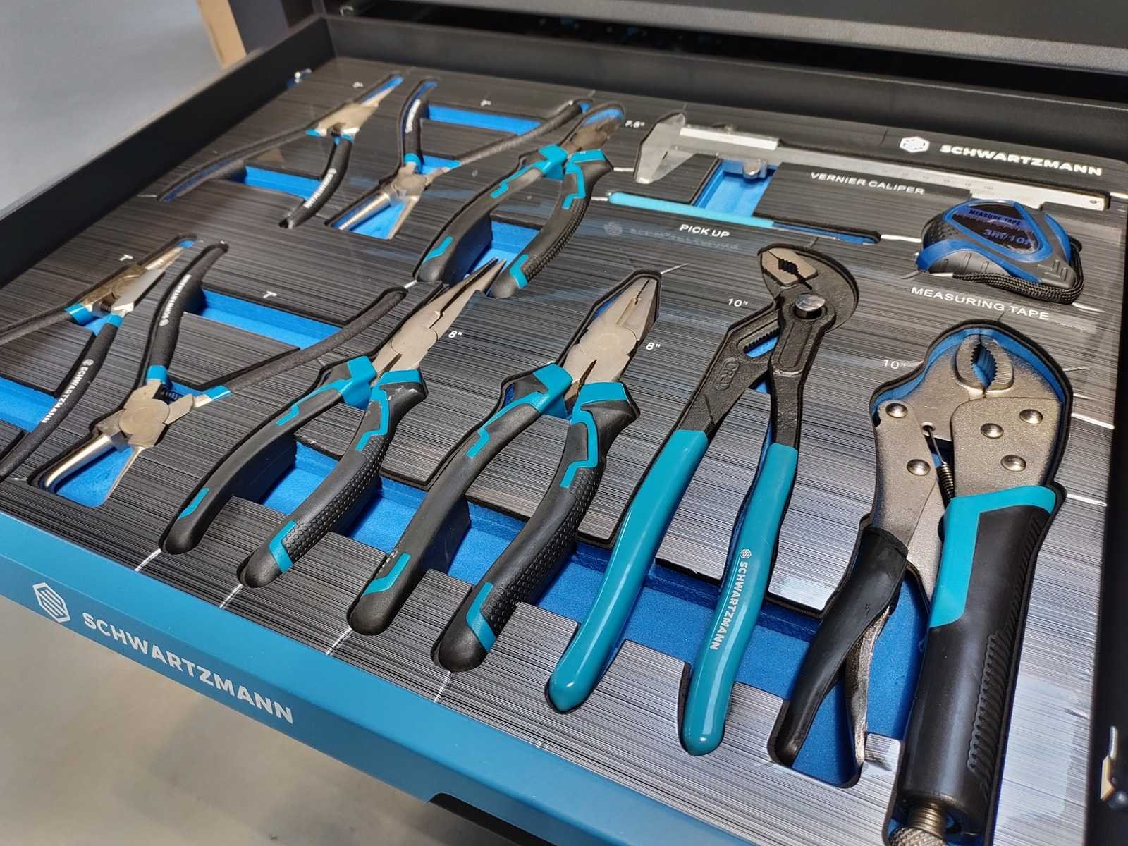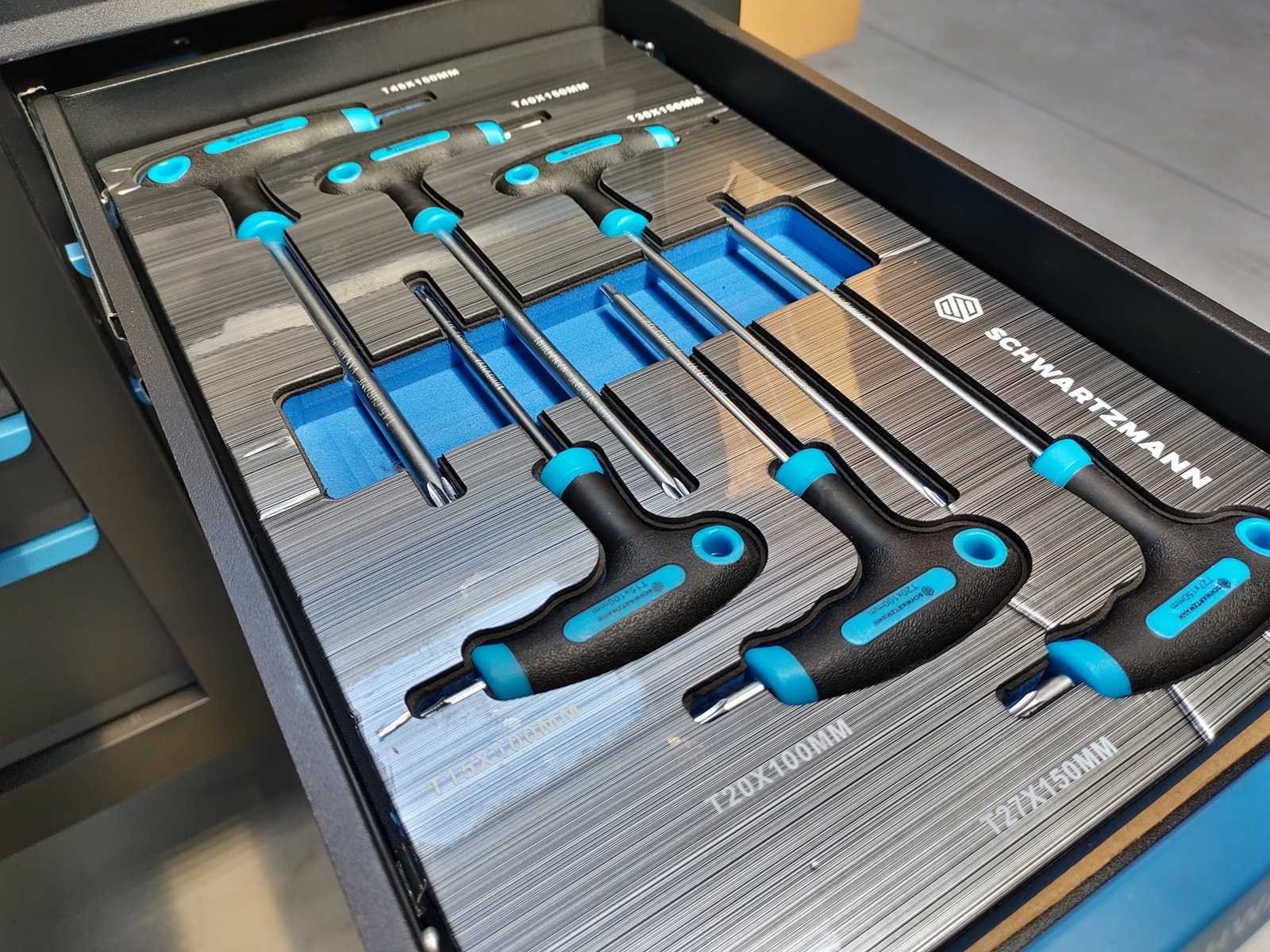Gevulde gereedschapswagen 12 laden, XXXL Jumbo uitvoering met houten bovenblad, gevuld met kwaliteits gereedschap, nieuw in doos Merk: Schwartzmann Model: 12/10