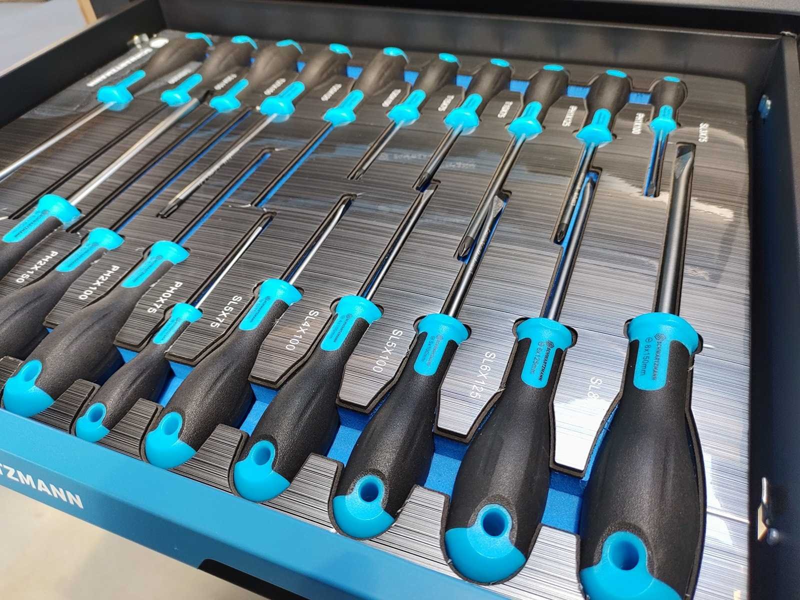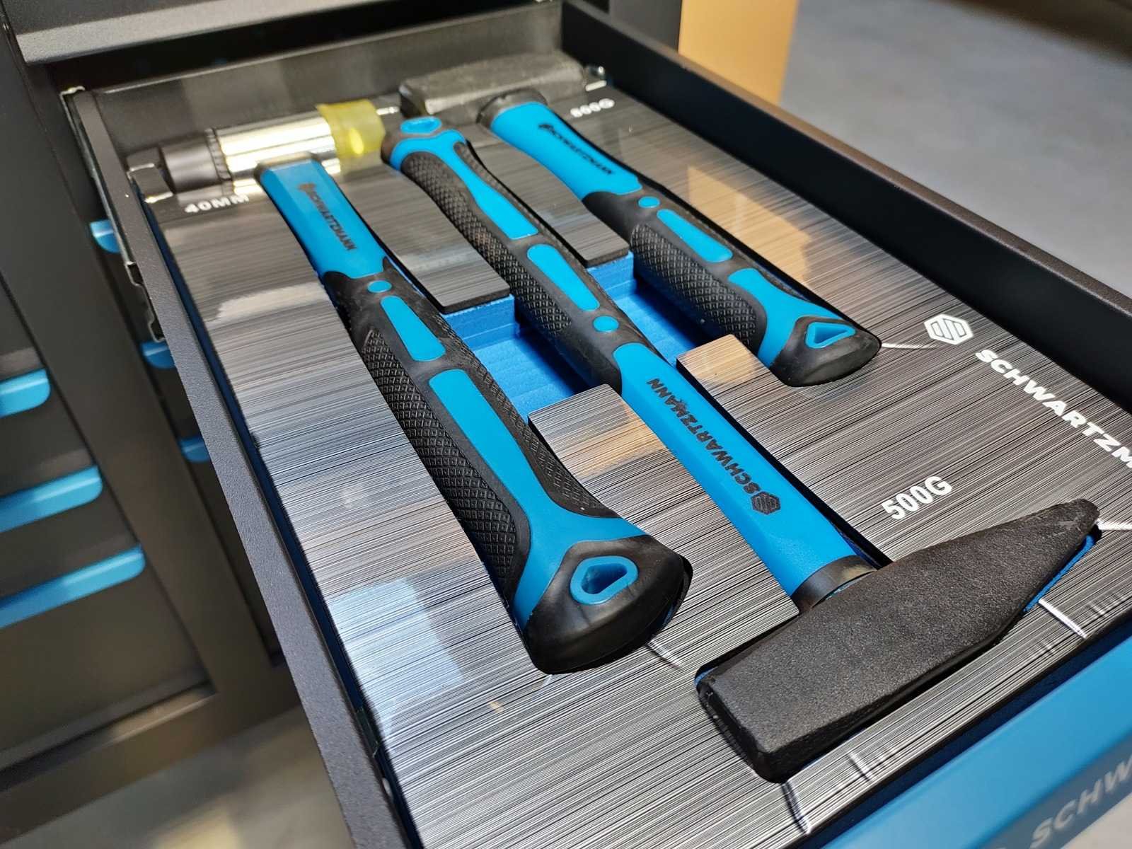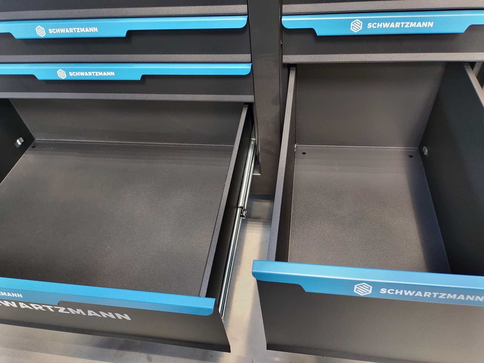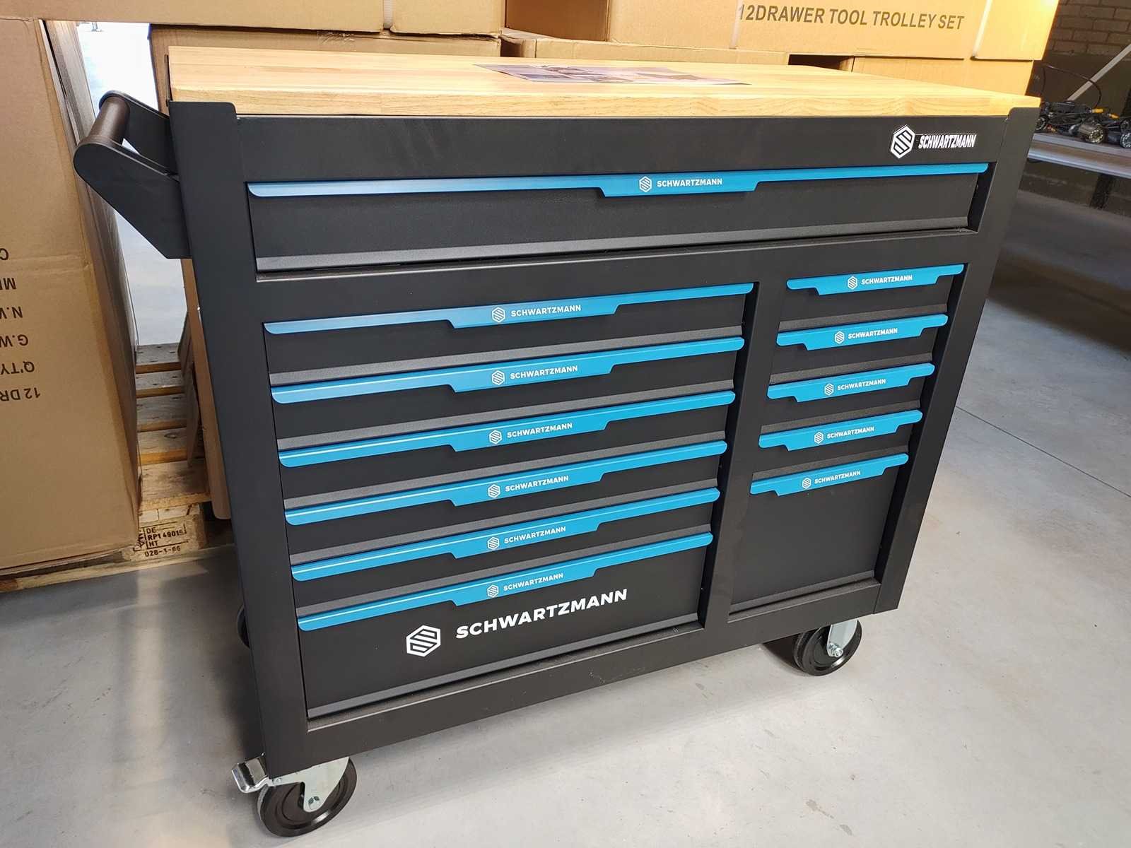 Gevulde gereedschapswagen 12 laden, XXXL Jumbo uitvoering met houten bovenblad, gevuld met kwaliteits gereedschap, nieuw in doos Merk: Schwartzmann Model: 12/10