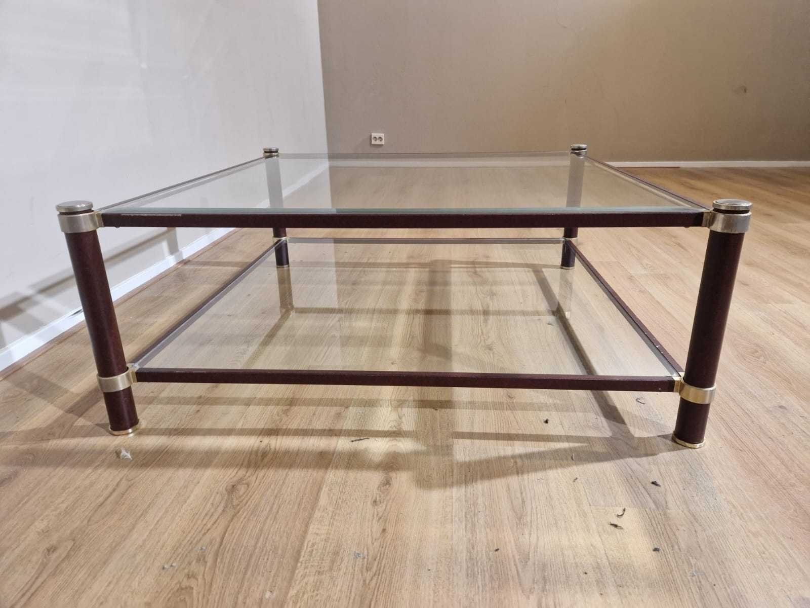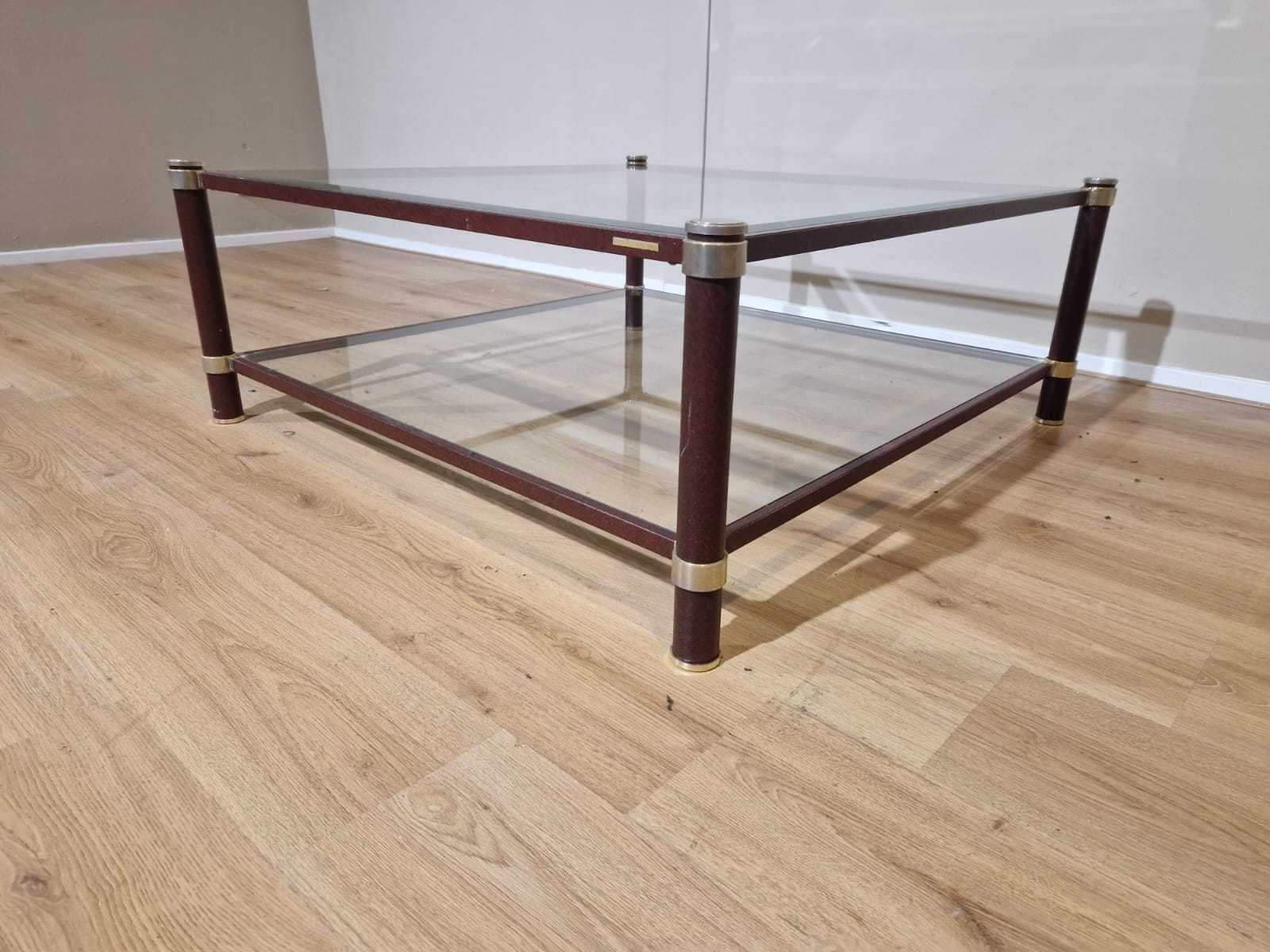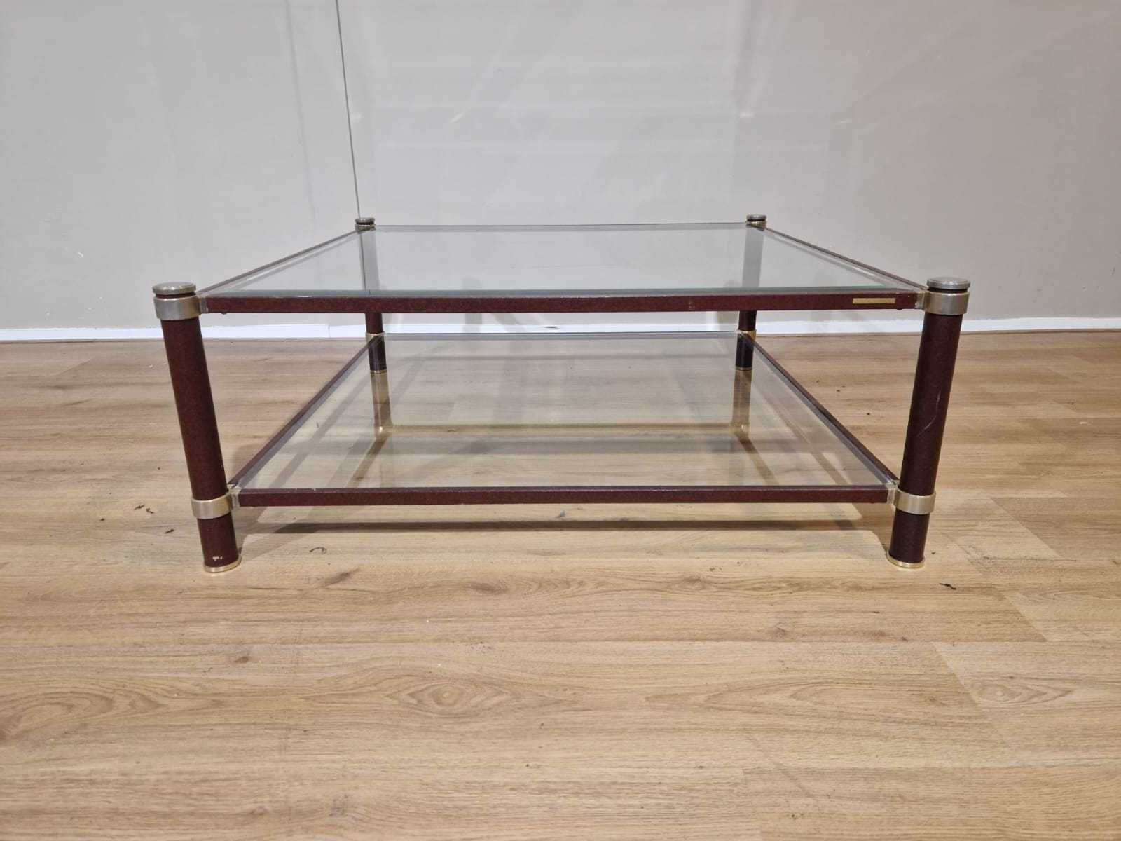 Merk: Pierre Vandel Model: Vintage Product type: Salontafel Vorm: Vierkant Kleur: Bruin Gewicht: 20kg Lengte: 90cm Breedte: 90cm Hoogte: 35cm Materiaal: Glas - Metaal