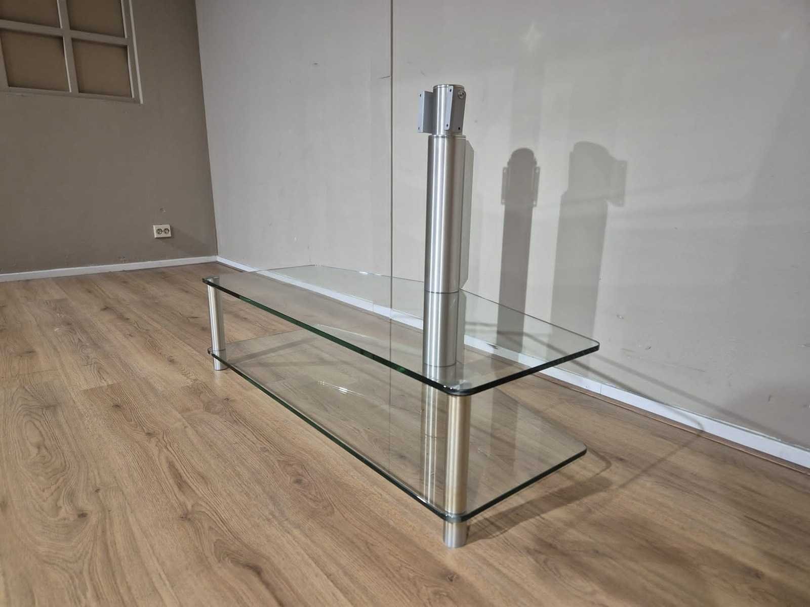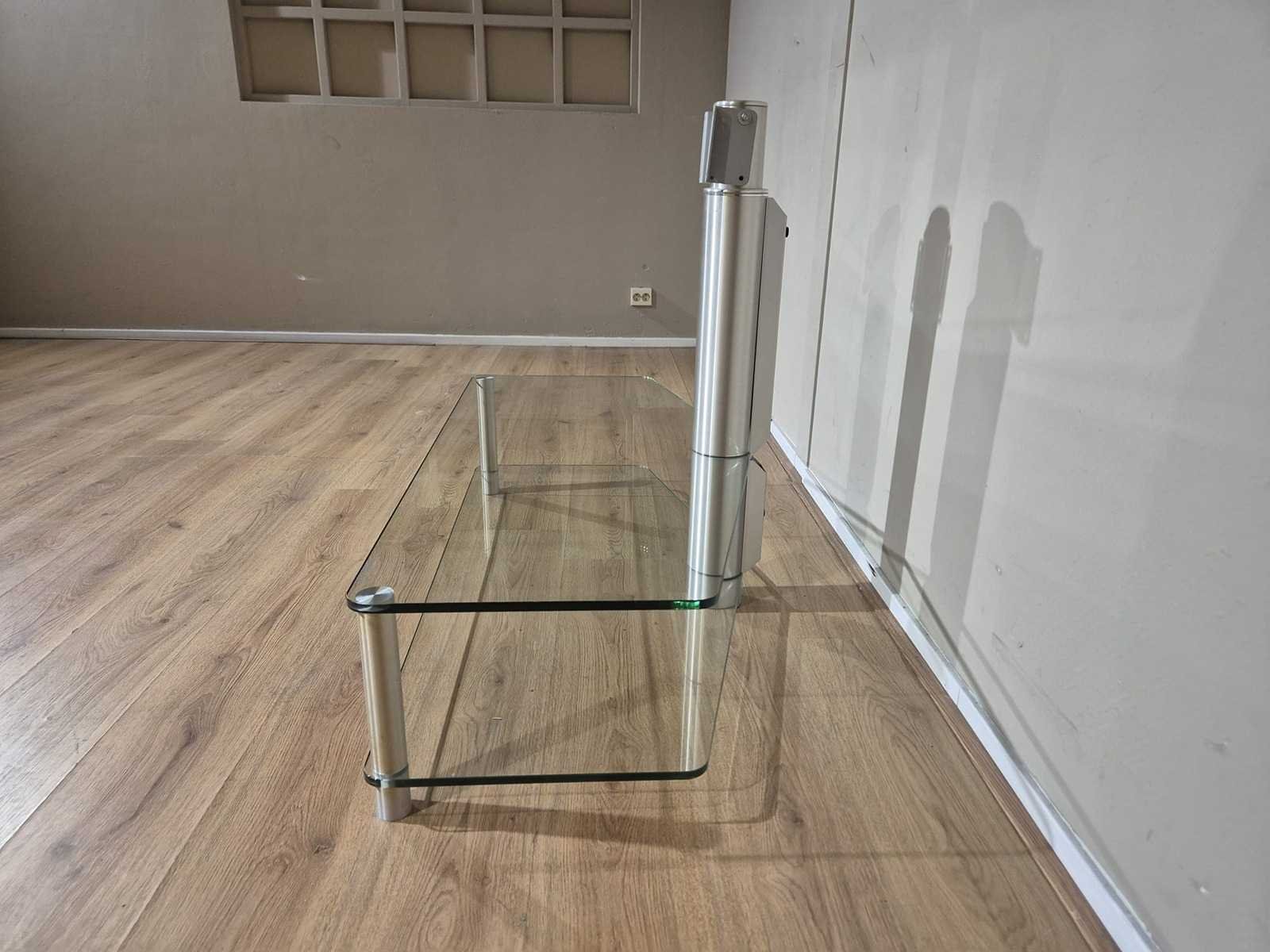 Merk: Spectral Model: Glazen Product type: TV Meubel Kleur: Zilver Gewicht: 40kg Lengte: 110cm Breedte: 56cm Hoogte: 82cm Materiaal: Glas