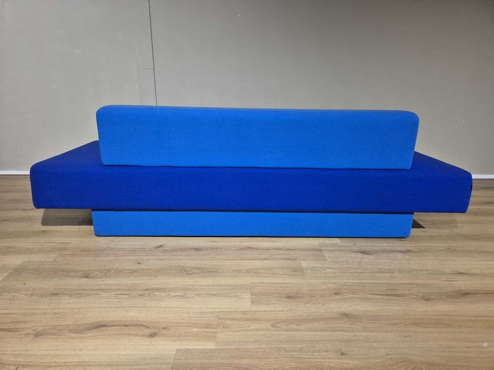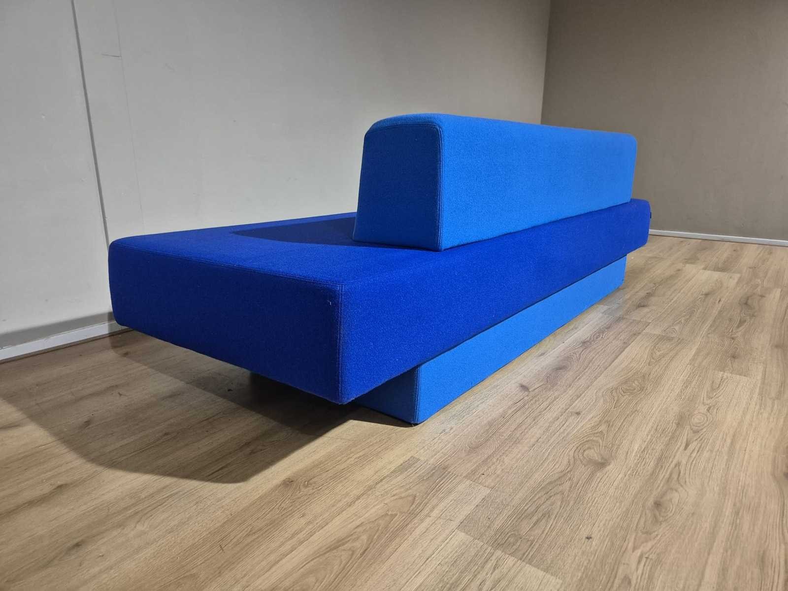Verstelbare rugleuning. Merk: Lensvelt Model: Glyder Product type: Atelier van Lieshout Bank Kleur: Blauw Gewicht: 80kg Lengte: 240cm Breedte: 85cm Hoogte: 73cm Zithoogte: 42cm Diepte: 54cm Materiaal: Wolstof