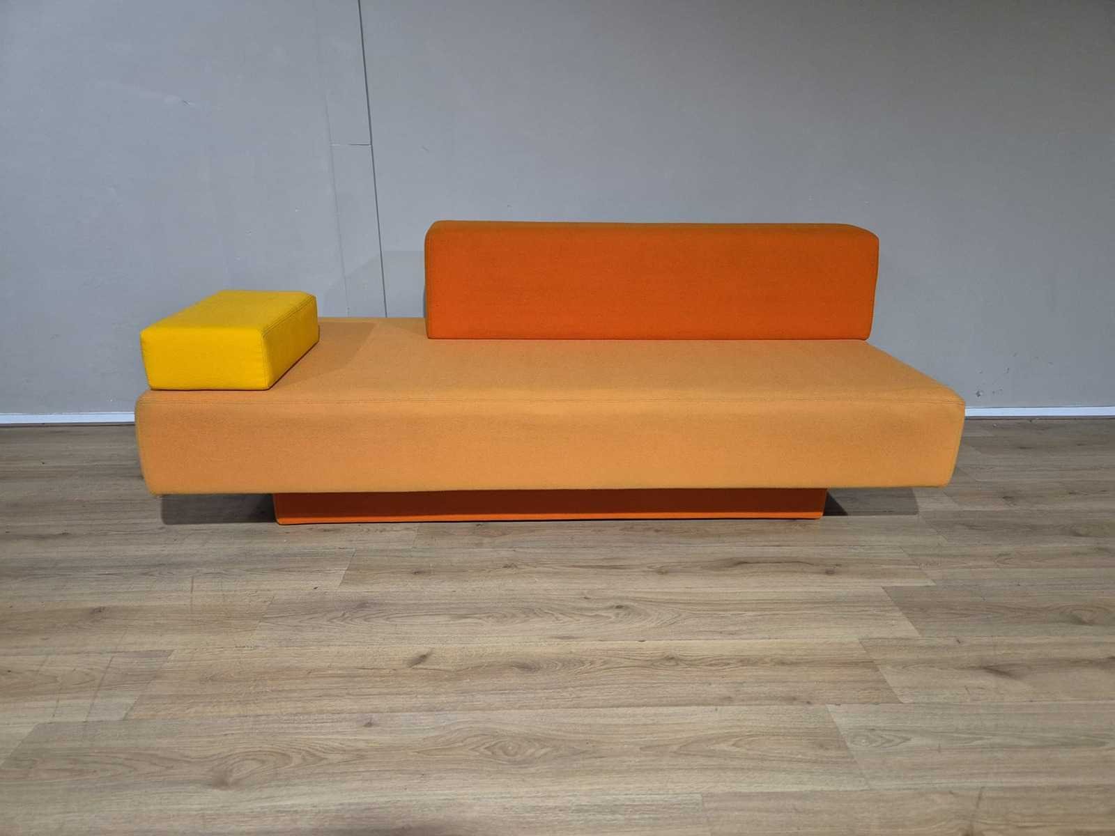 Verstelbare rugleuning. Merk: Lensvelt Model: Glyder Product type: Atelier van Lieshout Bank Kleur: Oranje Gewicht: 80kg Lengte: 190cm Breedte: 90cm Hoogte: 72cm Zithoogte: 41cm Diepte: 54cm Materiaal: Wolstof