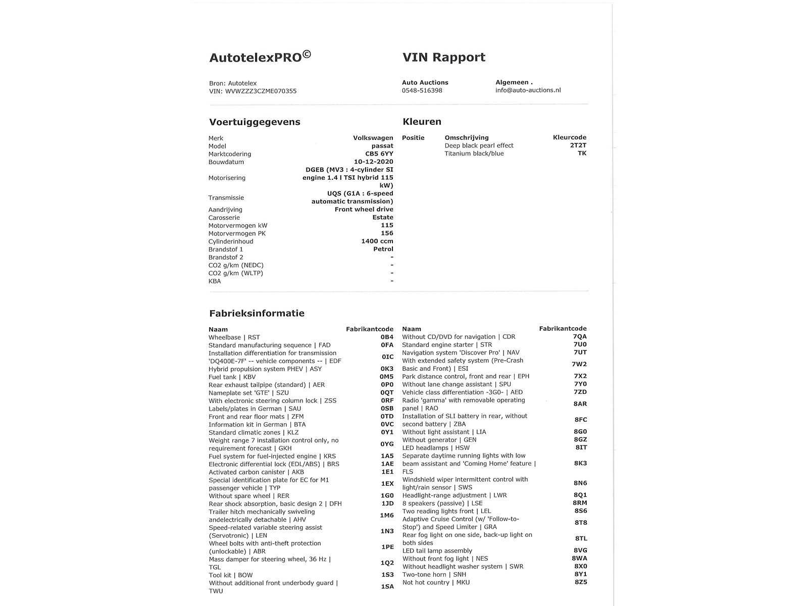 Duitse kenteken papieren. Indien gewenst kunnen wij het gehele import proces voor u verzorgen, RDW invoer, BPM taxatie, Douane afwikkeling, stalling etc. Voor deze auto zijn de totale invoerkosten inclusief de BPM €1.195.- Dus voor €1.195.- boven op uw aankoopprijs verzorgen wij het NL kenteken voor u. (This option is only for Dutch buyers) Voor vragen kunt u mailen naar info@auto-auctions.nl Kenteken: Duitse kenteken papieren Merk: Volkswagen Model: Passat Type: Variant GTE 1.4 TSI PHEV Afgelezen kilometerstand: 159777km Cilinderinhoud: 1395cc Vermogen (kW): 160kW Brandstof: Hybride Benzine Chassisnummer: WVWZZZ3CZME070355 Datum eerste toelating: 28-12-2020 Vermogen (pk): 218hp Aantal zitplaatsen: 5 Kleur: Deep Black Pearlescent Transmissie: Automaat Aantal deuren: 5 Aantal sleutels: 2 Aantal cilinders: 4 Carrosserie: Stationwagen Nationaliteit documenten: Duitse kenteken papieren Onderhoudshistorie: Digitaal volledig aanwezig Start en rijdt: Ja oplaadkabel : Aanwezig