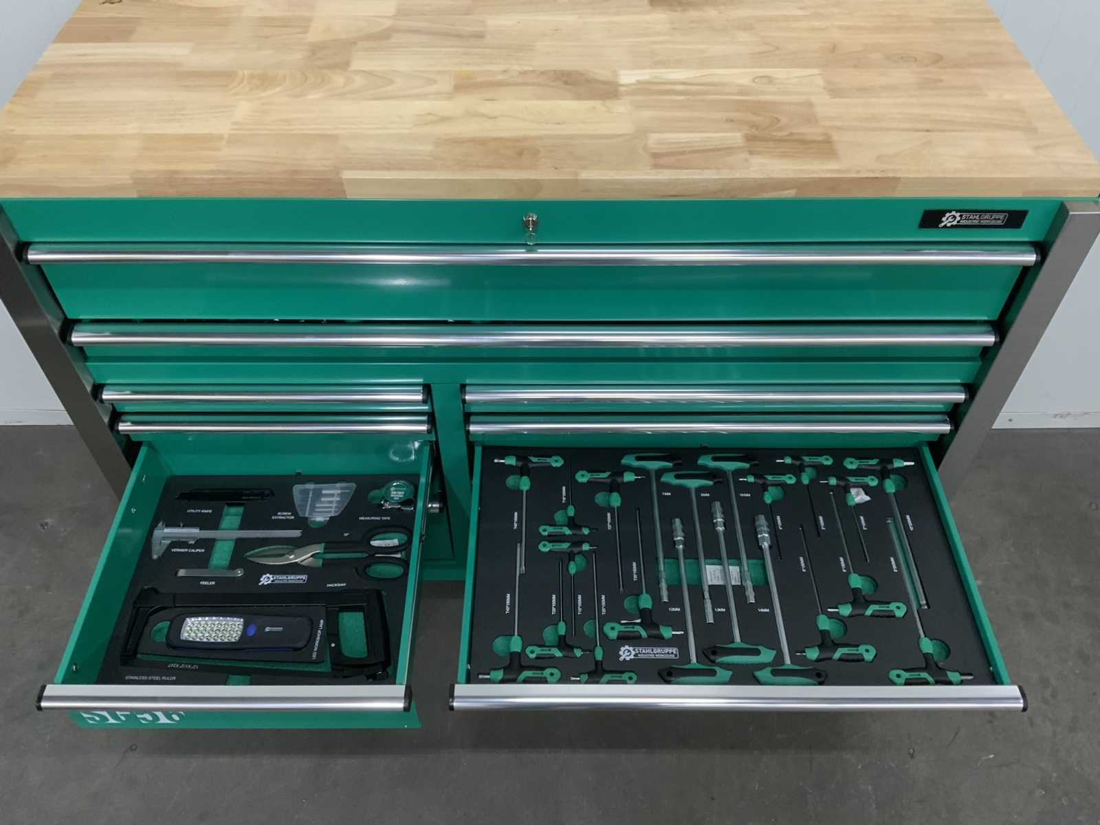 4 zwenkwielen, 11 laden, 9 gevuld, 386 pcs. Heavy Duty gereedschapswagen gebruik: voor professionals gereedschap: chroom-vanadium gereedschap inhoud: 29-delige ring-steeksleutel set (6 mm - 50 mm) rattelset en doppenset tot en met maat 50 3 ratelsleutel sets met doppen & bitsen (1/4”, 3/8” & 1/2”) 11-delige ring-ringsleutel set (6*7 mm - 30*32 mm) verstelbanre moersleutel 12-delige tangen set 2 hamers & 4 vijlen puntslag en beitel set 12 schroevendraaiers inbussleutels, Torxsleutels, precisiegereedschap 21-delige T-sleutelset 34-delige krachtdoppen set (12 mm - 50 mm) + Torx & inbus doppen & ratelsleutel 3/4,” LED-lamp, zaag, schaar, mes, meetgereedschappen enzovoort... in de originele verpakking Ongebruikt Merk: Stahlgruppe Type: Jumbo xxl prof + 4 in 1 set Bouwjaar: 2025 Aantal laden: 11 Met inhoud: true Eigen gewicht: 201kg Totale afmeting L: 1370mm Totale afmeting Breedte: 520mm Totale afmeting Hoogte: 1110mm