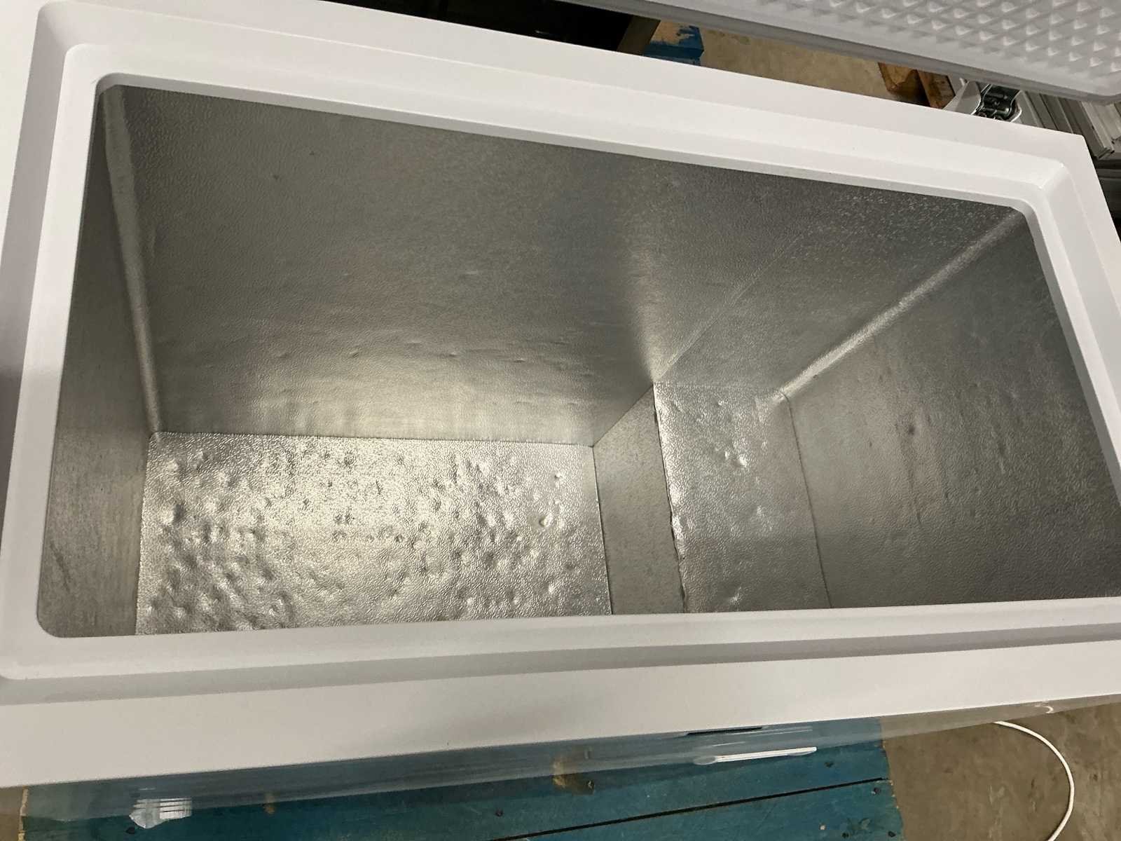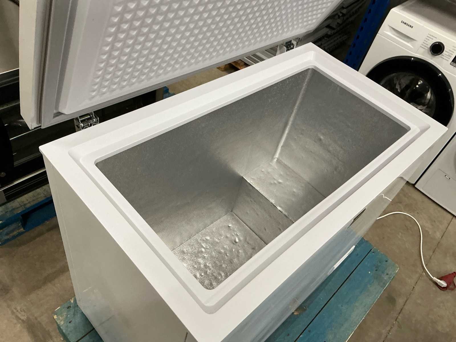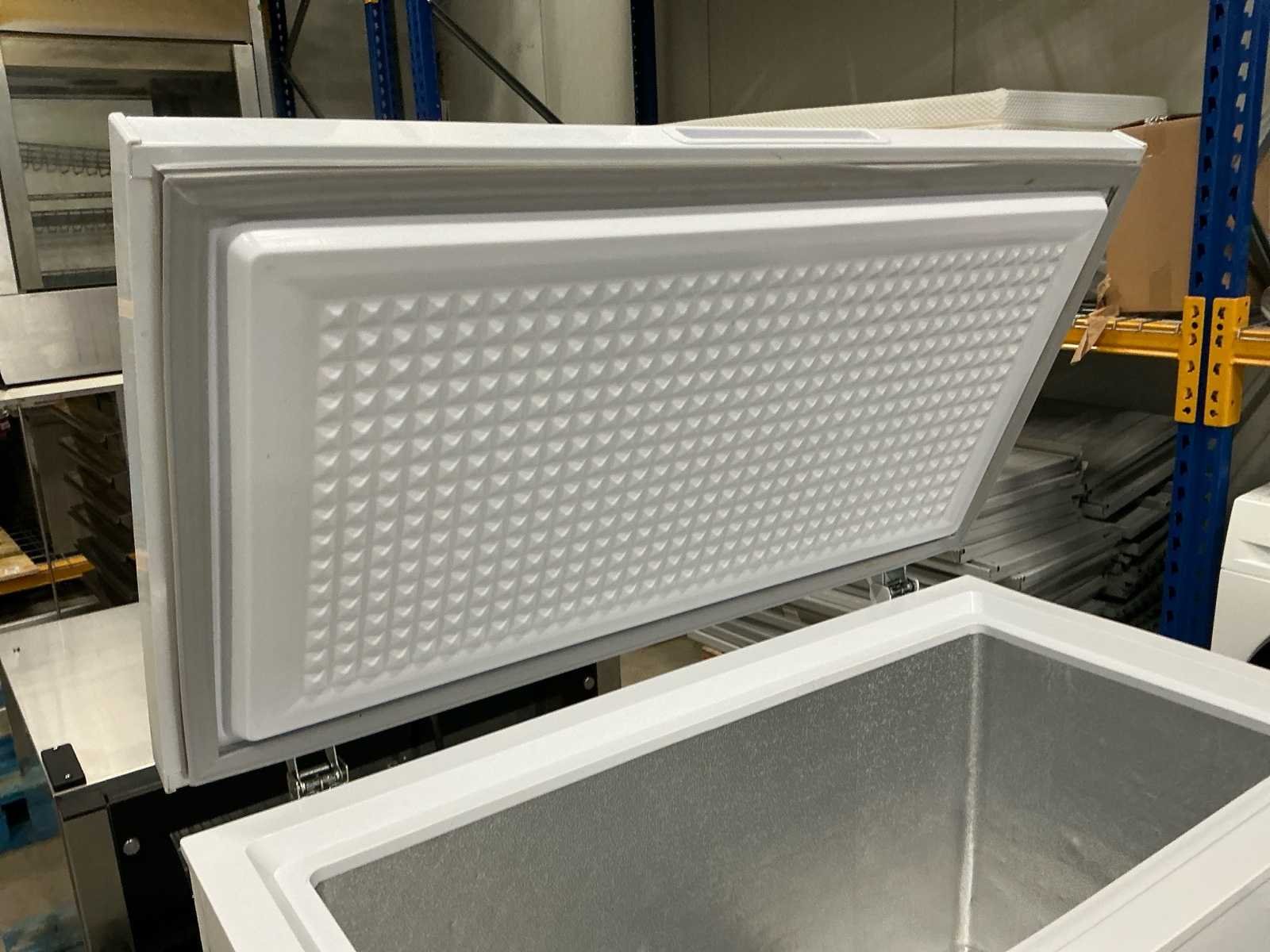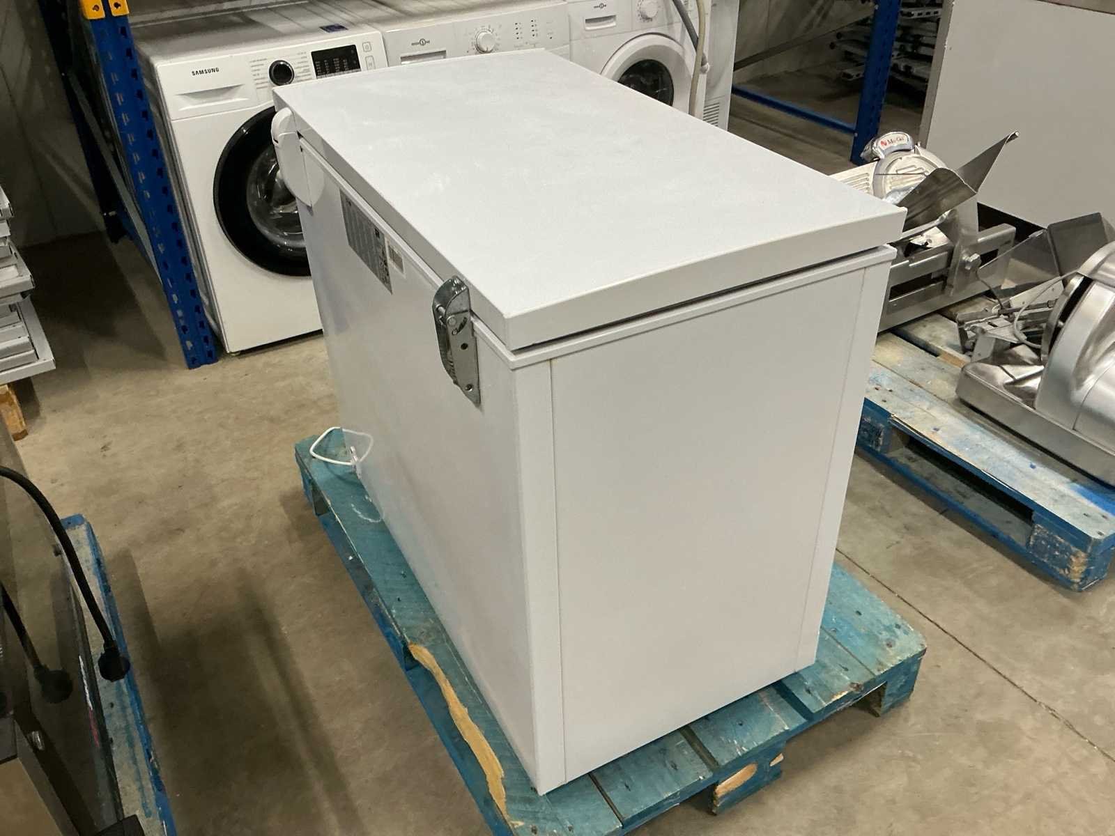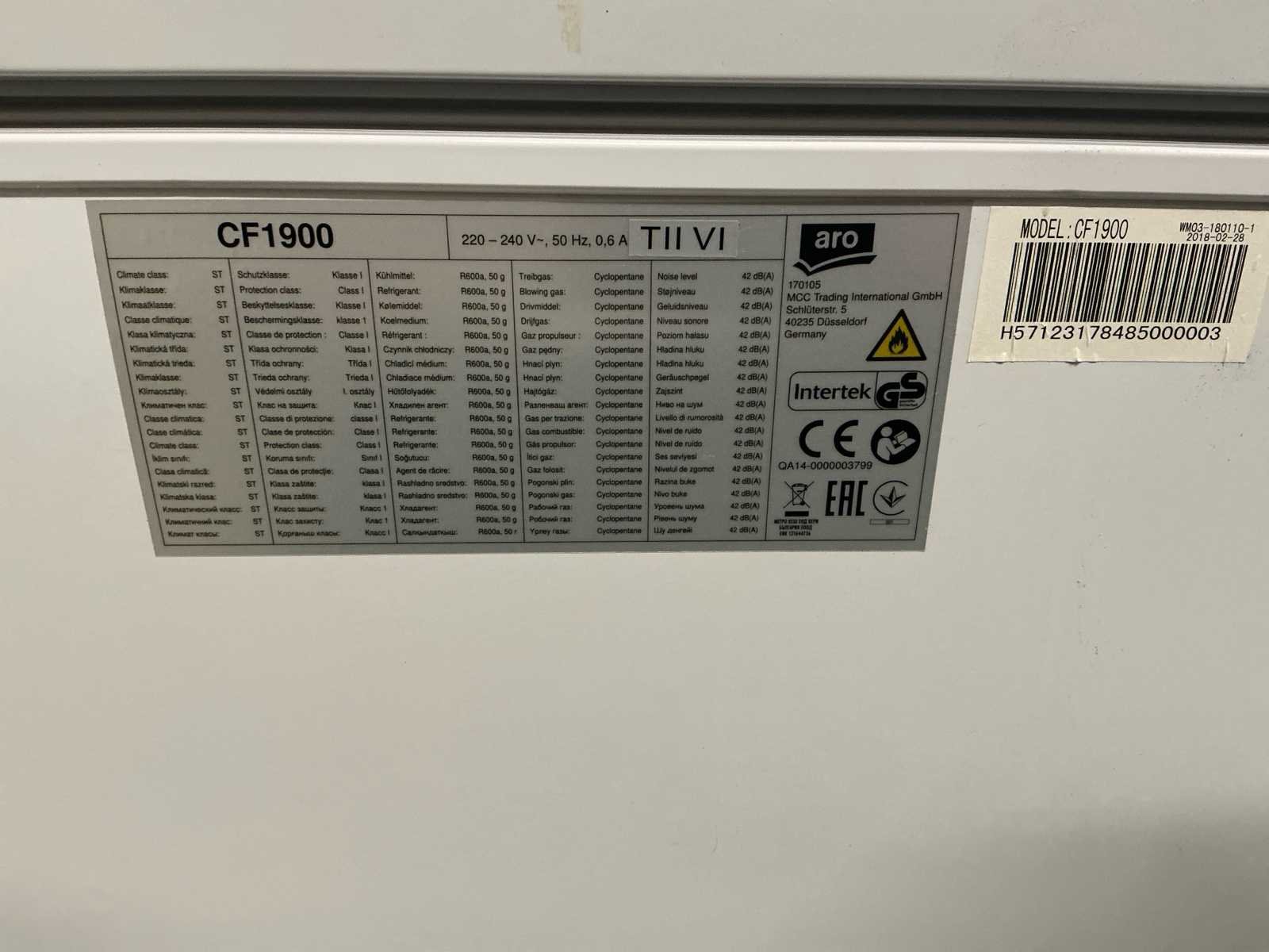 Voorzien van: De Aro CF1900 is een professionele vrieskist met een voedingsspanning van 220–240V, frequentie van 50Hz, stroomverbruik van 0,6A, geschikt voor ST-klimaatklasse (tot 38°C), voorzien van beschermingsklasse I, gebruikmakend van R600a-koelmiddel (50g isobutaan) en cyclopentaanisolatie, met een geluidsniveau van 42dB, energieklasse TII VI, CE-, GS-, Intertek- en EAC-certificering, geproduceerd op 28 februari 2018 door MCG Trading International GmbH in Duitsland.. Merk: Aro Type: CF Model: 1900 Totale afmeting L: 560mm Totale afmeting Breedte: 950mm Totale afmeting Hoogte: 850mm Serienummer: H57123178485000003 Aansluiting: 230V