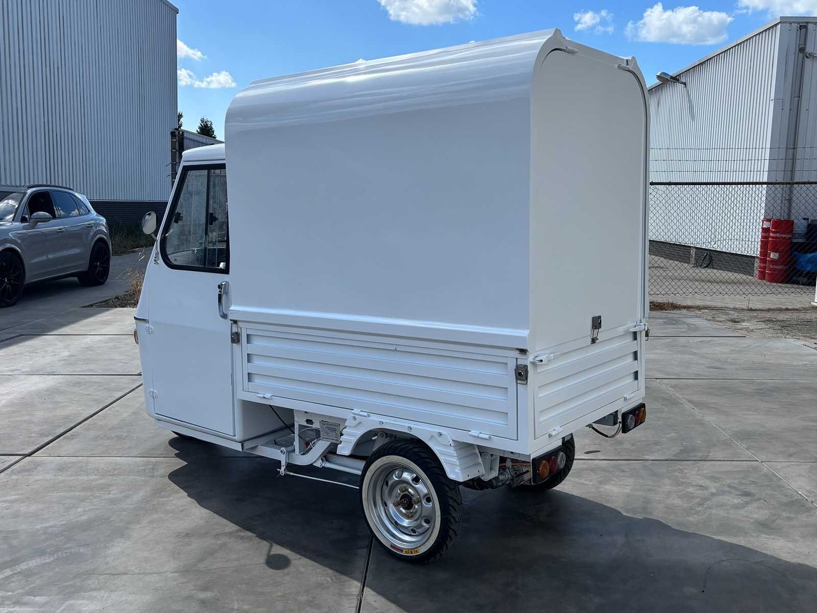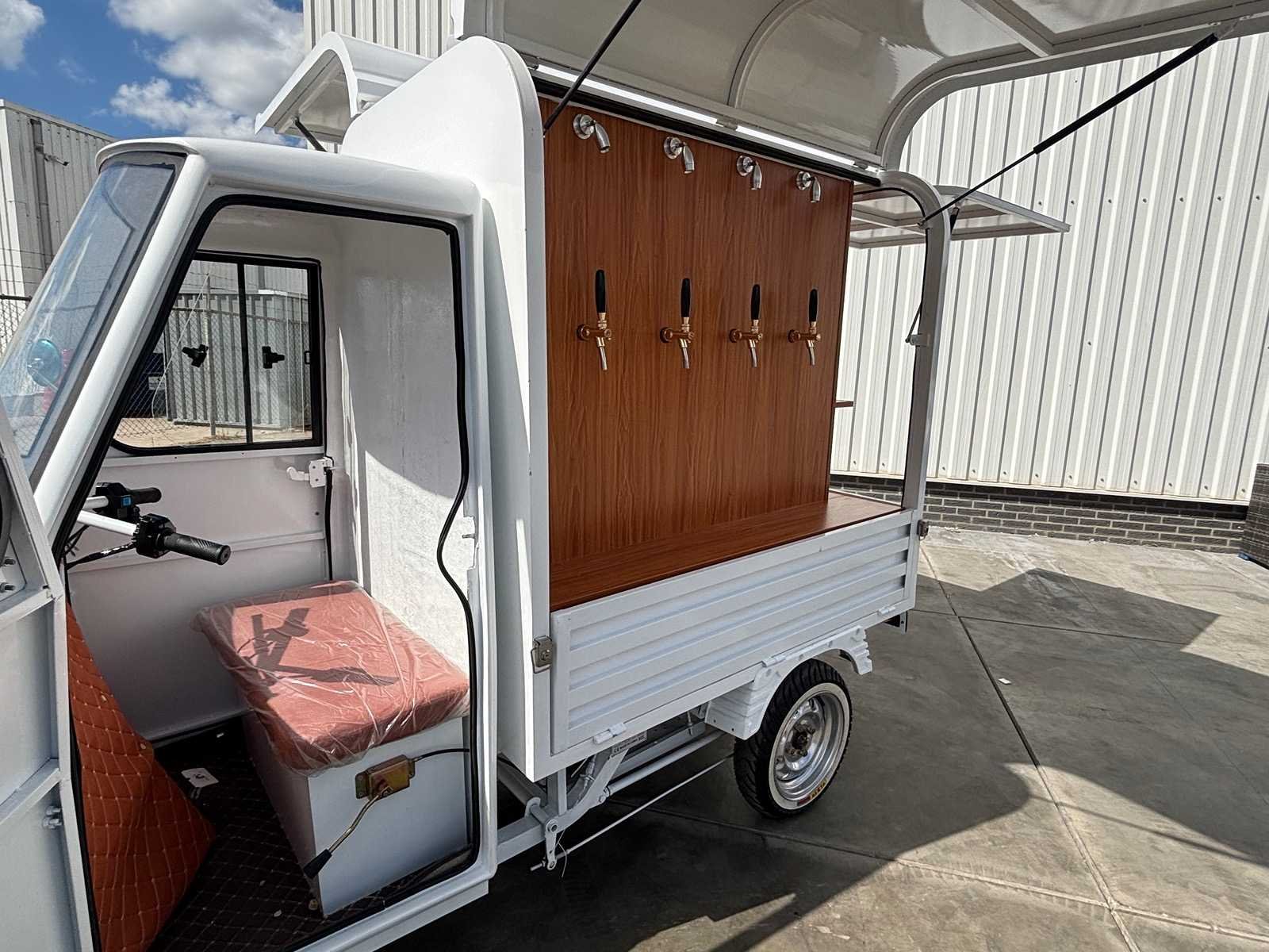 Piaggio APE (look) omgebouwd tot rijdende biertap Voorzien van tapinstallatie 4 drafts Mogelijkheid tot 4 biervaten in koelinstallatie Electrisch aangedreven 50kmph (zonder kenteken) (NEW) Merk: Vespa Type: APE Model: Drafts Kleur: wit Bouwjaar: 2025 Datum eerste toelating: 2025 Lengte: 2800 Breedte: 1060 Hoogte: 1950