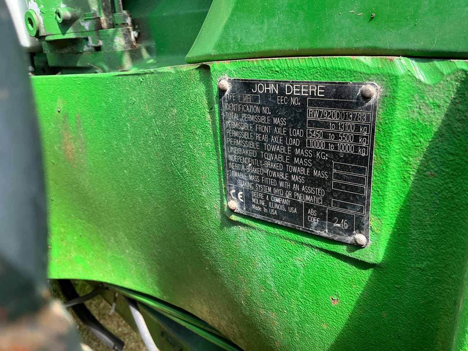 Voorzien van: toerental; 540/1000, 224pk, AC, verende vooras, Merk: John Deere Type: 7920 Bouwjaar: 2004 Motorvermogen (kW): 165kW Afgelezen urenstand: 12900 Versnellingsbaktype: cvt/vario/autopowr Aantal hydraulische ventielen achter: 3 Bandenmaat voor: 540/65R34 Bandenmaat achter: 710/70R42 Cabine: true Luchtgeveerde stoel: true Totale afmeting L: 5500mm Totale afmeting Breedte: 2640mm Totale afmeting Hoogte: 3400mm Kentekenpapieren compleet?: true Nationaliteit documenten: Duits