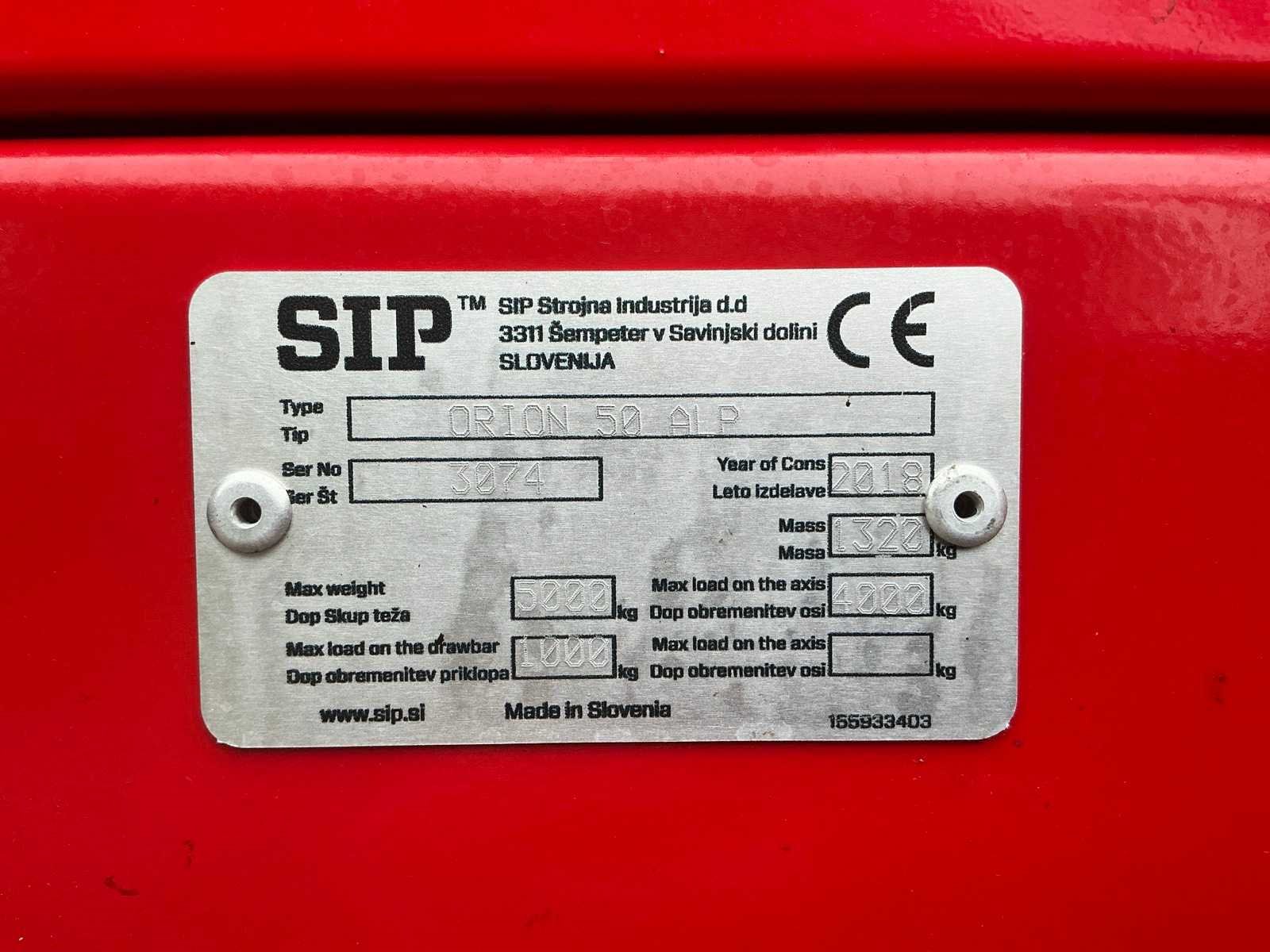 Bak: 330x170cm, voorste scherm kan verwijderd worden voor transport. Boekjes aanwezig. Merk: SIP Type: Orion 50 ALP Bouwjaar: 2018 Serienummer: 3074 Werkbreedte: 5000mm Eigen gewicht: 1320kg Totale afmeting L: 4800mm Totale afmeting Breedte: 2500mm Totale afmeting Hoogte: 1900mm