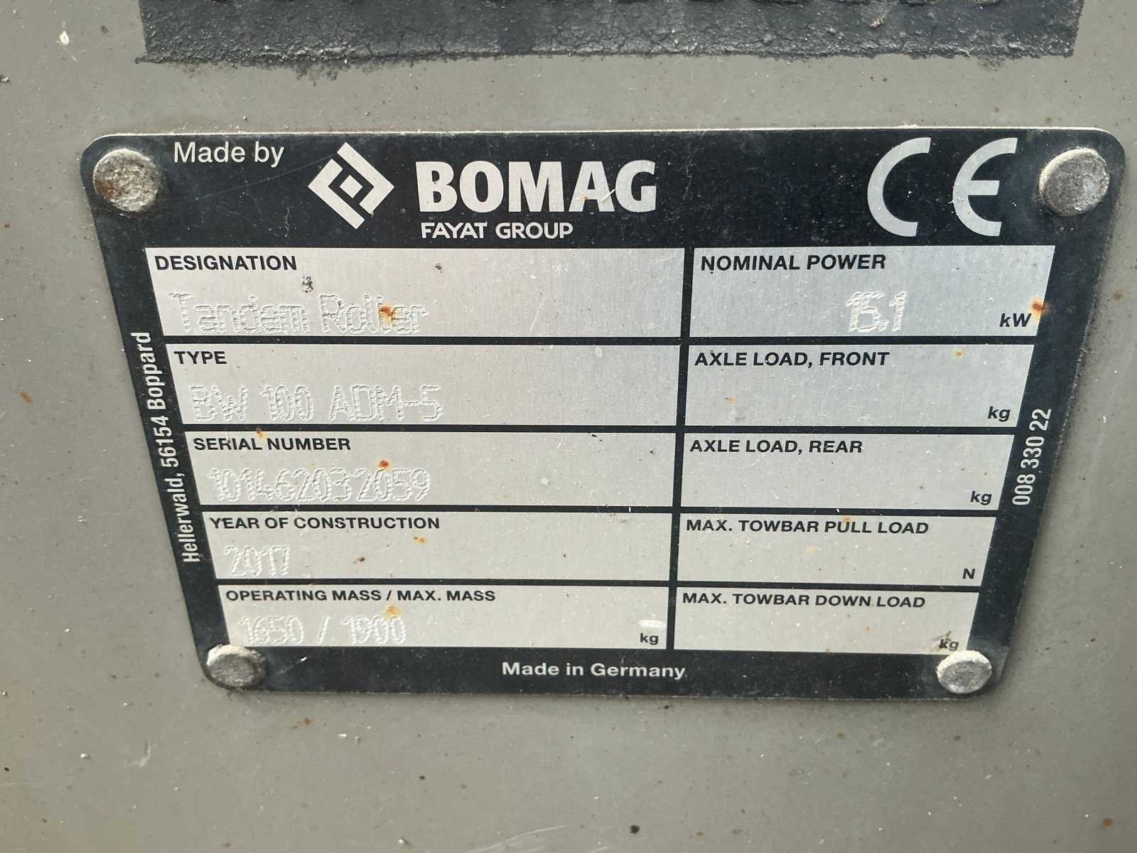 Urenstand niet leesbaar, volgens opgave circa 3200. Merk: Bomag Model: BW 100 ADM-5 Bouwjaar: 2017 Serienummer: 101462032059 Bedrijfsgewicht: 1900kg Merk motor: Kubota Motorvermogen (kW): 15.1kW Aantal cilinders: 3 Trommeldiameter: 570mm Werkbreedte: 1000mm Eigen gewicht: 1650kg Totale afmeting L: 2200mm Totale afmeting Breedte: 1100mm Totale afmeting Hoogte: 1630mm