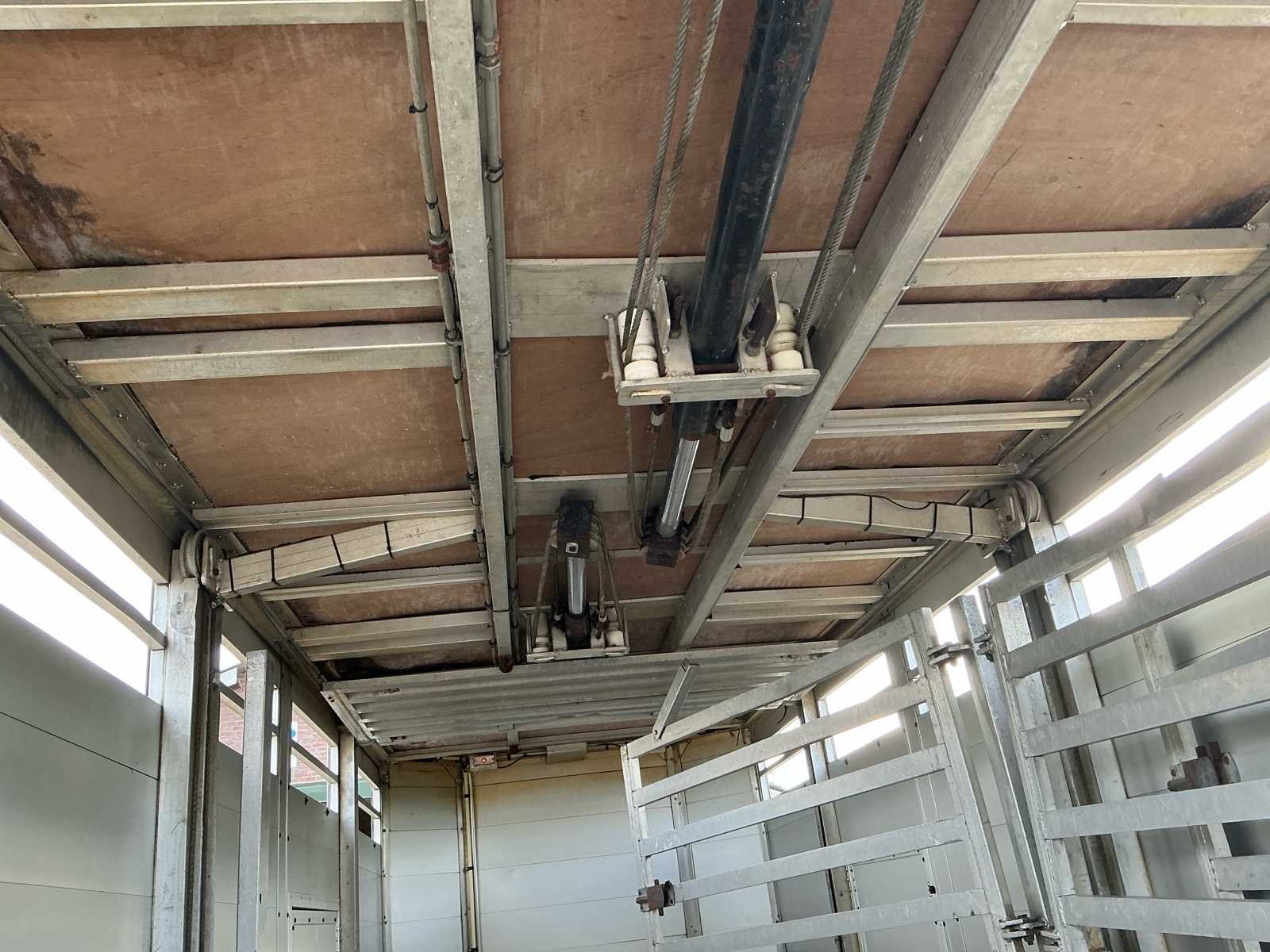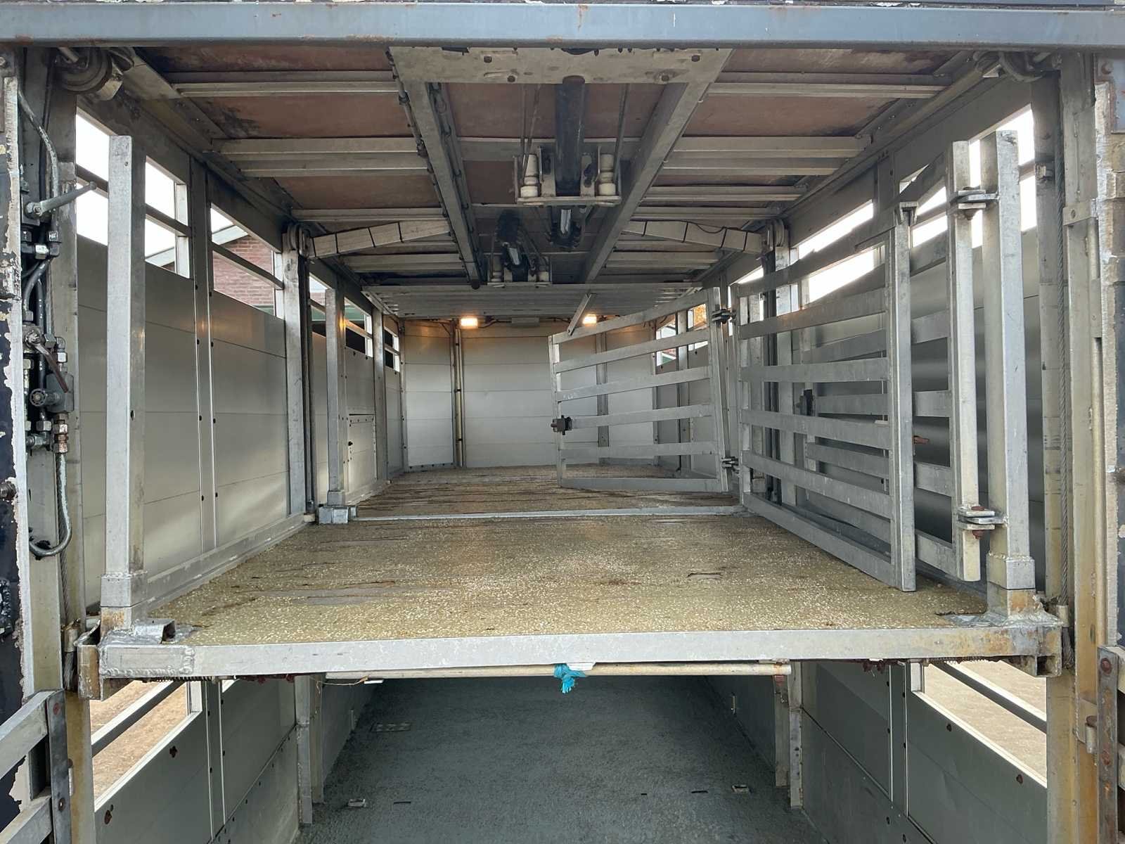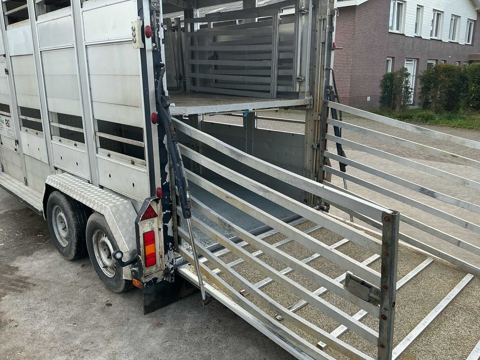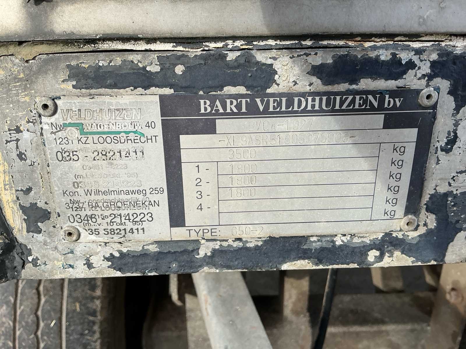 Voorzien van: Dubbele (hydraulisch) verstelbare bodem, chass nr: XL9ASR51805070008, 3 assen 1800kg as last per stuk, Volledig aluminium op gegalvaniseerd chassis, De Bart Veldhuizen G50-2 veeaanhangwagen is een tandemas aluminium veetrailer met een toelaatbaar totaalgewicht van 3.500 kg, leeggewicht circa 1.700 kg, laadvermogen circa 1.800 kg, voorzien van geventileerde zijwanden, hydraulische laadklep en oplooprem, trommelremmem rondom, Merk: Bart Veldhuizen B.V. Type: G50-2 Bouwjaar: 1995 Serienummer: BVCA-1027/XL9ASR51805070008 Kenteken: WN-13-ZY Afm. binnenzijde l.: 5200mm Afm. binnenzijde b: 1800mm Afm. binnenzijde h: 2100mm Eigen gewicht: 1700kg Totale afmeting L: 6200mm Totale afmeting Breedte: 2300mm Totale afmeting Hoogte: 2600mm