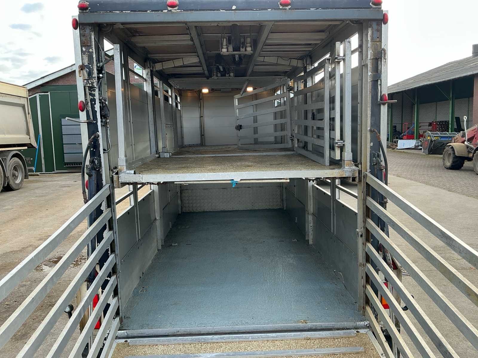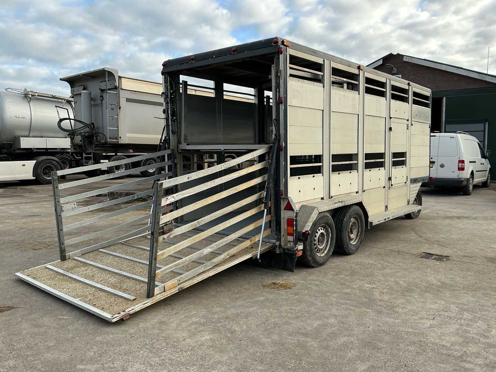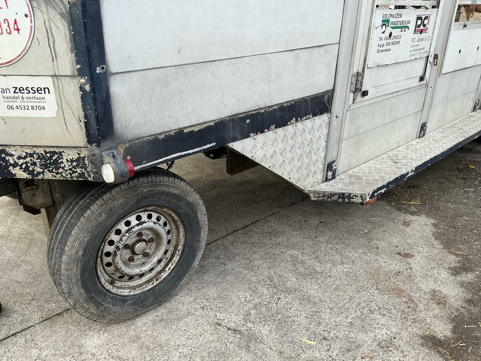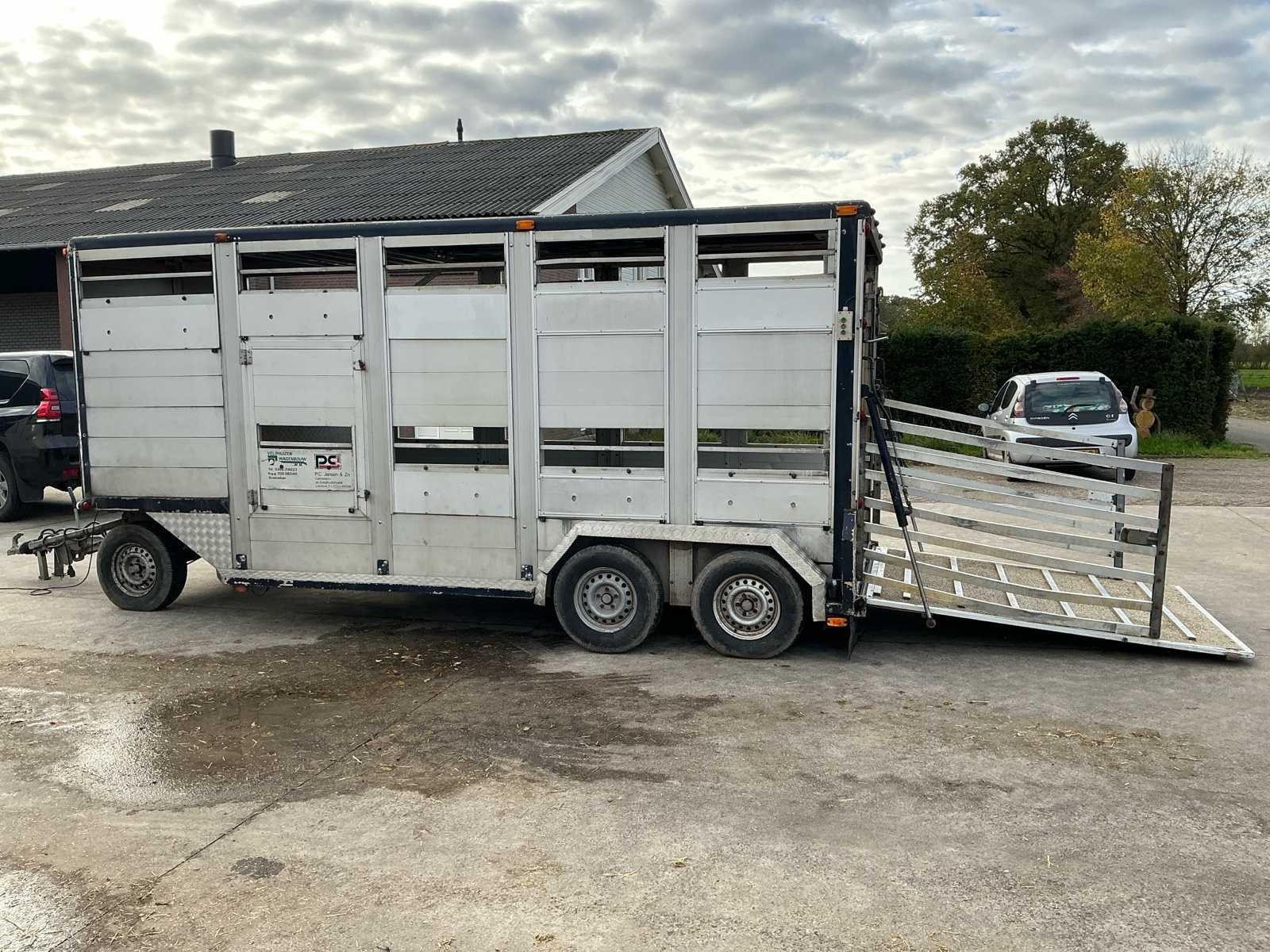 Voorzien van: Dubbele (hydraulisch) verstelbare bodem, chass nr: XL9ASR51805070008, 3 assen 1800kg as last per stuk, Volledig aluminium op gegalvaniseerd chassis, De Bart Veldhuizen G50-2 veeaanhangwagen is een tandemas aluminium veetrailer met een toelaatbaar totaalgewicht van 3.500 kg, leeggewicht circa 1.700 kg, laadvermogen circa 1.800 kg, voorzien van geventileerde zijwanden, hydraulische laadklep en oplooprem, trommelremmem rondom, Merk: Bart Veldhuizen B.V. Type: G50-2 Bouwjaar: 1995 Serienummer: BVCA-1027/XL9ASR51805070008 Kenteken: WN-13-ZY Afm. binnenzijde l.: 5200mm Afm. binnenzijde b: 1800mm Afm. binnenzijde h: 2100mm Eigen gewicht: 1700kg Totale afmeting L: 6200mm Totale afmeting Breedte: 2300mm Totale afmeting Hoogte: 2600mm