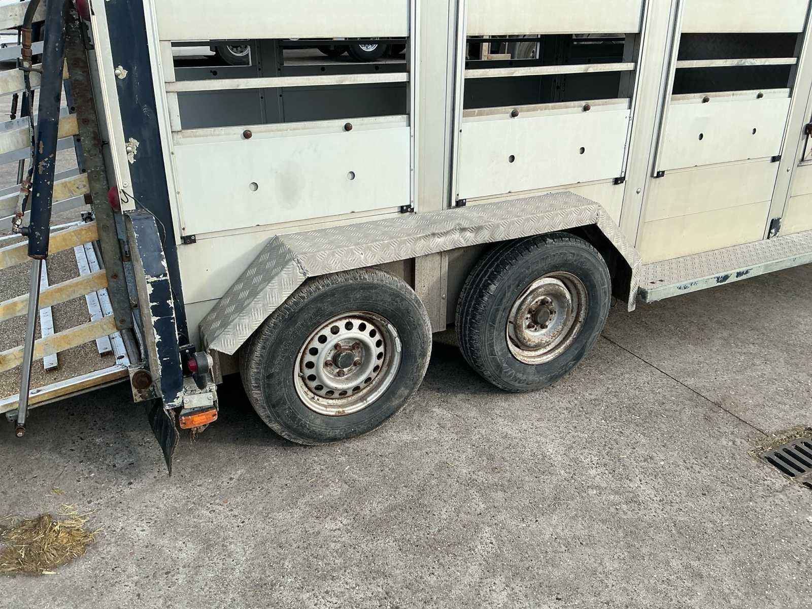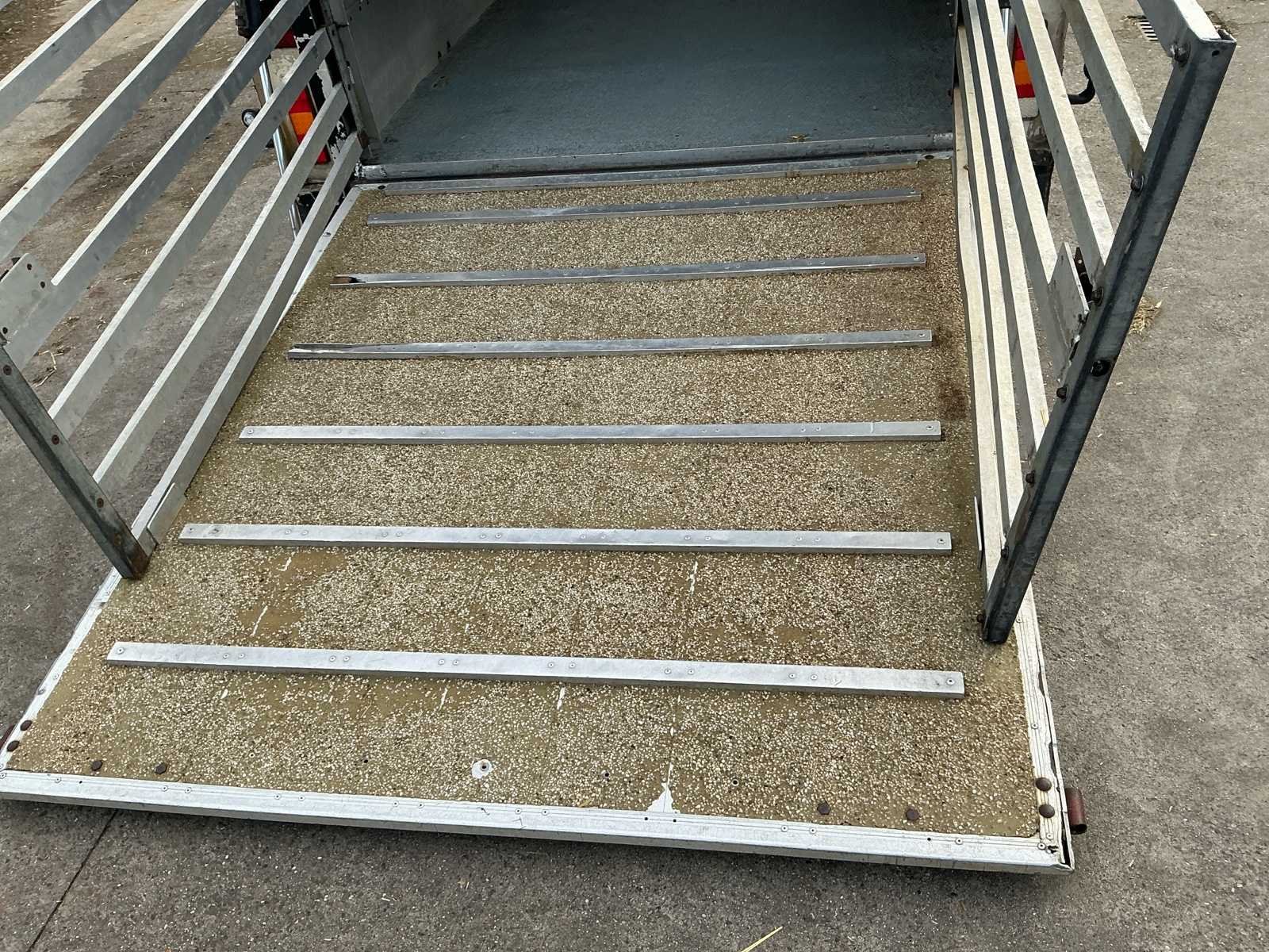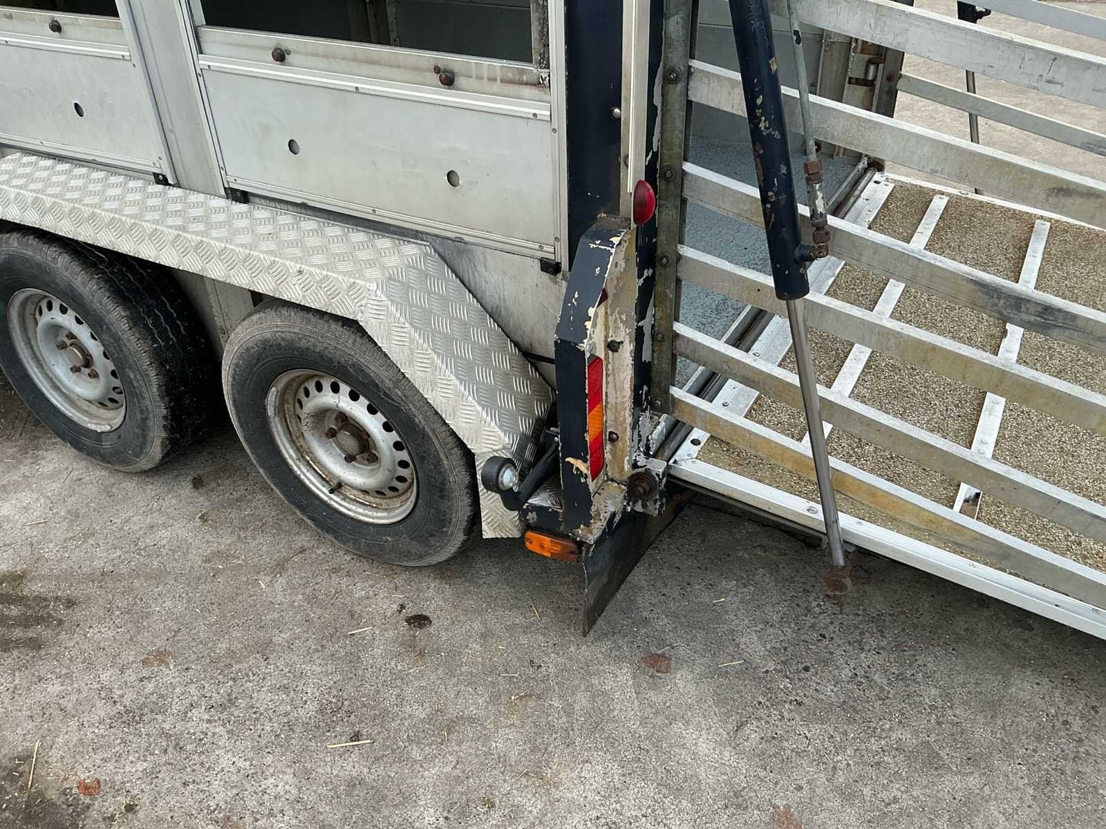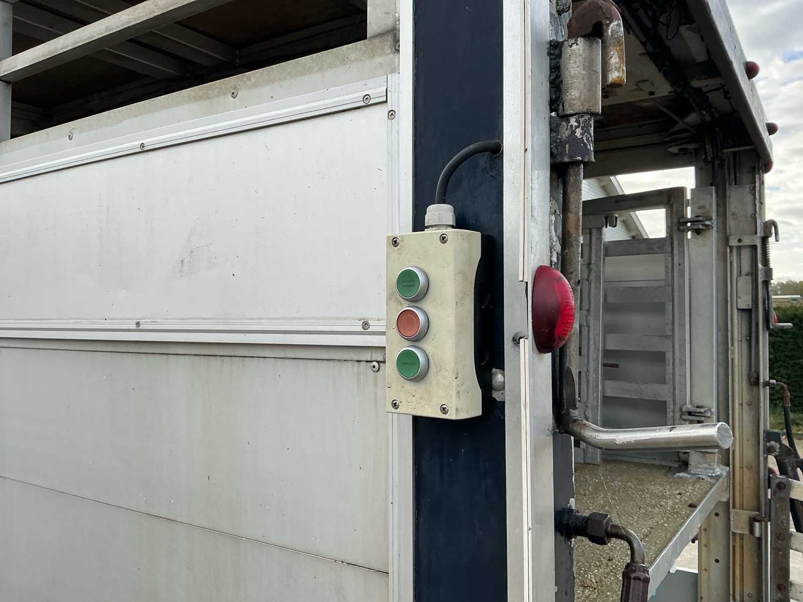 Voorzien van: Dubbele (hydraulisch) verstelbare bodem, chass nr: XL9ASR51805070008, 3 assen 1800kg as last per stuk, Volledig aluminium op gegalvaniseerd chassis, De Bart Veldhuizen G50-2 veeaanhangwagen is een tandemas aluminium veetrailer met een toelaatbaar totaalgewicht van 3.500 kg, leeggewicht circa 1.700 kg, laadvermogen circa 1.800 kg, voorzien van geventileerde zijwanden, hydraulische laadklep en oplooprem, trommelremmem rondom, Merk: Bart Veldhuizen B.V. Type: G50-2 Bouwjaar: 1995 Serienummer: BVCA-1027/XL9ASR51805070008 Kenteken: WN-13-ZY Afm. binnenzijde l.: 5200mm Afm. binnenzijde b: 1800mm Afm. binnenzijde h: 2100mm Eigen gewicht: 1700kg Totale afmeting L: 6200mm Totale afmeting Breedte: 2300mm Totale afmeting Hoogte: 2600mm