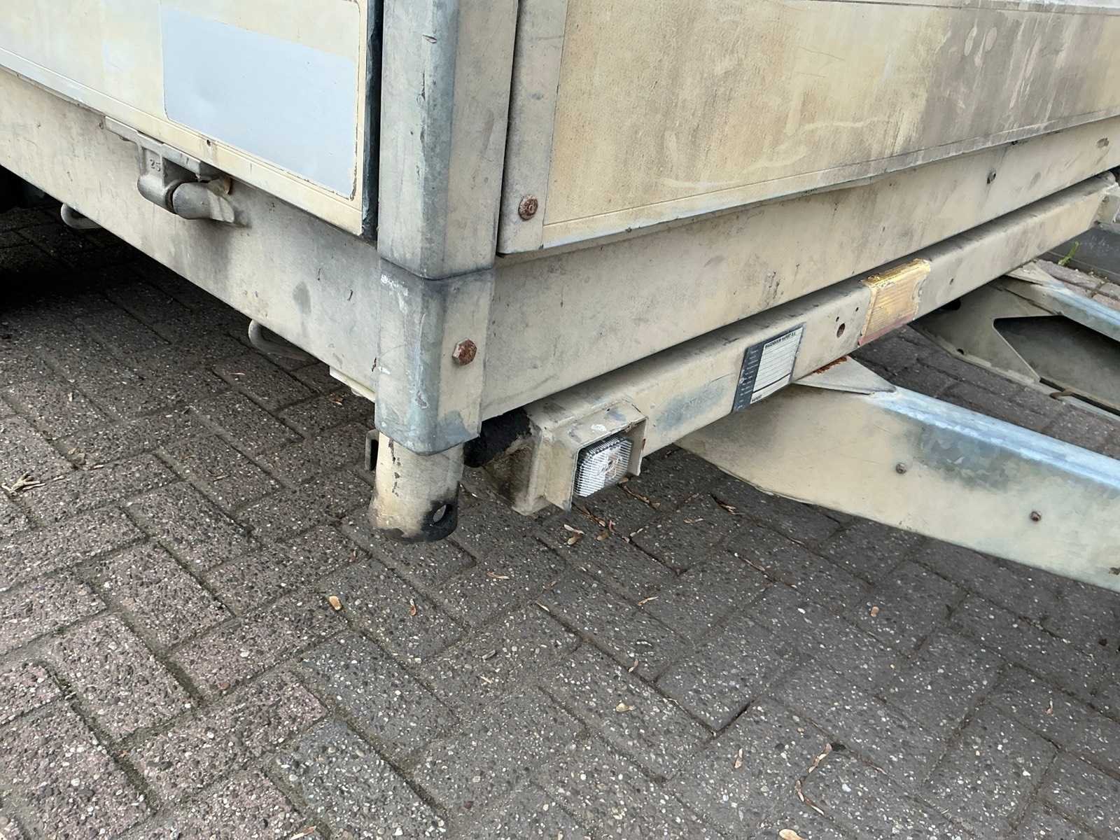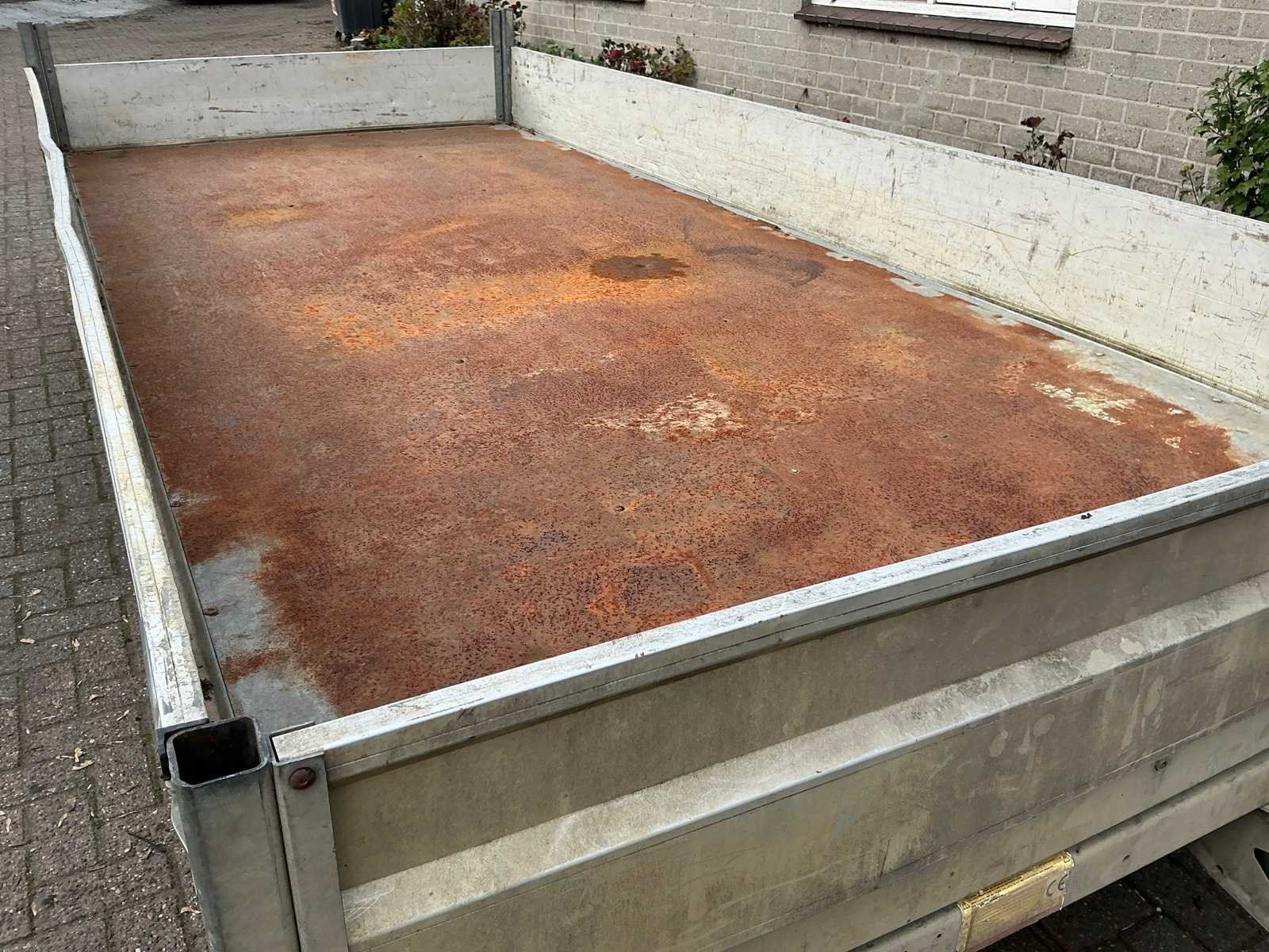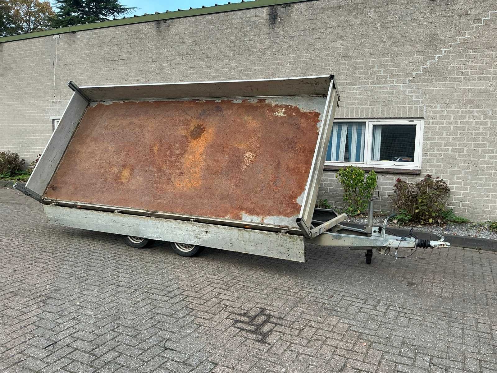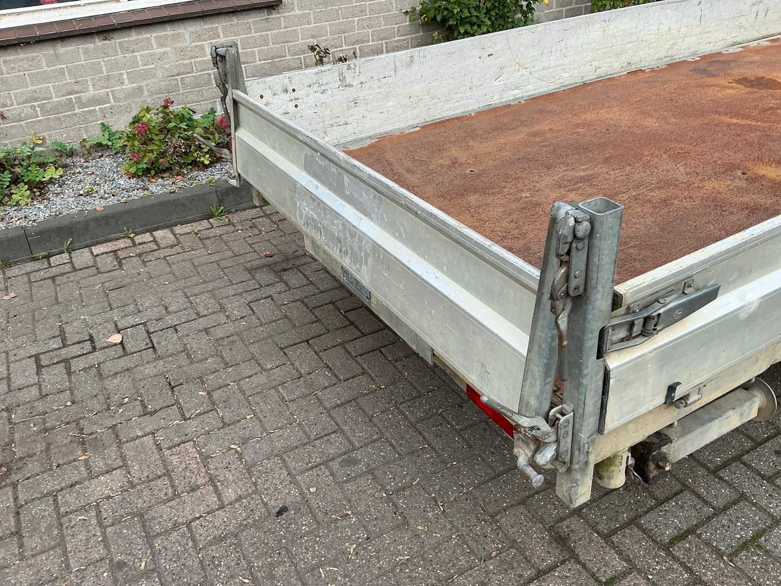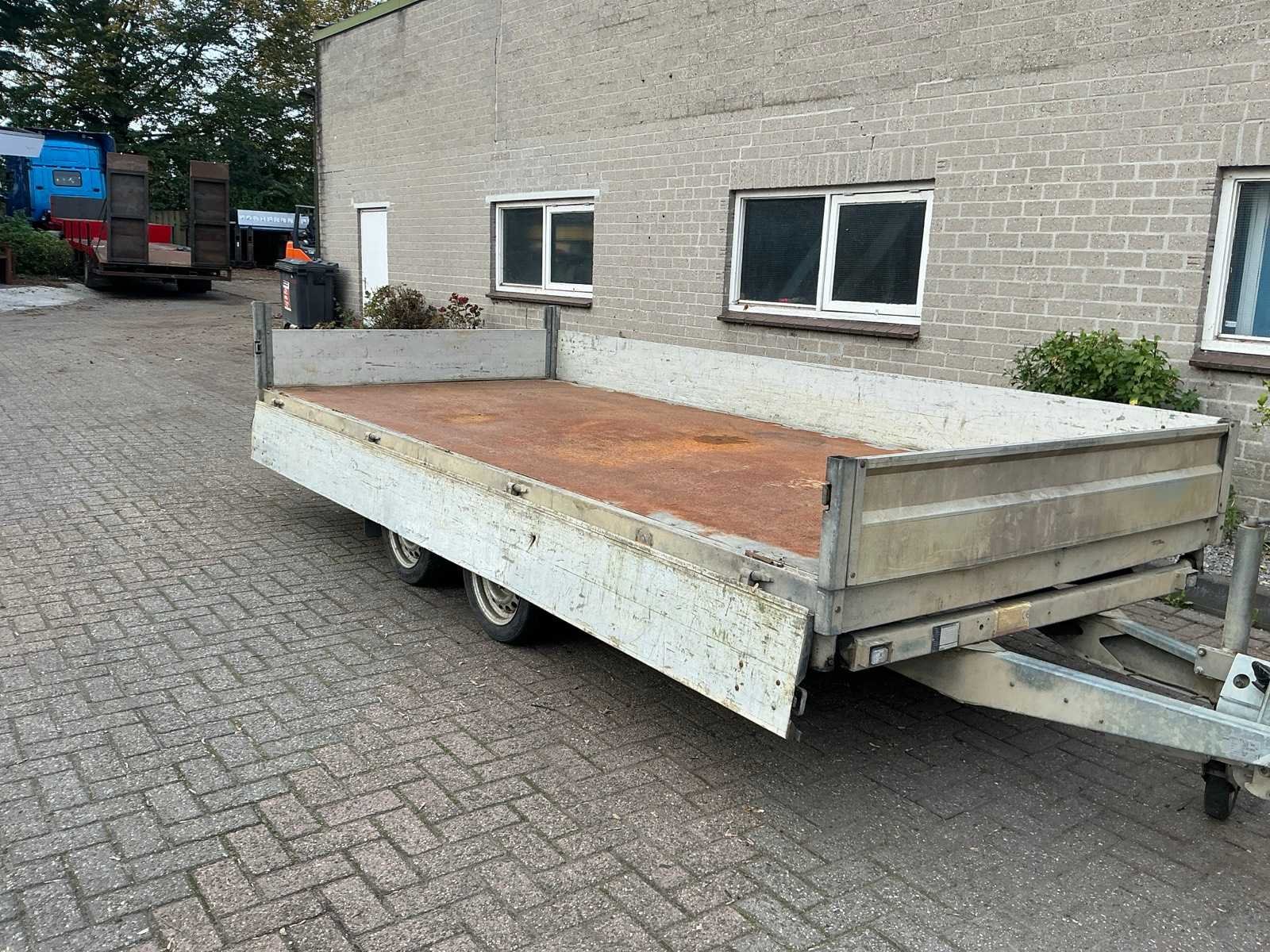 Voorzien van: steunpoten, neuswiel, aanhangwagenkoppeling met oplooprem, verlichting Merk: Hapert Type: E3502 Bouwjaar: 2007 Chassisnummer: XLHE3500000697651 Aantal assen: 2 Laadbak afmeting l: 404cm Laadbak afmeting b: 180cm Ledig gewicht: 1100kg Laadvermogen: 2400kg Kenteken: 88-WT-JD